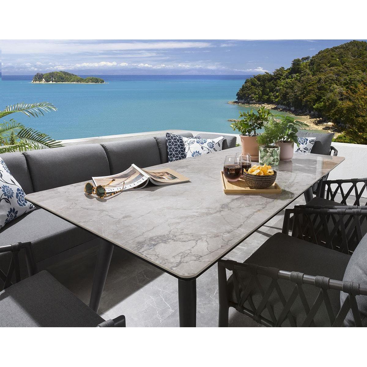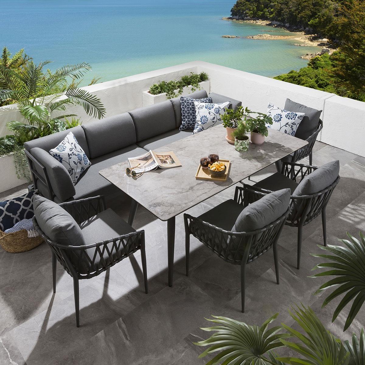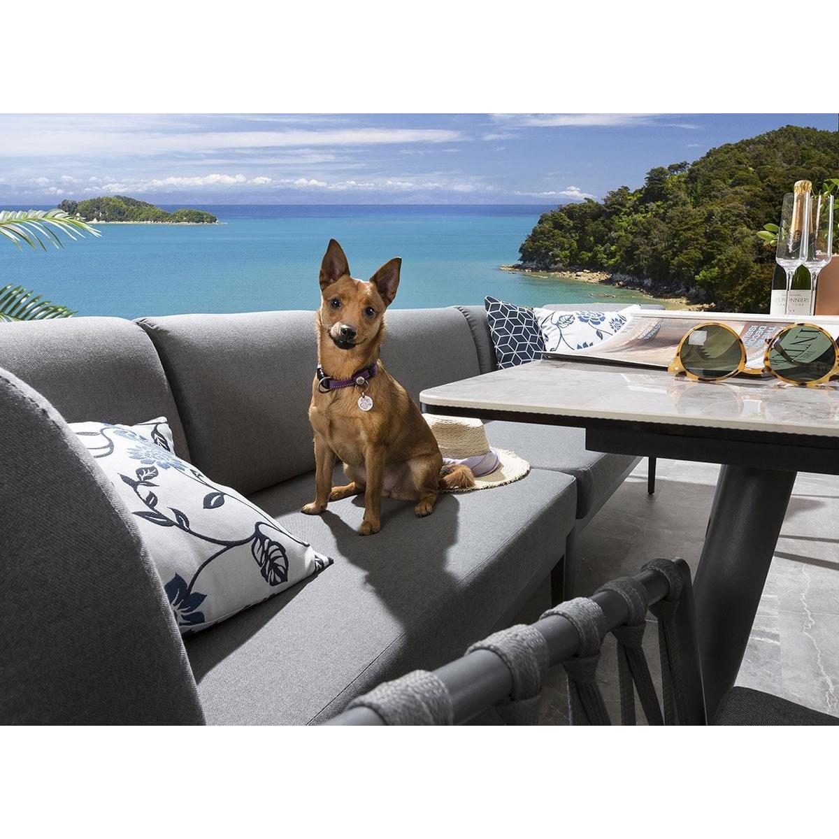 Our Ada Garden Dining Set includes 2 modular sofa sections in grey, 4 grey luxury dining chairs and a spacious 180cm x 90cm ceramic dining table with a timeless light grey marble-effect finish table top. Whatever the occasion, you'll find it incredibly difficult to resist your outdoors with the lure of this luxurious 8 seater garden table and chairs set. The Ada Modular Garden Sofa can be configured as a corner sofa, or straight sofa, depending on your space and requirements. The small garden corner sofa and dining chairs come complete with our signature luxuriously thick cushioning that offers unbeatable comfort, topped off with rich Grey high-end marine fabric which has amazing resilience to colour fading and damage caused by extreme weather conditions and also a free winter cover. The Ada Modern Dining Bench Set includes a premium ceramic top garden table. Ceramic stone is exceptionally hard wearing, plus its heat, scratch, and fade resistant. We usually reserve this material for our designer indoor dining tables, however, it is the perfect material for outdoor tables, as it is extremely durable. Expertly crafted aluminium frames are highly durable, complemented by clean lines that lend contemporary style. It is robust and weather-resistant for outdoor use & the firm-cushioned seating offers comfortable support that's shower-resistant, but we advise that cushions are stored when not in use. If you need more information about this product, use the Live Chat service to speak to the team or send us a message. Spread the cost our with interest-free finance options. Minimum spend applies. W250cm D230cm H81cm Ceramic glass durable table top Seats up to 8 people - 8-Seater Grey Garden Dining Table & Chairs