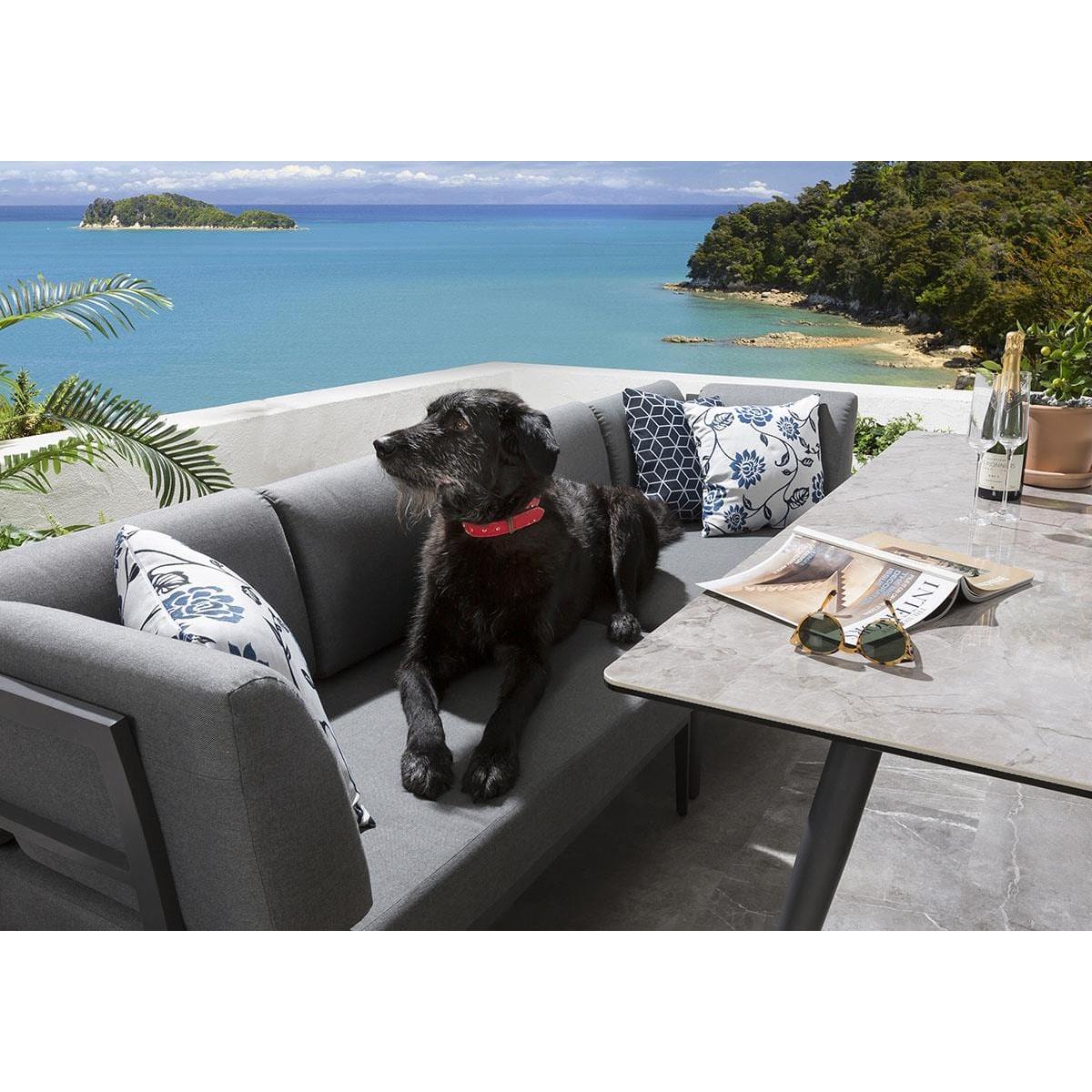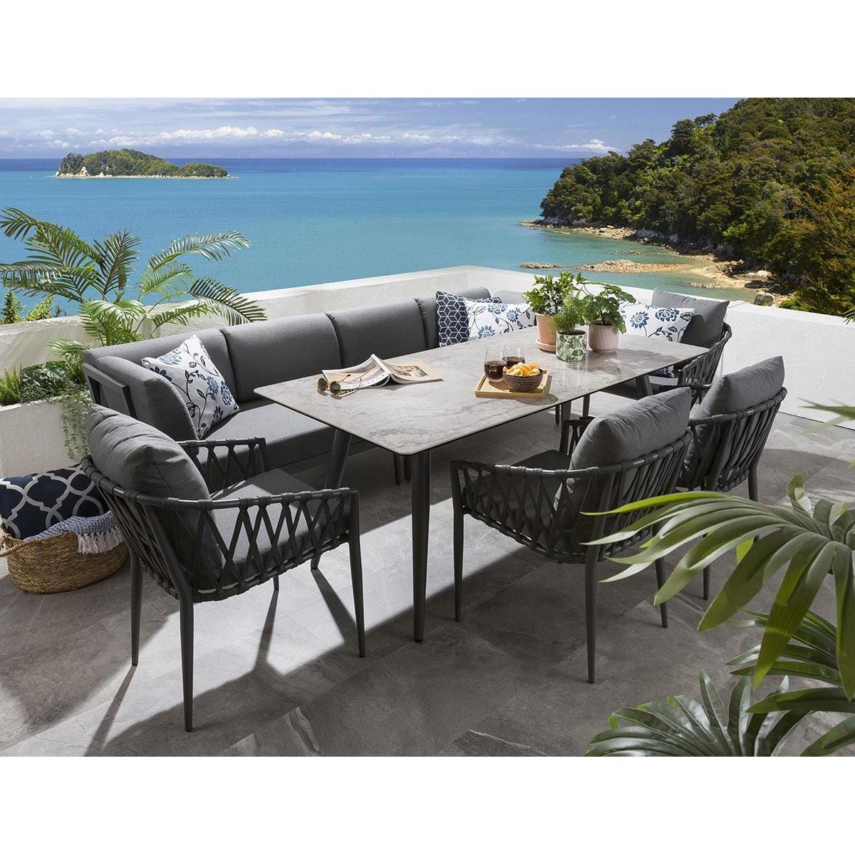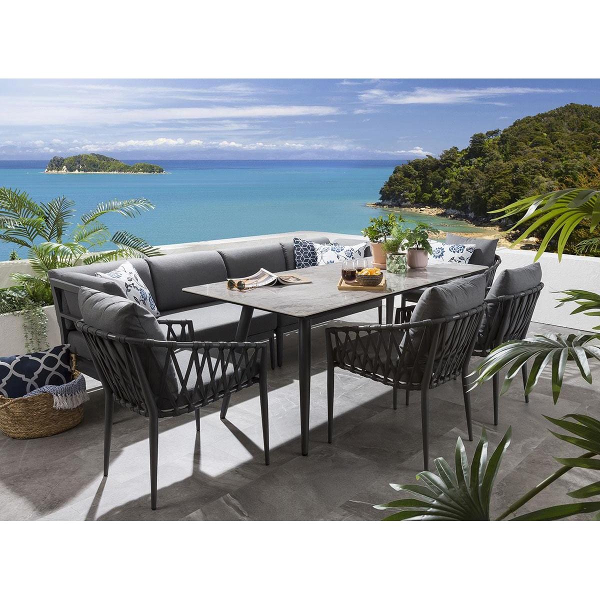 Our Ada Garden Dining Set includes 2 modular sofa sections in grey, 4 grey luxury dining chairs and a spacious 180cm x 90cm ceramic dining table with a timeless light grey marble-effect finish table top. Whatever the occasion, you'll find it incredibly difficult to resist your outdoors with the lure of this luxurious 8 seater garden table and chairs set. The Ada Modular Garden Sofa can be configured as a corner sofa, or straight sofa, depending on your space and requirements. The small garden corner sofa and dining chairs come complete with our signature luxuriously thick cushioning that offers unbeatable comfort, topped off with rich Grey high-end marine fabric which has amazing resilience to colour fading and damage caused by extreme weather conditions and also a free winter cover. The Ada Modern Dining Bench Set includes a premium ceramic top garden table. Ceramic stone is exceptionally hard wearing, plus its heat, scratch, and fade resistant. We usually reserve this material for our designer indoor dining tables, however, it is the perfect material for outdoor tables, as it is extremely durable. Expertly crafted aluminium frames are highly durable, complemented by clean lines that lend contemporary style. It is robust and weather-resistant for outdoor use & the firm-cushioned seating offers comfortable support that's shower-resistant, but we advise that cushions are stored when not in use. If you need more information about this product, use the Live Chat service to speak to the team or send us a message. Spread the cost our with interest-free finance options. Minimum spend applies. W250cm D230cm H81cm Ceramic glass durable table top Seats up to 8 people - 8-Seater Grey Garden Dining Table & Chairs