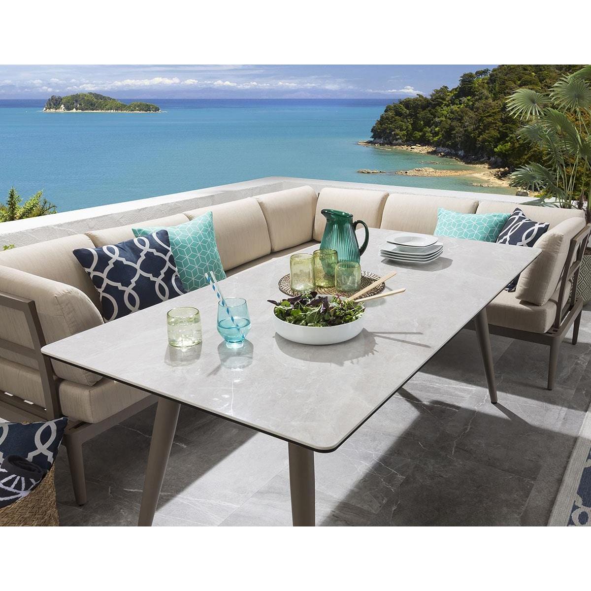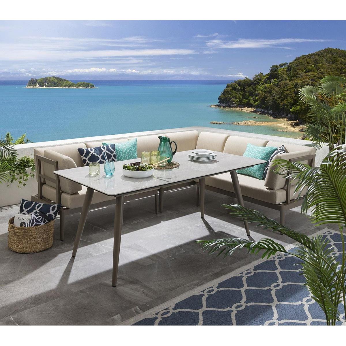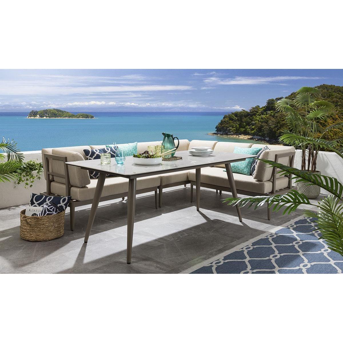 Our Ada Garden Dining Set includes 3 modular sofa sections in beige brown and a spacious 180cm x 90cm ceramic dining table with a timeless light grey marble-effect finish table top. Whatever the occasion, you'll find it incredibly difficult to resist your outdoors with the lure of this luxurious 5 seater garden table and chairs set. The Ada Modular Garden Sofa can be configured as a corner sofa, or straight sofa, depending on your space and requirements. The small garden corner sofas come complete with our signature luxuriously thick cushioning that offers unbeatable comfort, topped off with rich Beige Brown high-end marine fabric which has amazing resilience to colour fading and damage caused by extreme weather conditions and also a free winter cover. The Ada Modern Dining Bench Set includes a premium ceramic top garden table. Ceramic stone is exceptionally hard wearing, plus its heat, scratch, and fade resistant. We usually reserve this material for our designer indoor dining tables, however, it is the perfect material for outdoor tables, as it is extremely durable. Expertly crafted aluminium frames are highly durable, complemented by clean lines that lend contemporary style. It is robust and weather-resistant for outdoor use & the firm-cushioned seating offers comfortable support that's shower-resistant, but we advise that cushions are stored when not in use. W250cm D200cm H81cm Ceramic glass durable table top Seats up to 5 people - 5-Seater Beige Brown Garden Dining Table & Chairs
