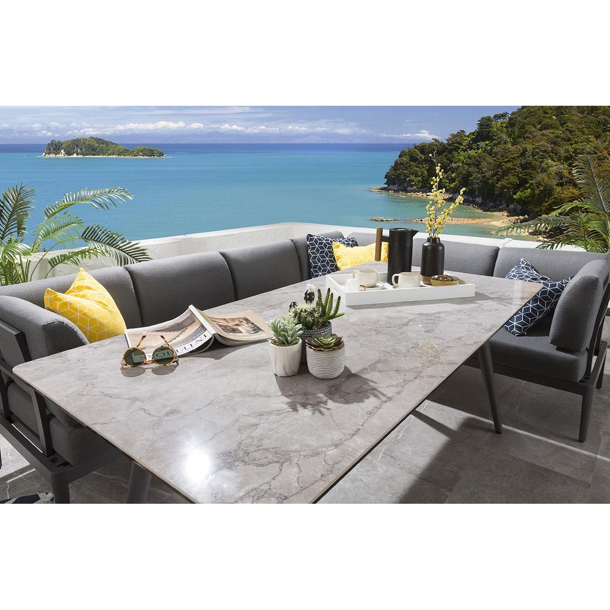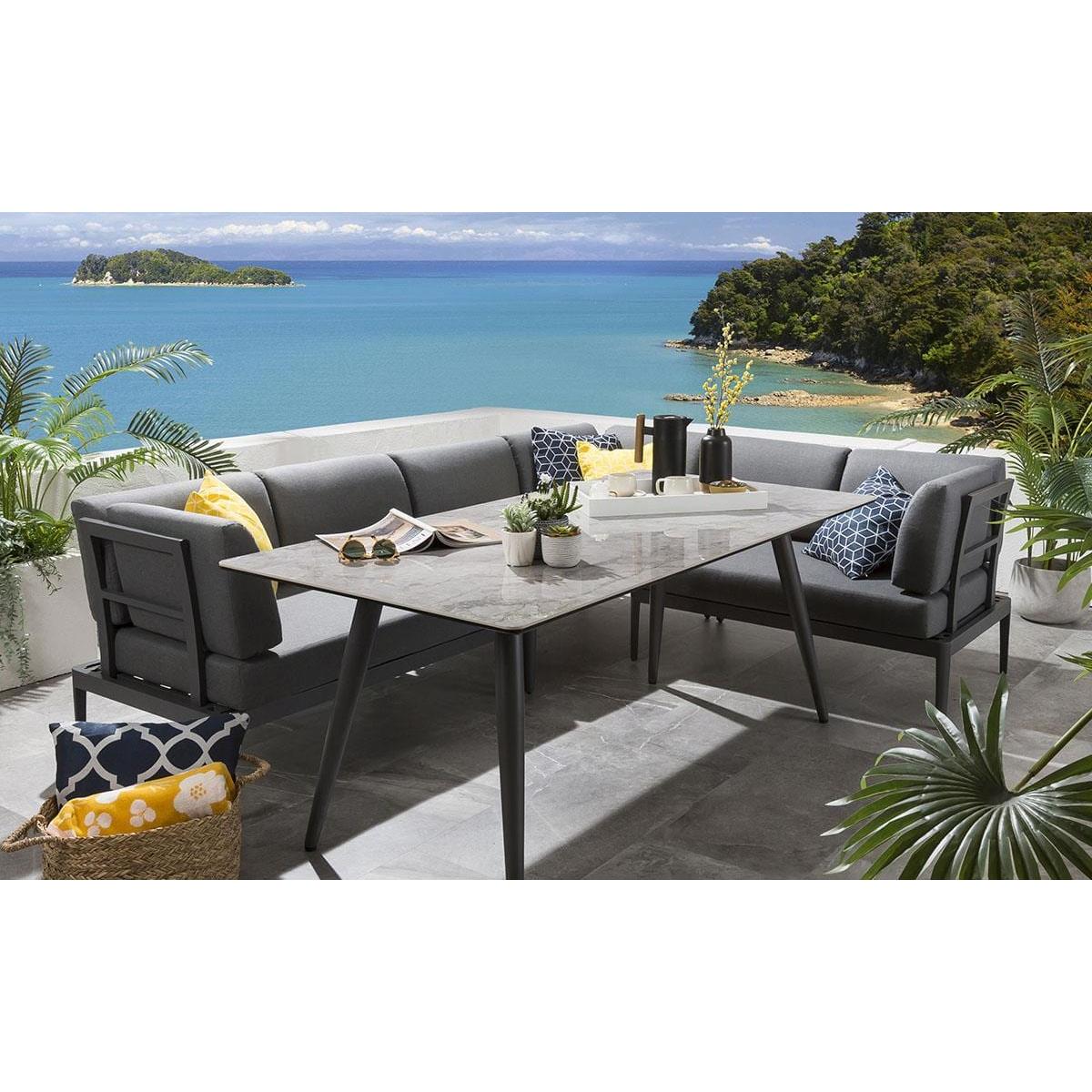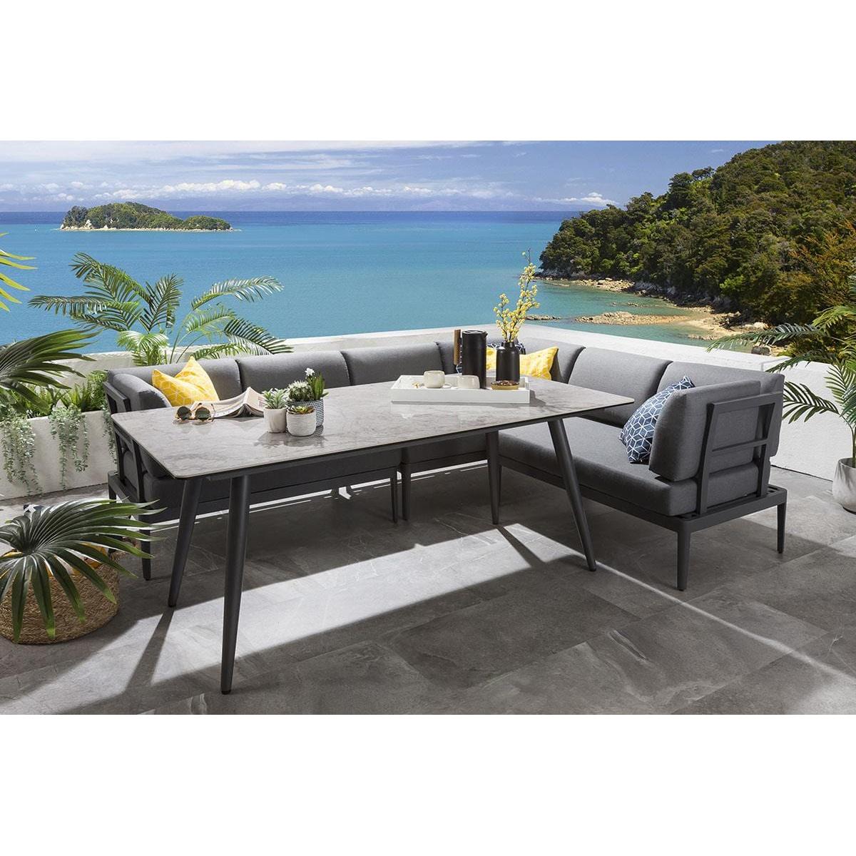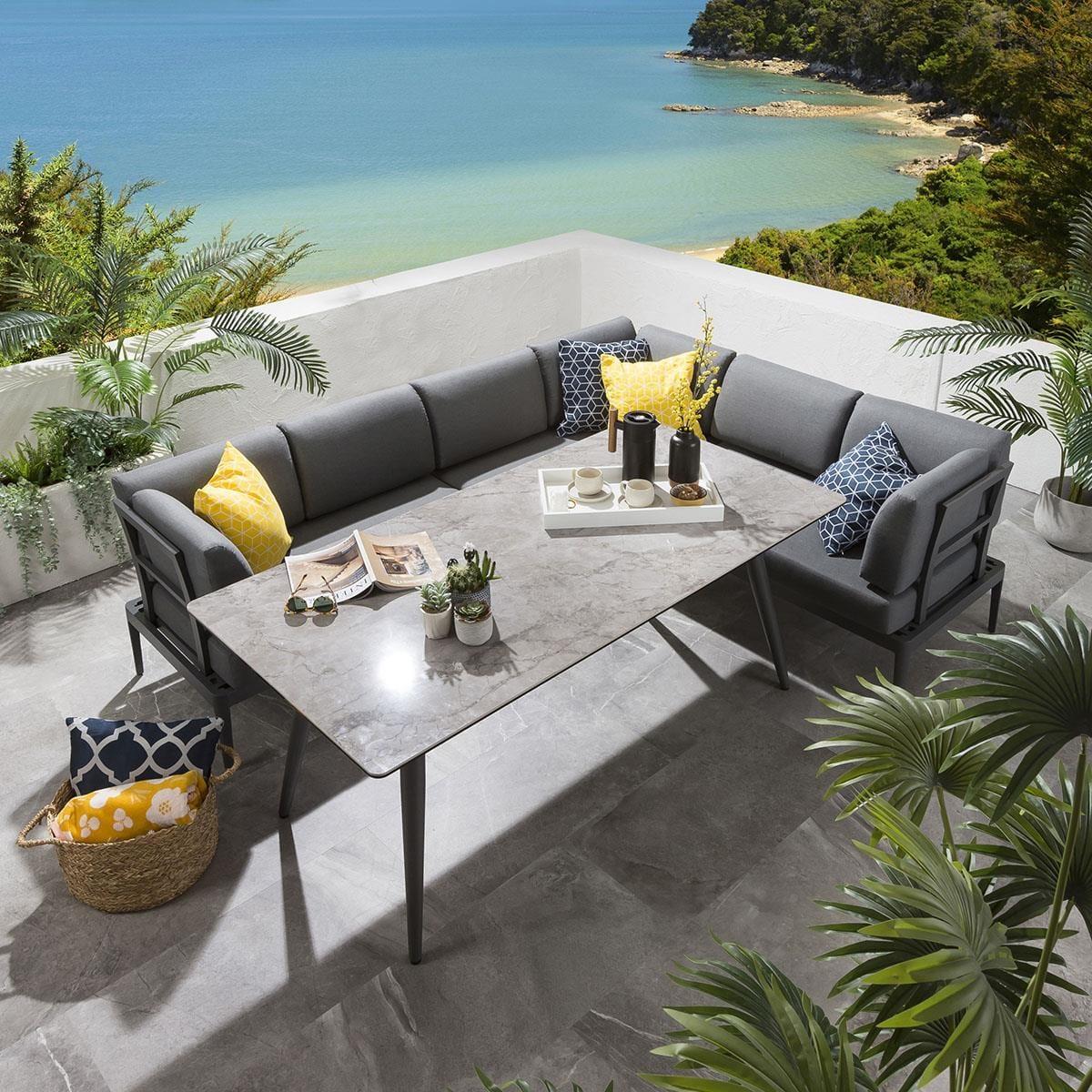Our Ada Garden Dining Set includes 3 modular sofa sections in grey and a spacious 180cm x 90cm ceramic dining table with a timeless light grey marble-effect finish table top. Whatever the occasion, you'll find it incredibly difficult to resist your outdoors with the lure of this luxurious 5 seater garden table and chairs set. The Ada Modular Garden Sofa can be configured as a corner sofa, or straight sofa, depending on your space and requirements. The small garden corner sofas come complete with our signature luxuriously thick cushioning that offers unbeatable comfort, topped off with rich Grey high-end marine fabric which has amazing resilience to colour fading and damage caused by extreme weather conditions and also a free winter cover. The Ada Modern Dining Bench Set includes a premium ceramic top garden table. Ceramic stone is exceptionally hard wearing, plus its heat, scratch, and fade resistant. We usually reserve this material for our designer indoor dining tables, however, it is the perfect material for outdoor tables, as it is extremely durable. Expertly crafted aluminium frames are highly durable, complemented by clean lines that lend contemporary style. It is robust and weather-resistant for outdoor use & the firm-cushioned seating offers comfortable support that's shower-resistant, but we advise that cushions are stored when not in use. W250cm D200cm H81cm Ceramic glass durable table top Seats up to 5 people - 5-Seater Grey Garden Dining Table & Chairs
