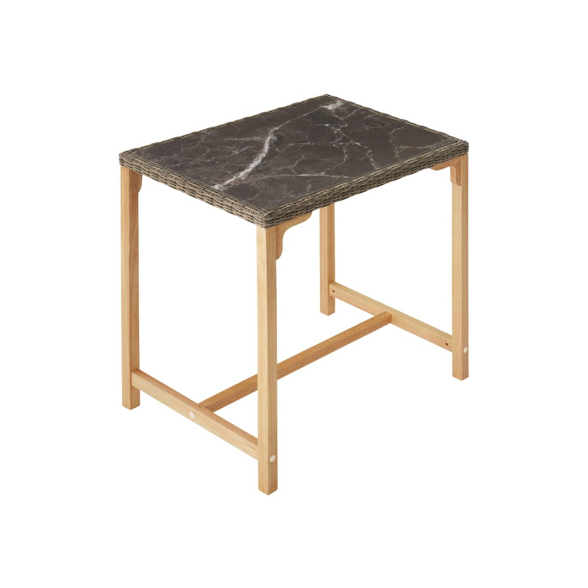 Serve cool cocktails, full-bodied wines and tasty snacks on the practical Kutina garden table from tectake. The tables large surface consists of a marbled table top of porcelain stoneware supported by an angular frame made of lightweight aluminum and solid wood. The products stylish surface is surrounded by a hard-wearing plastic rattan weaves that scores high with its natural look. The resilience and durability of the weatherproof outdoor furniture are high, whilst the assembly time and cleaning effort is low. Shop other patio sets in our range of offers to find chairs to perfectly match the kitchen table, for the perfect outdoor dining experience in your home. Toast to cosy hours at the inviting Kutina bistro garden table from tectake!