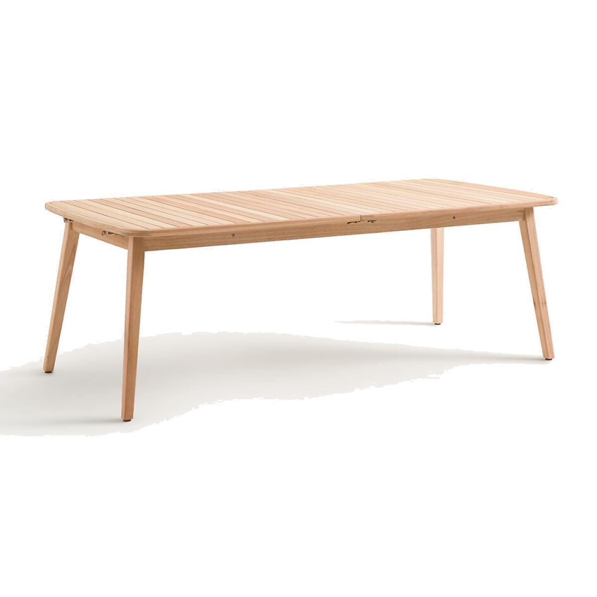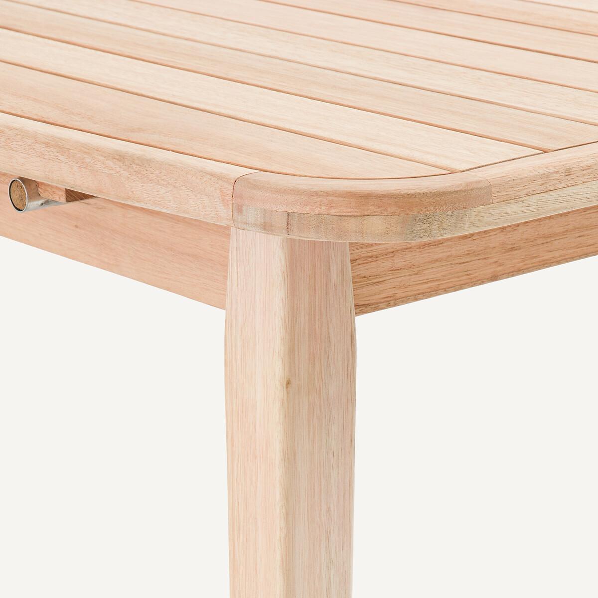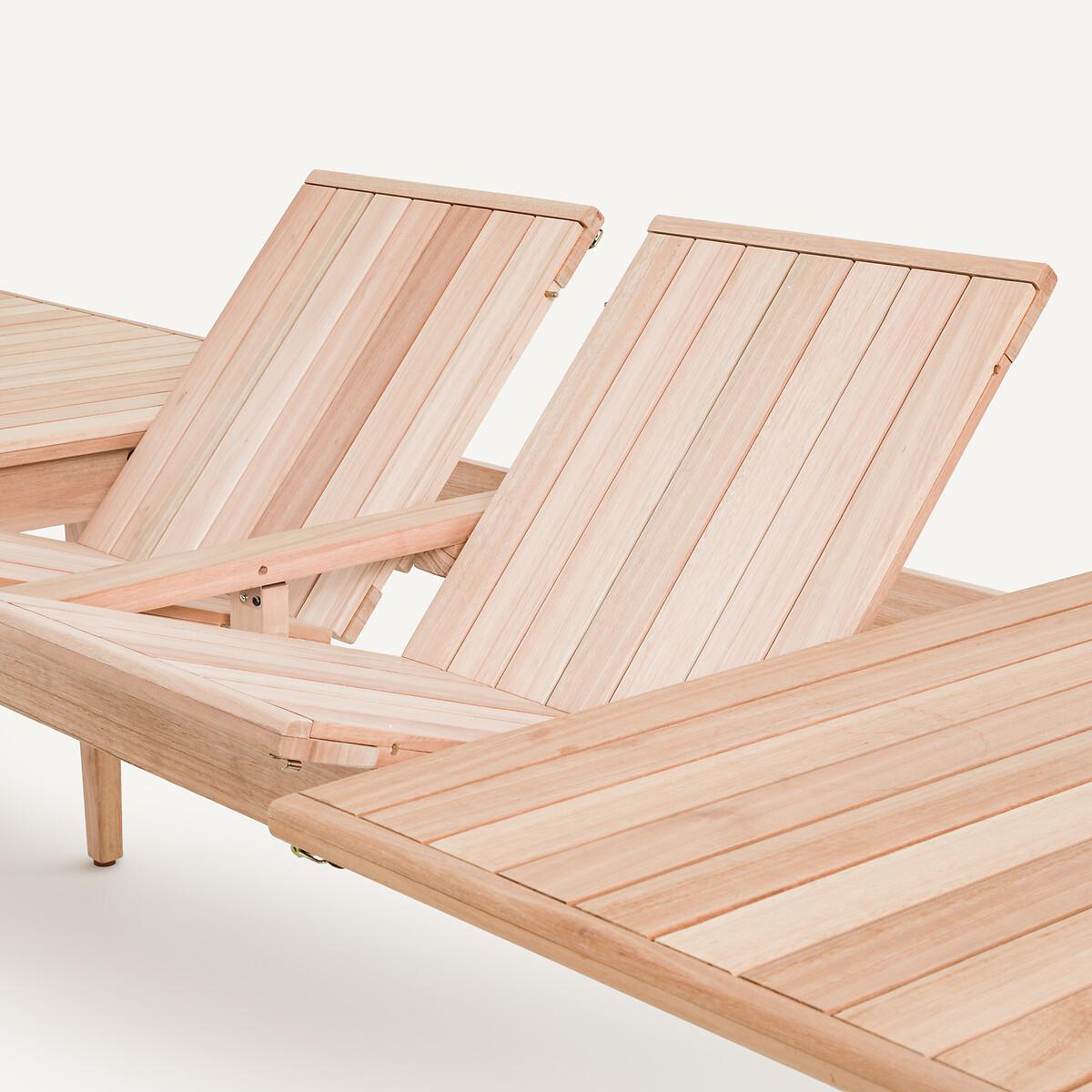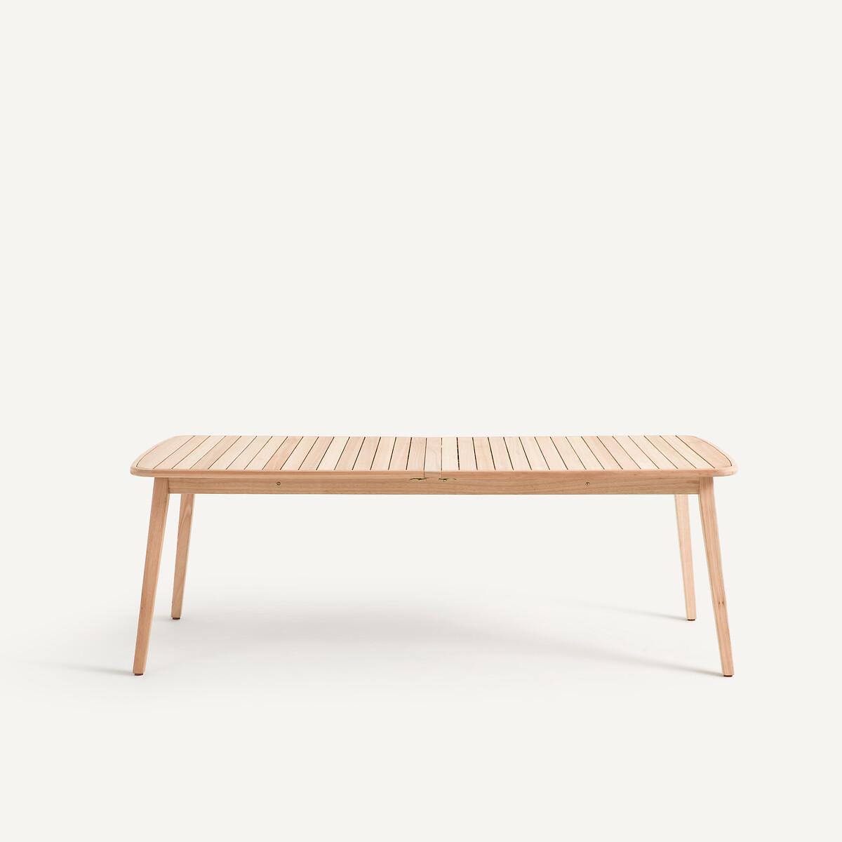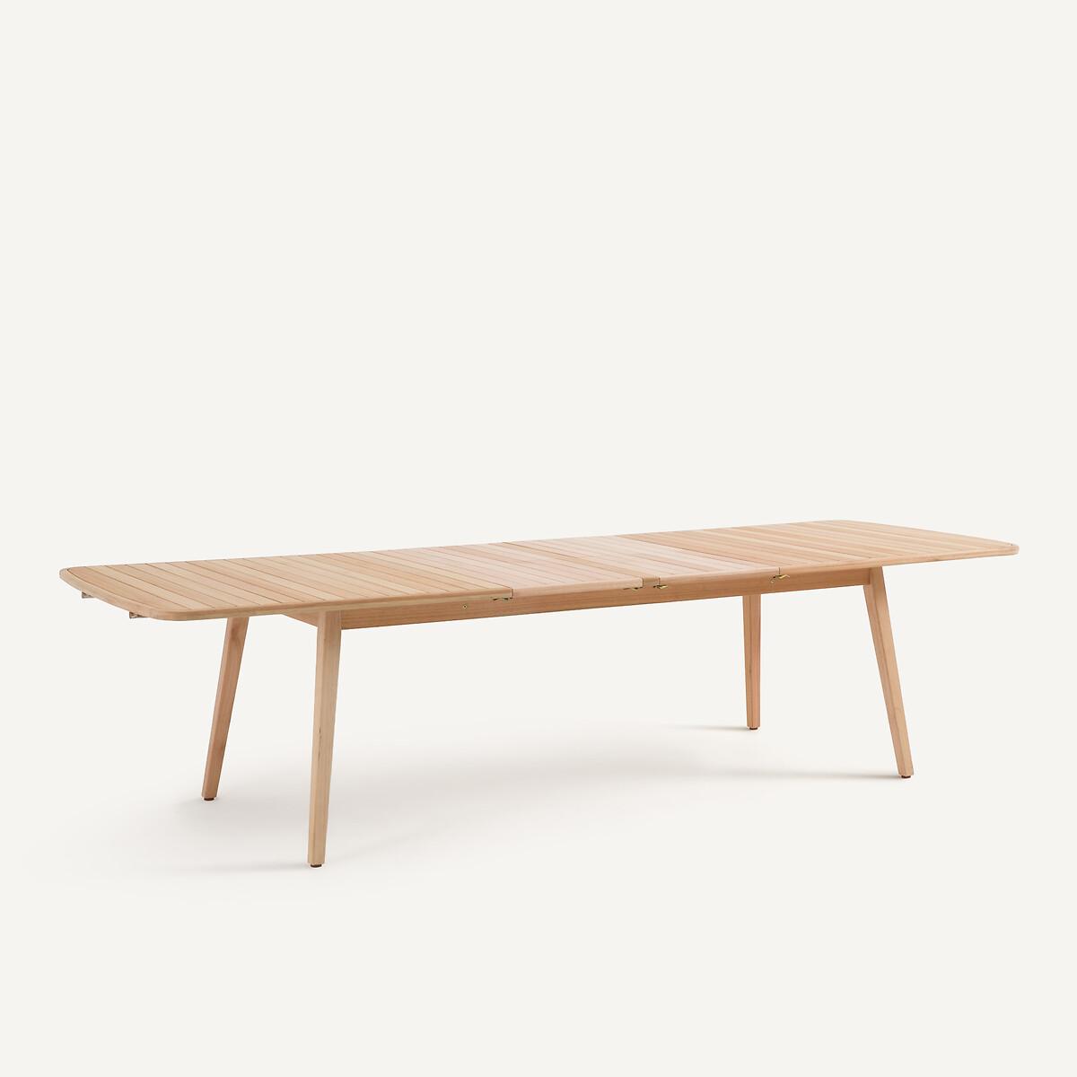 A sense of simplicity and conviviality. Designed for large tables, Altea has 2 discreet butterfly extensions that allow it to extend up to 3 metres. With its slender legs and wide Tray with rounded corners, this solid eucalyptus dining table will complement any style of outdoor space. An AMPM creation. Product Details • Solid eucalyptus, polyurethane varnish finish • FSC® certified wood • Feet need screwing in. Quality Info • Eucalyptus is a hardwood that resists insect and fungus well.. For maintenance, simply apply a coat of oil twice a year after lightly sanding the surface.. Dimensions • Width: 218cm/262cm with 1 extension / 306cm with 2 extensions • Height: 75cm • Depth: 100cm • 2 central butterfly extensions : 44 x D100 cm each • Seats 8-10 • 47kg. Care Advice • Low temperatures are likely to affect the proper functioning and surface condition of your outdoor furniture. • We therefore advise you to store it in a dry, ventilated and closed room.. We strongly advise against the use of a tarpaulin because it will act as an oven and will damage the surface conditions; wood and metal products are particularly concerned. • Before any storage, remember to clean and dry the products well, in order to prevent the appearance of mould or unpleasant odours.. • In all cases, and whatever the material, it is not advisable to leave furniture outdoors unprotected, particularly during bad weather and winter. Delivery: • Requires some assembly (based to be attached). Available for home delivery. Note! Please ensure all passageways and doorways are wide enough. • WOOD FROM SUSTAINABLY MANAGED FORESTS. FSC® certified wood comes from forests that are environmentally, socially and economically well managed. Dimensions and weight of parcel • 1 parcel • W222 x H12 x D104cm. 52kg