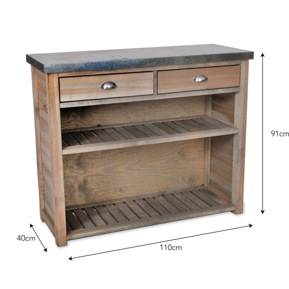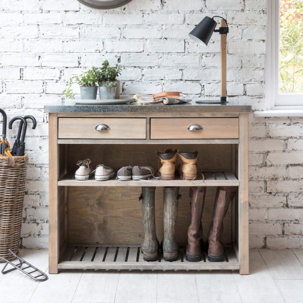 An indispensable item for that every hallway needs, the Aldsworth Boot room Unit offers rustic, durable design for everyday use. Crafted from European Spruce, we've matched with the galvanised sheet metal top for an industrial touch. Featuring two slatted shelves of varying heights, these ensure muddy wellies don't reach the carpet. Shoes and boots can be neatly lined on the upper shelf, keeping the hallway or utility room clutter free. Smart and practical, the addition of two drawers will ensure post, newspapers and accessories are kept organised in style. Dimensions: H: 91 x W: 110 x D: 40 cm Materials: Spruce & Galvanised Metal Assembly Required: No Care Instructions:Wipe clean with a clean, soft, damp cloth. Dry with a link free microfibre cloth.