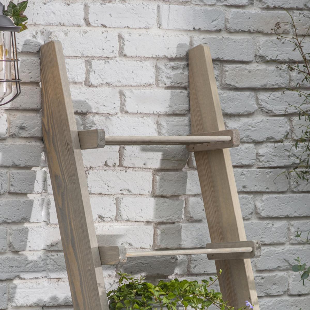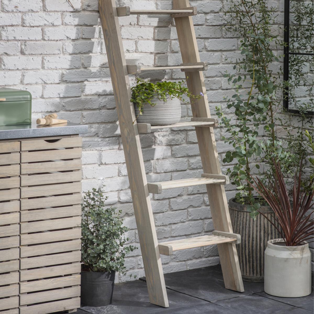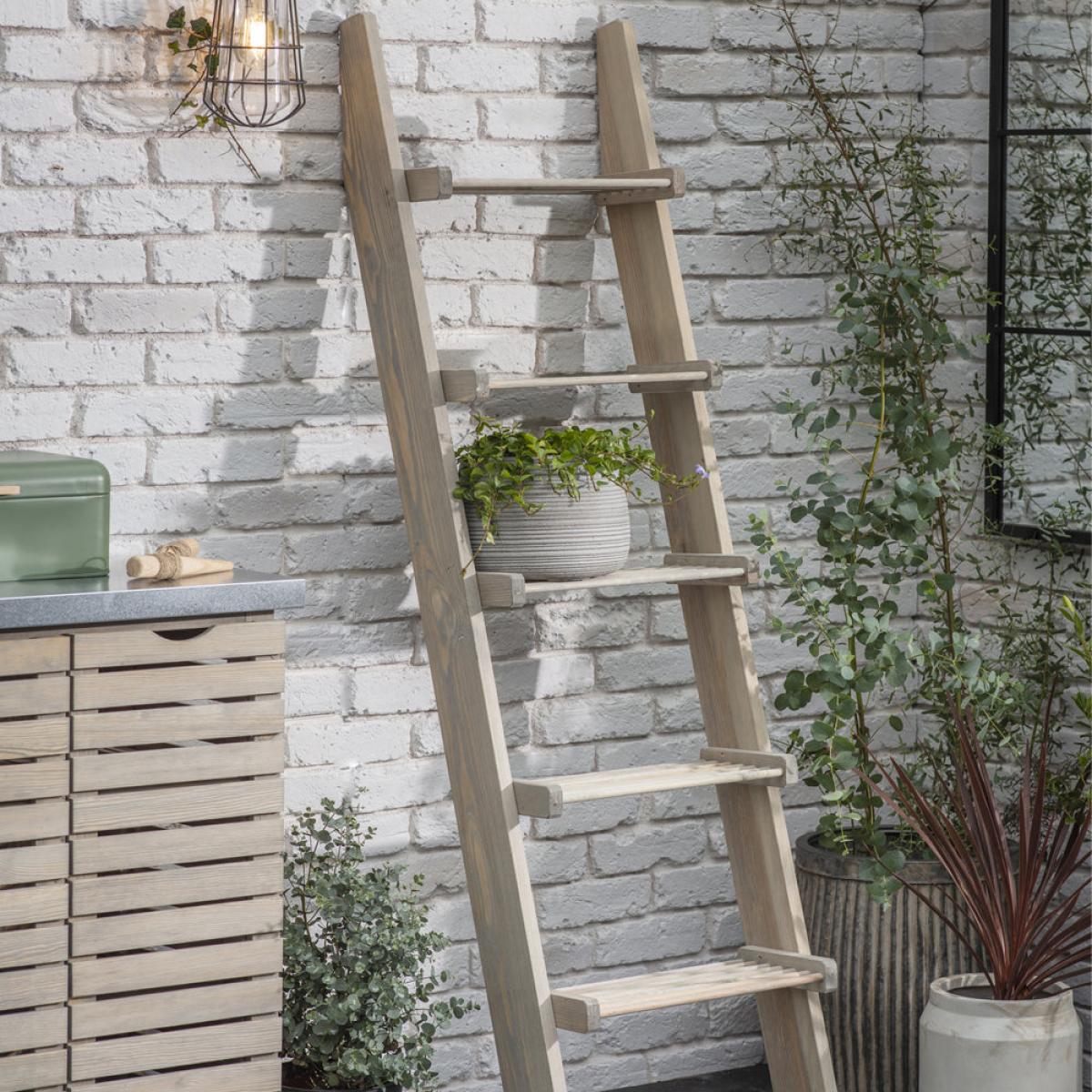 Lightweight and versatile, the Aldsworth Slatted Shelf Ladder is the perfect way to store and display garden accessories, pots and essentials in the potting shed. Dimensions: H: 170 x W: 12 x D: 45 cm Materials: Spruce stained with grey water stain, not chemically treated Assembly Required: No Care Instructions:Dust with a clean, lint free, dry cloth. No harsh abrasives Additional Information: Supplied with 2 x polyester strips to fix to wall to avoid tipping. We recommend placing this item in a sheltered area to prolong its life. Shelves sit flush to the wall