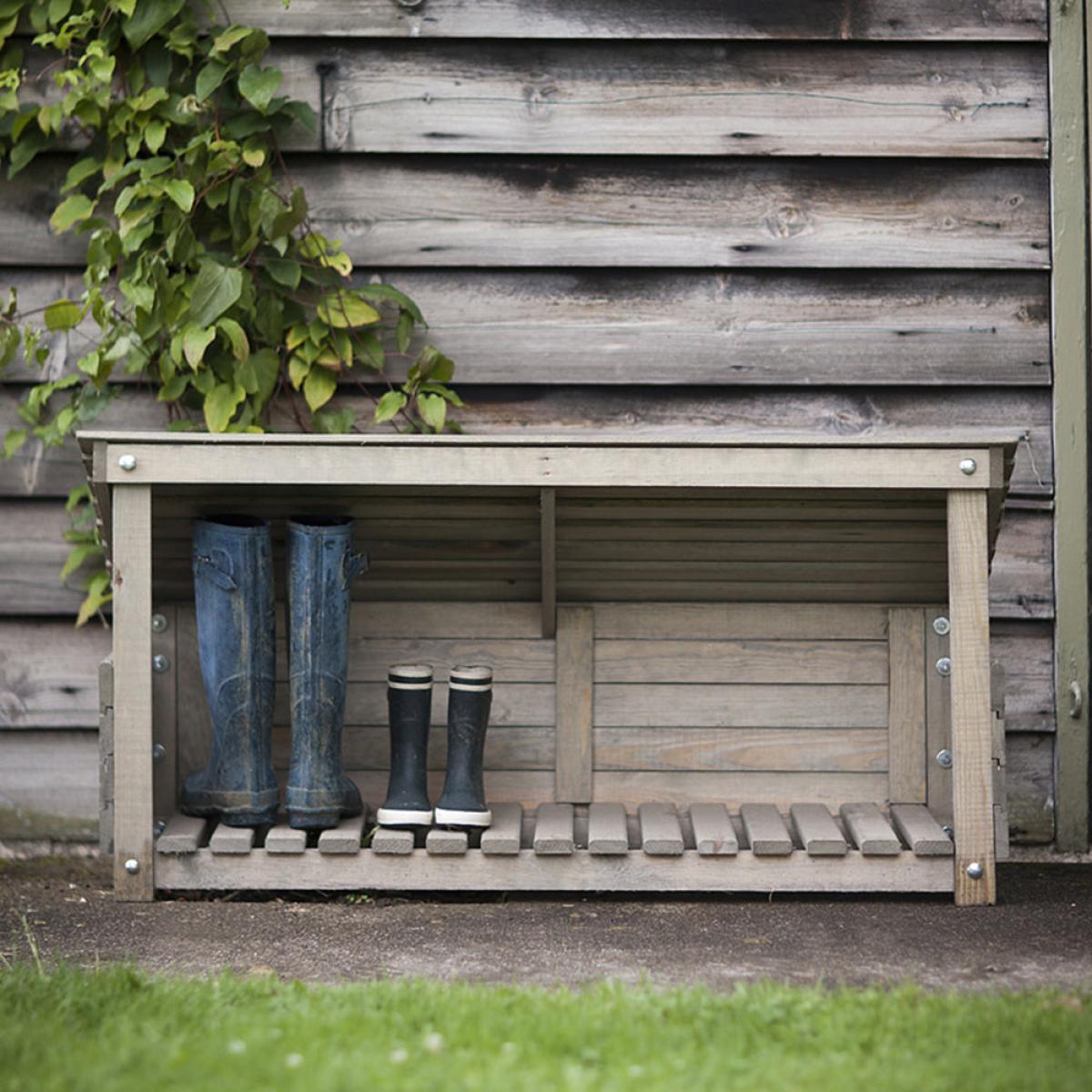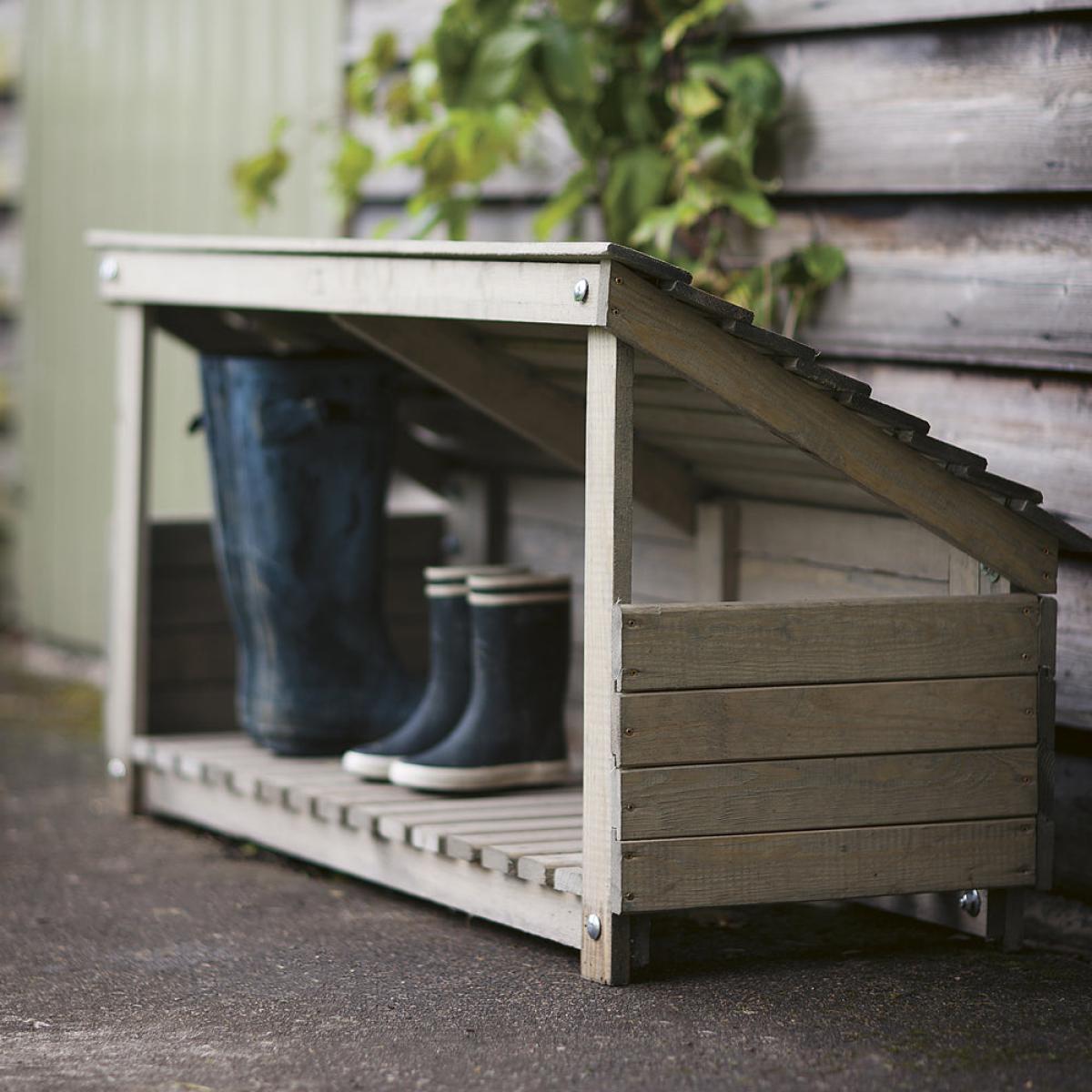 Practical design at its very best. This Welly Store is a perfect fit for all the family's outdoor footwear. Devised to provide boots and shoes with the ultimate protection in all weathers and seasons. It's crafted from stained Spruce and has a slanted roof with three sides to ensure that everything stored away is kept safe and more importantly, dry. Dimensions: H: 60 x W: 120 x D: 42 cm Materials: Spruce stained with grey water stain, not chemically treated Assembly Required:Yes Care Instructions: Clean with a clean damp cloth. No bleach or harsh abrasives Additional Information: For indoor or outdoor use. Weatherproof. We recommend positioning this item in a sheltered area to prolong its life. Clear wood sealant can be used on this item but it not supplied