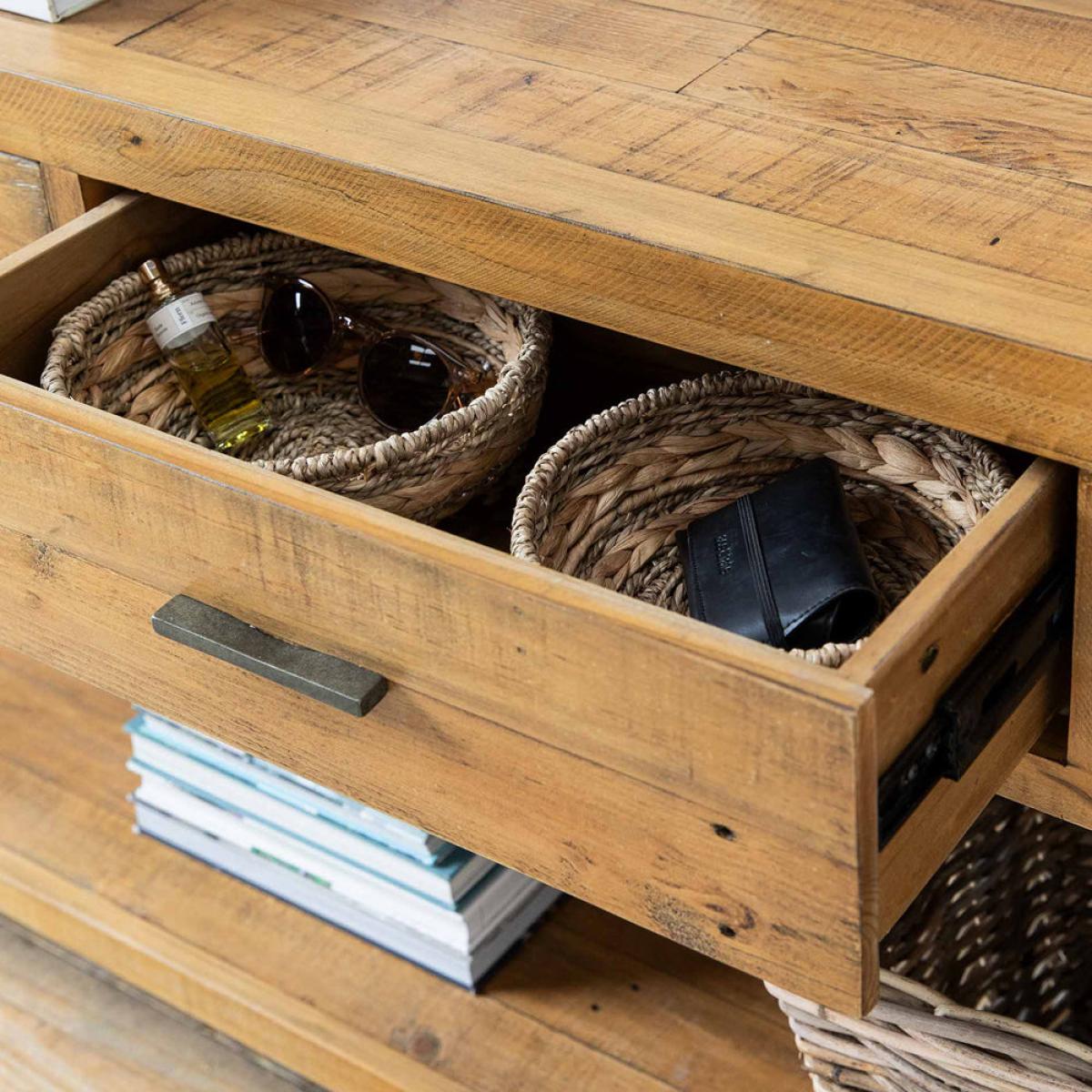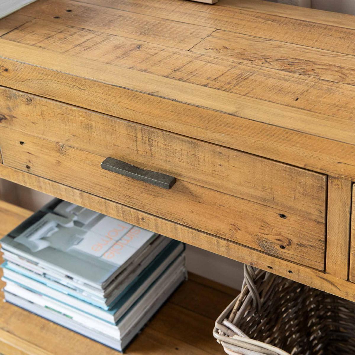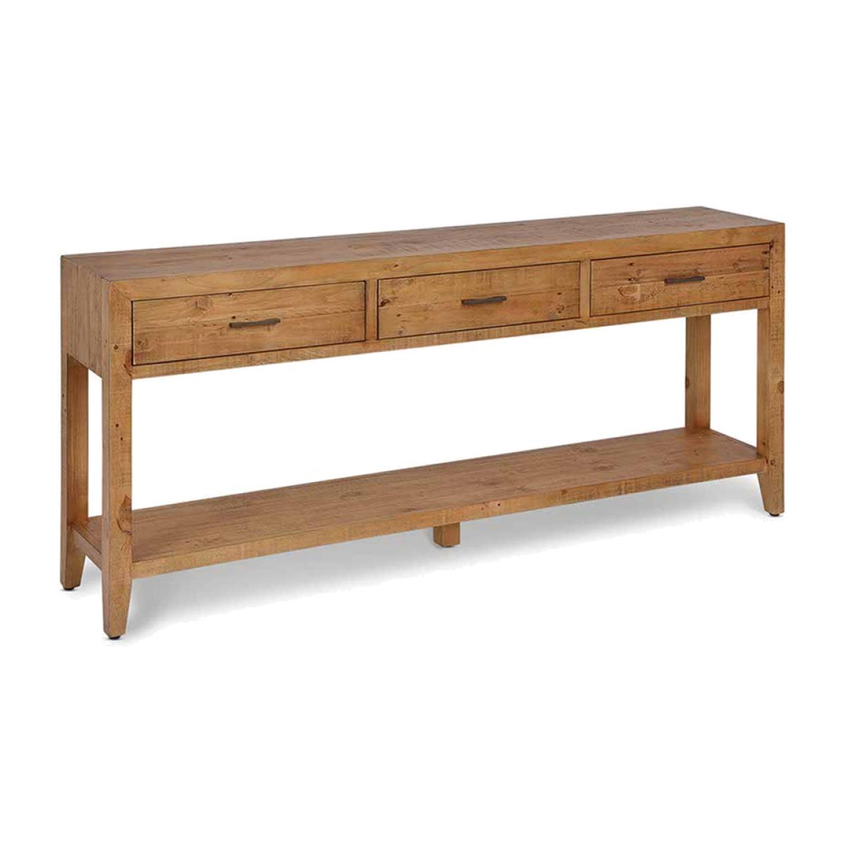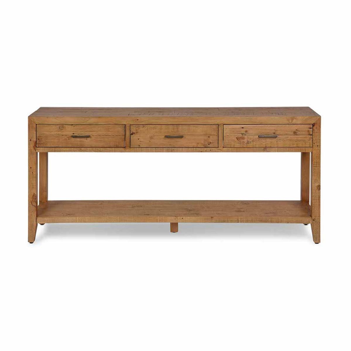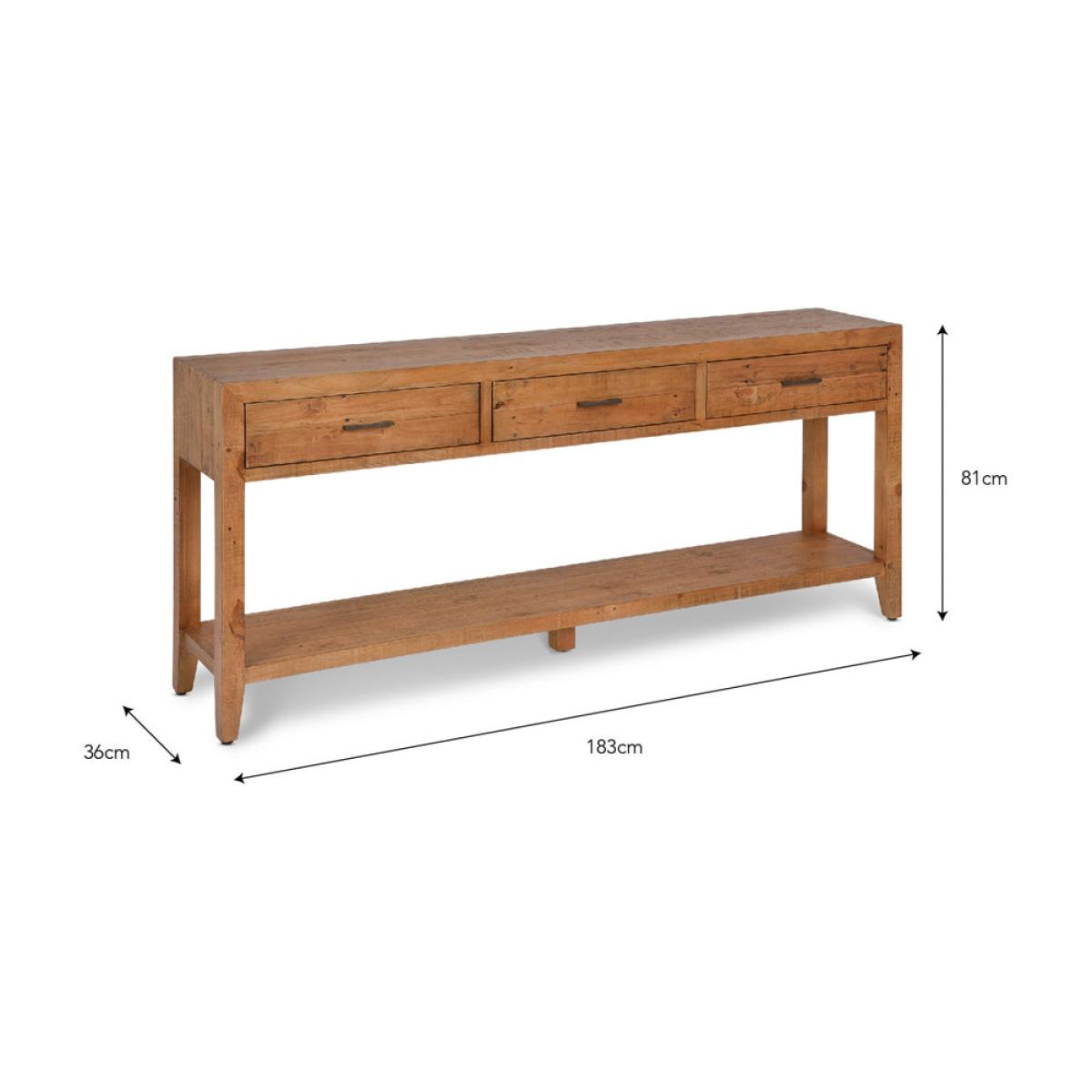The Garden Trading Ashwell Console Table with 3 Drawers in Natural is a versatile and elegant addition to any home. Crafted from reclaimed pine with a clear wax finish, this console table offers both style and functionality. Perfect for an open hallway, dining room, or living room, it provides ample storage space with its three drawers while also serving as a display surface for decorative items. Its simple yet sophisticated design adds a touch of Scandinavian-inspired charm to any space. Whether used as a console table or a side table, the Ashwell Console Table enhances the aesthetic appeal of your home while offering practical storage solutions. Elevate your interior decor with this timeless piece from Garden Trading. Dimensions: H: 81 cm x W: 183 cm x D: 36 cm