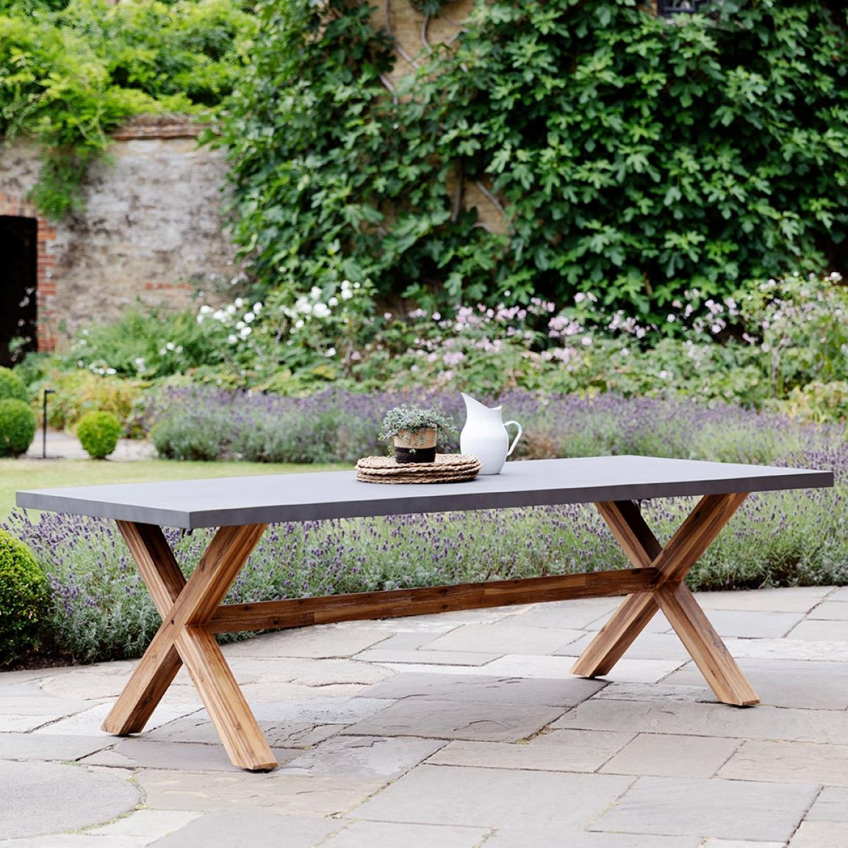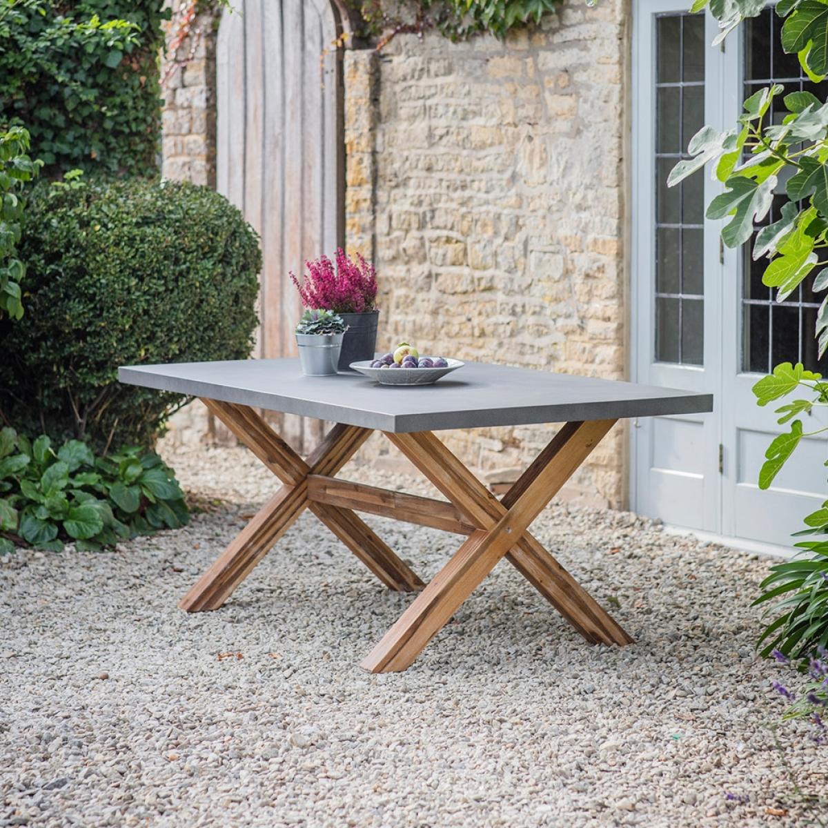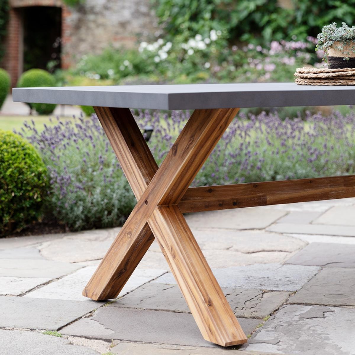 The Garden Trading Burford Grey Dining Table is a strikingly modern garden dining table for your outdoor space but would look equally fine in your kitchen or conservatory. The tabletop is made from polystone resin and is therefore UV stable and weatherproof. The legs are X shaped and made of beautiful Acacia wood which has a more distinctive wood grain pattern than its rival Teak, is much more sustainable and can be just as long lasting. This contemporary grey stone coloured version comes in two sizes seating 6-8 or 8-10. Surely a great option if you are in the market for a garden table?.