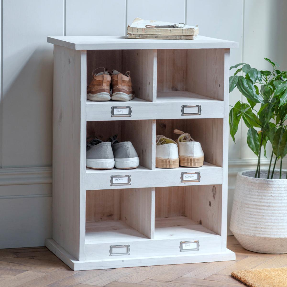 Practical and stylish storage inspired by traditional design, our Chedworth Shoe Locker is crafted in spruce and now available in a new Whitewash colourway, which blends beautifully with both neutral and dramatic colour tones. The perfect way to ensure that all those stray trainers, football boots and pumps have a home, the shoe locker comes in a range of three sizes. Boasting plenty of storage, it features space to label each compartment, leaving no excuse for losing your shoes! Dimensions: H: 66 x W: 50 x D: 35 cm Materials: Spruce Assembly Required: No Care Instructions:Wipe clean with a clean, soft, damp cloth. Dry with a link free microfibre cloth.