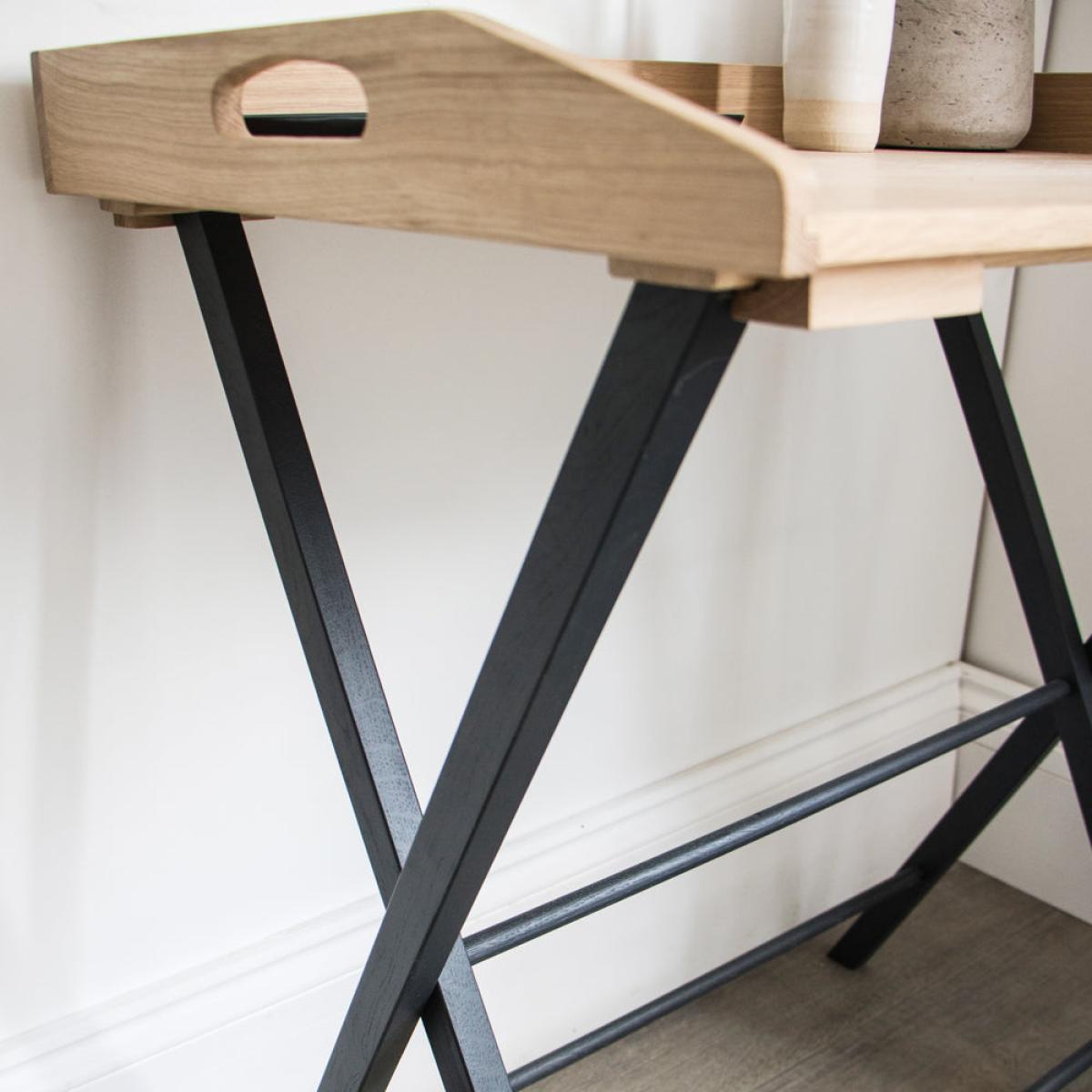 The Clockhouse Desk Tray offers a stylish working station that's effortlessly portable and striking in design. Crafted in a mix of Oak and painted Beech this giving a lovely juxtaposition between m. View More. The Clockhouse Desk Tray offers a stylish working station that's effortlessly portable and striking in design. Crafted in a mix of Oak and painted Beech this giving a lovely juxtaposition between materials and colours. The tray has been finished with a layer of hard wax oil which adds a level of protection from staining. The foldable legs are finished in our off-black Carbon colour for a contemporary touch. Simple yet sturdy in design, the tray can be removed from the legs, and stored easily away when not in use. Use as an occasional work station or position as a side table in a living room or bedroom. The ample tray space will fit a laptop and papers, or a table lamp and home accessories.