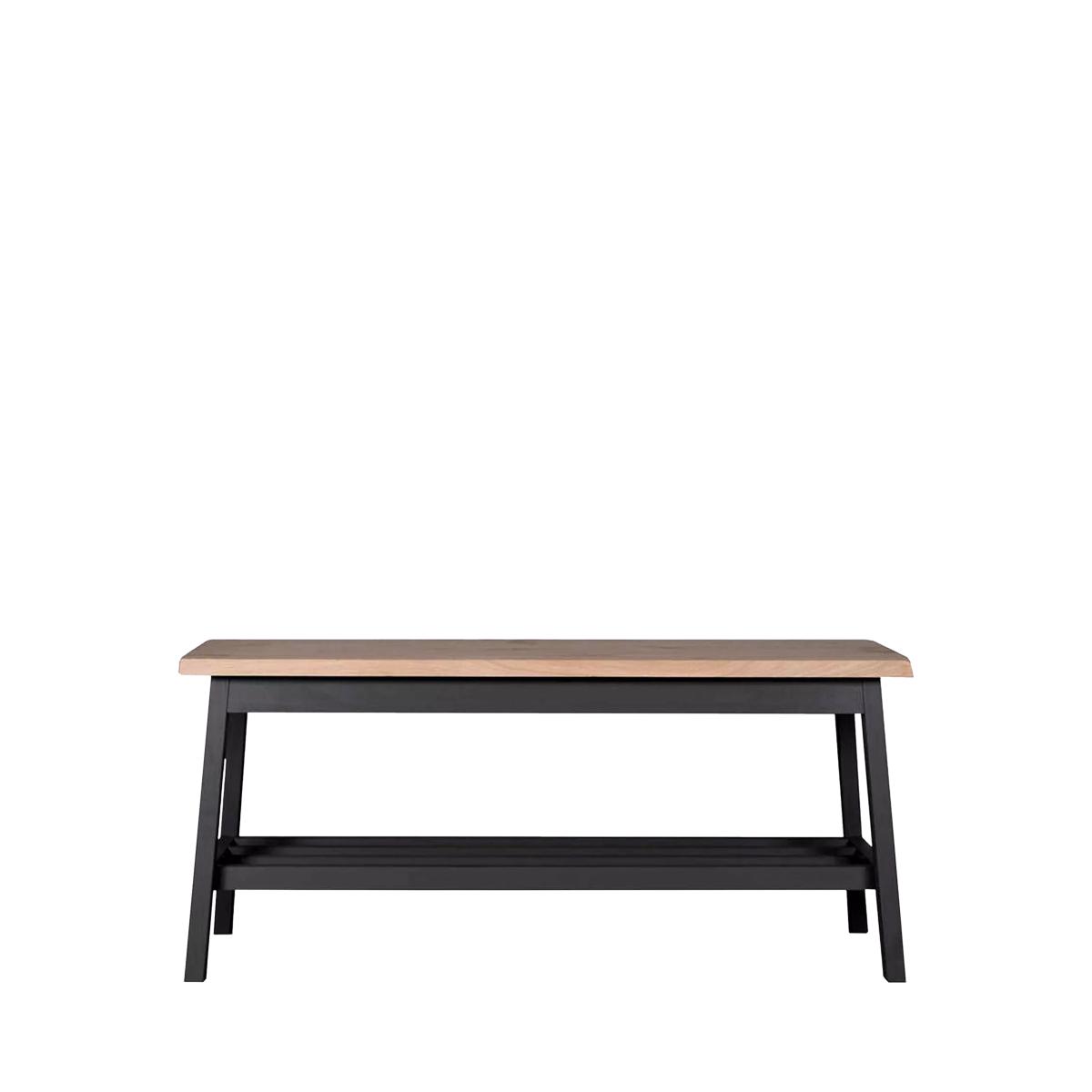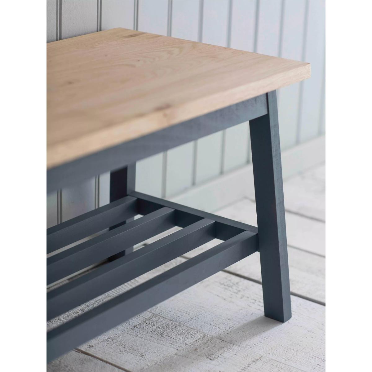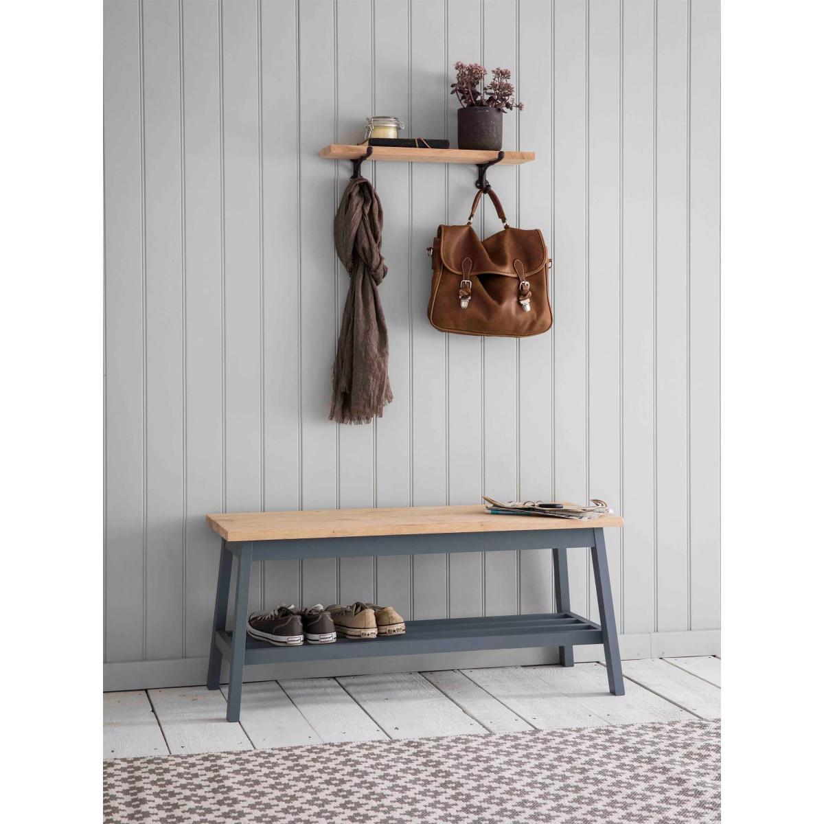 The Clockhouse Hallway Bench offers ultimate storage and seating in the hallway or porch. Crafted with an oak veneer top and beech legs coated with charcoal grey paint. This versatile bench can be used throughout the home and comes with a slatted shelf perfect for storing shoes and accessories. Seating two people comfortably (or three little ones) the Clockhouse Hallway Bench is ideal for taking a seat and popping on shoes before leaving the house. The shelf has ample room for around 4-5 pairs of shoes plus extra space underneath. Place in the hallway, boot room or conservatory to keep scattered shoes at bay whilst also having a piece of sleek and functional furniture for the home. Please note: the charcoal colourway, when used on wood, has blue grey tones. Maximum load 320kg