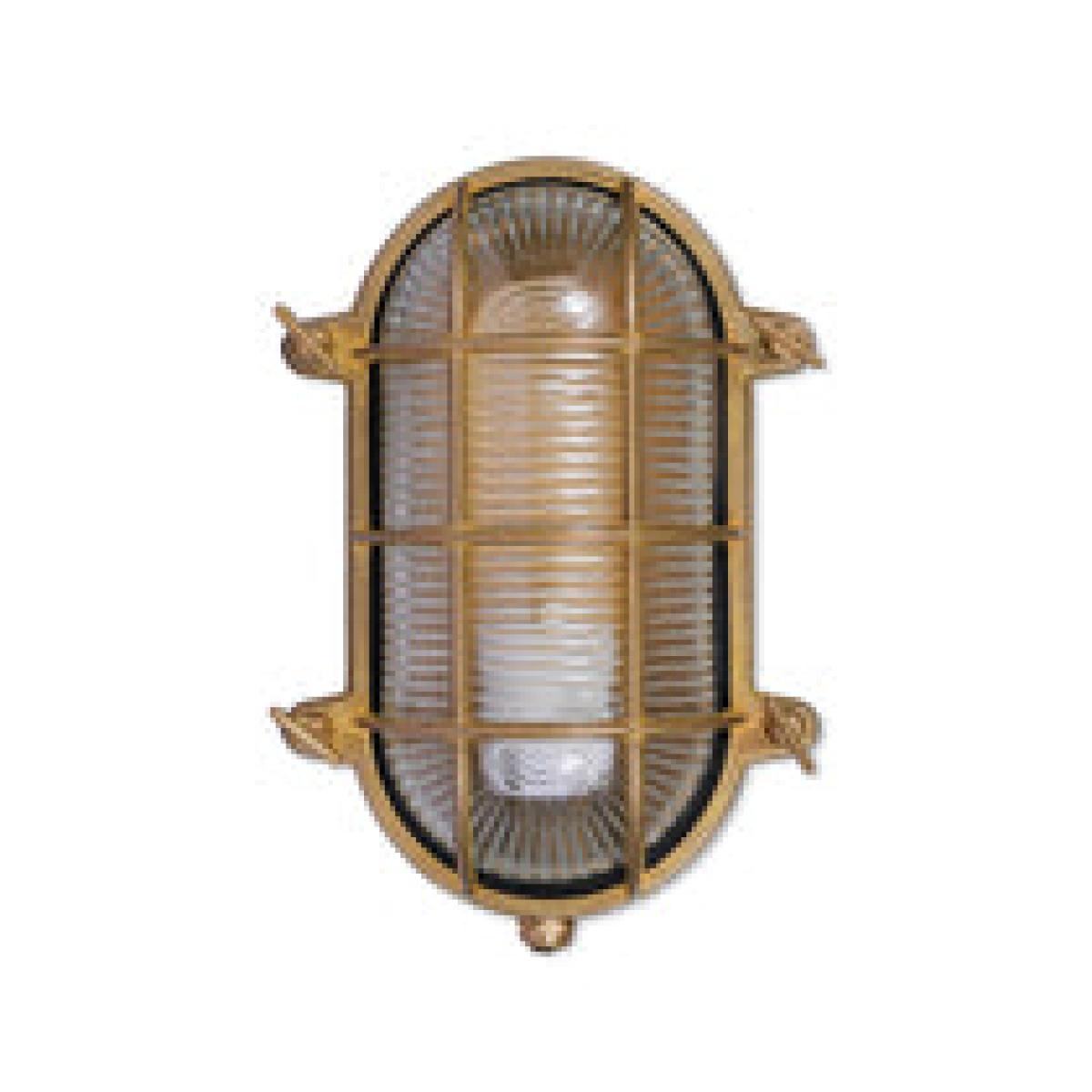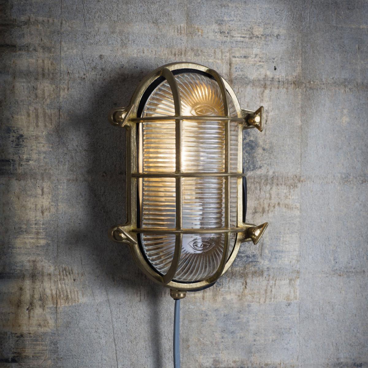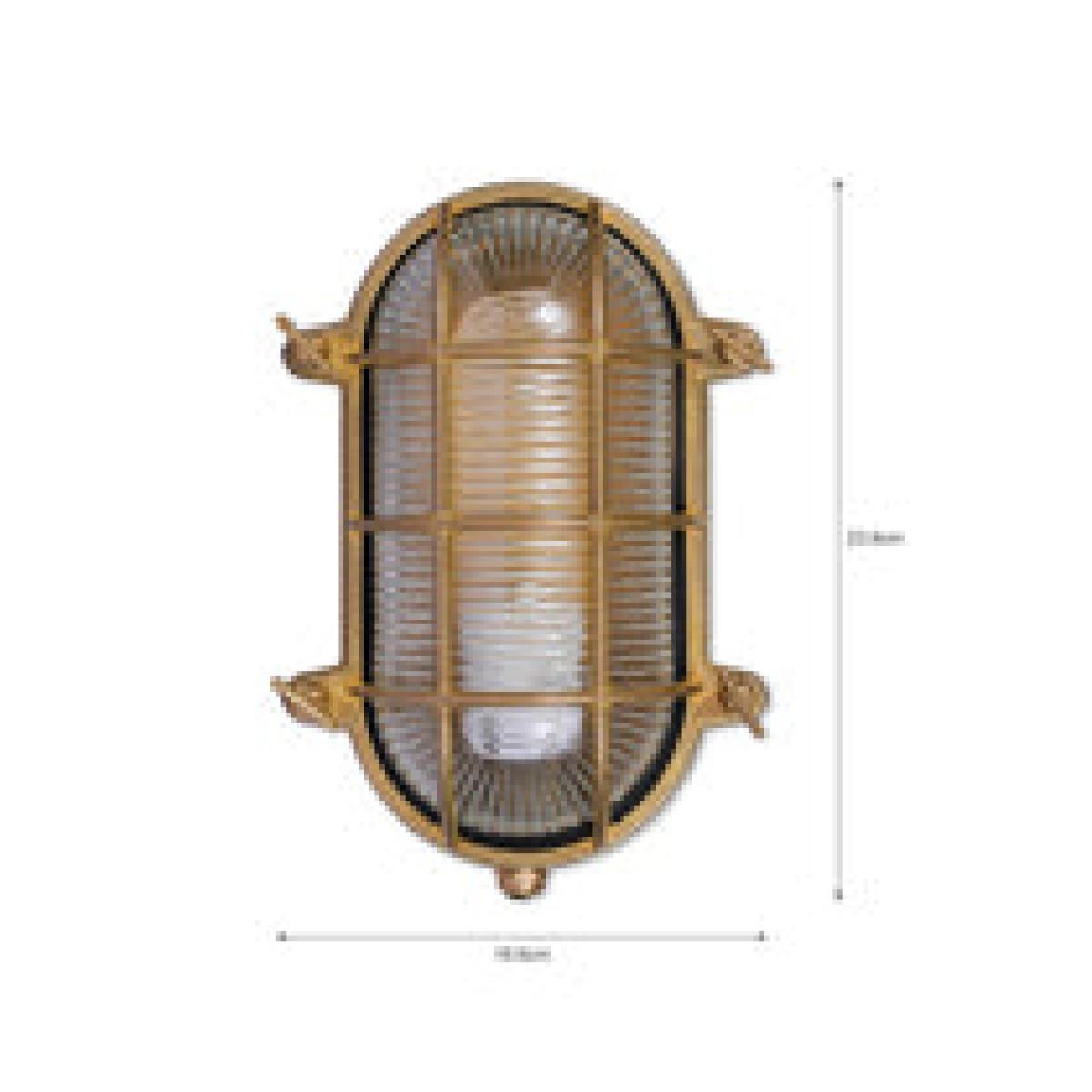 Inspired by lighting found on naval ships, the Devonport Bulkhead Light is vintage and iconic in style. The oval shape with ribbed glass design offers a stunning expanse of light to your surroundings. The fitting could be positioned next to a doorway, spaced around the exterior of the home or in the potting shed giving you that much needed light. The name derives from the well-known naval base of Devonport in Plymouth, a name we found quite fitting for our new collection. The heavy Brass exterior is extremely durable and weatherproof hence its use on ships and boats. The fitting is IP65 rated and has been designed to fit a standard E27 bulb. We have left the material raw to allow the brass to darken over time. Due to this the light may display the brass patina known as Verdigris (green). This natural ageing process was our intention for this product. To keep the shiny appearance a good quality metal polish or wadding can be applied. Dimensions: H: 23.8 x W: 16.6 x D: 11.5 cm Materials: Brass Bulb Type: 1 x 10W E27 - bulb not included Assembly Required: No - does require hardwiringNotes:. Motion sensor compatible - not included. Wiring comes from bottom of light. Gold tubing picture is not included