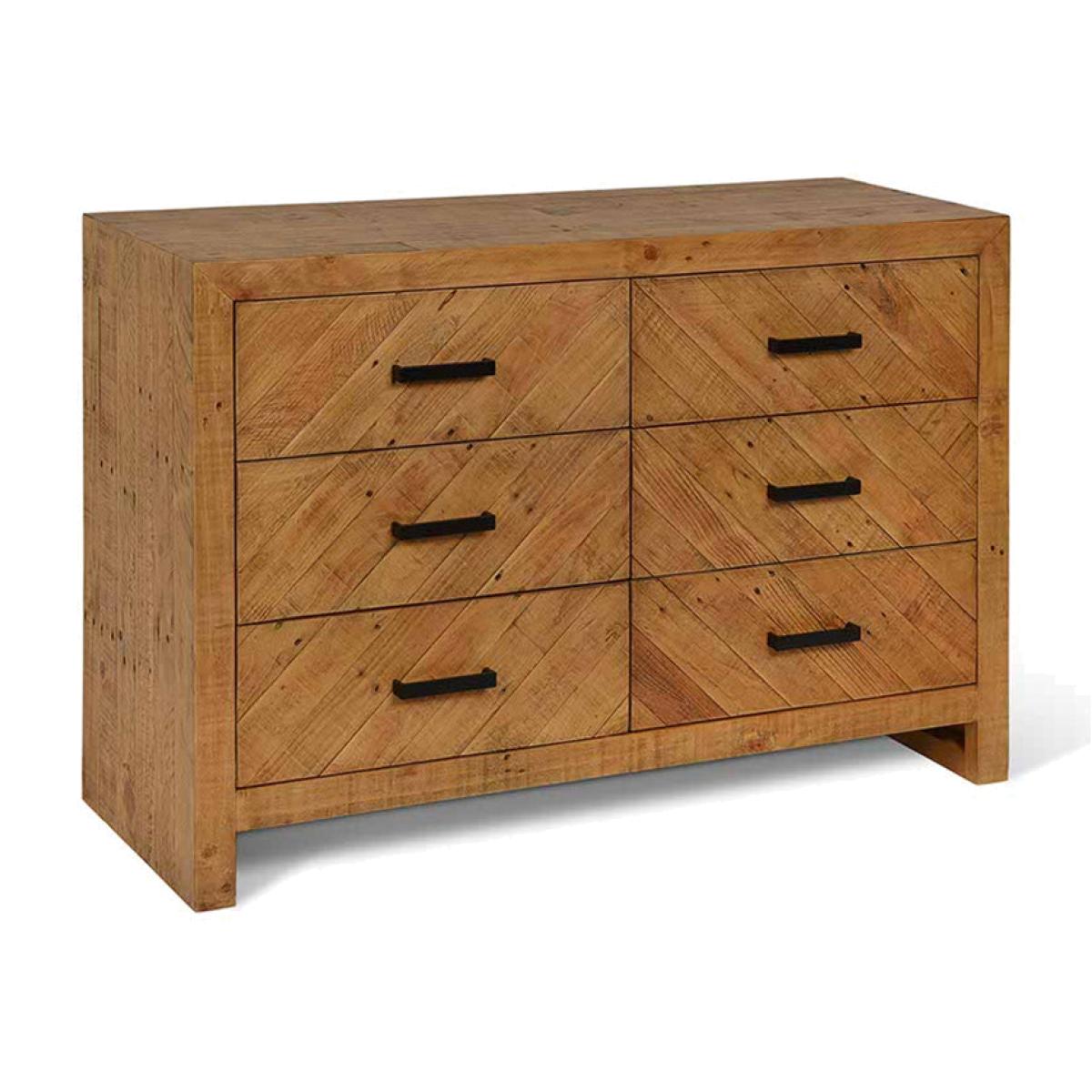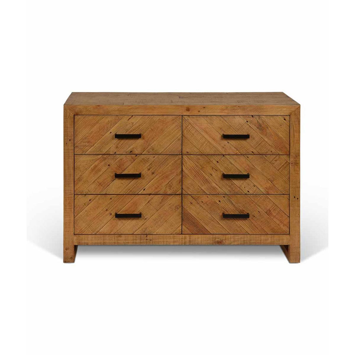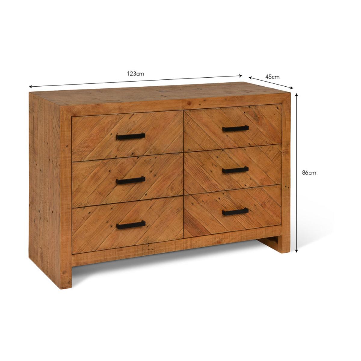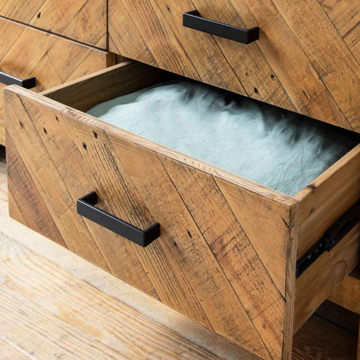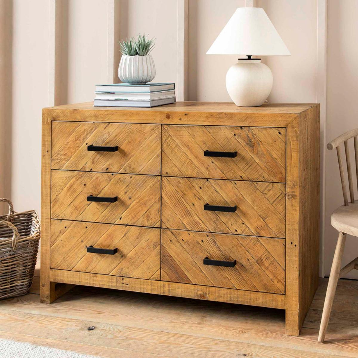 Give your bedroom a sophisticated makeover with the Garden Trading Fawley Chevron Chest of Drawers in Natural. Crafted from reclaimed pine, this striking chest of drawers features the same chevron design as other furniture in the Fawley range. Add a touch of modern elegance to your bedroom decor with this versatile and stylish piece. Pair it with matching furniture from the Fawley collection for a cohesive look, and enjoy the functionality and beauty it brings to your space. Dimensions: H: 86 cm x W: 123 cm x D: 45 cm