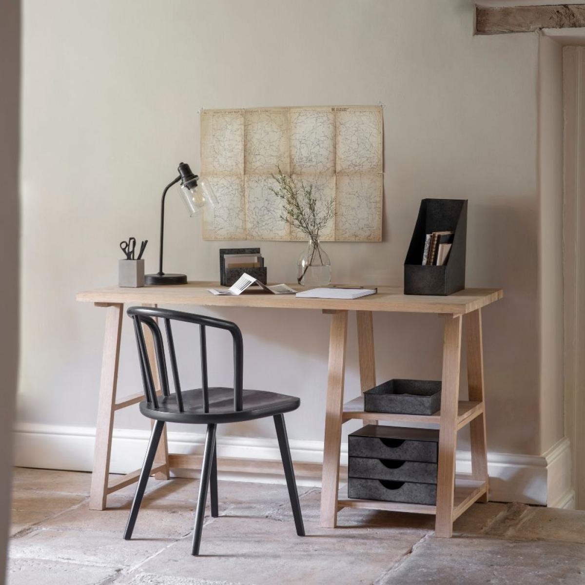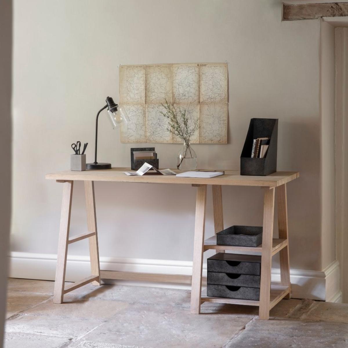 Introducing the Hambledon A-Frame Desk in Oak, a stylish and functional piece that's perfect for creating an inviting work-from-home space. This A-frame desk boasts a cleverly designed storage space that's ideal for organizing writing supplies, books, and other essentials. Crafted from oak, it adds a touch of natural elegance to your home office. Whether you're setting up a dedicated workspace or need a versatile desk for various tasks, the Hambledon A-Frame Desk combines style and practicality, ensuring your work area is both efficient and visually appealing. Elevate your home office with this chic and functional desk, where form meets function for a productive and inviting workspace.