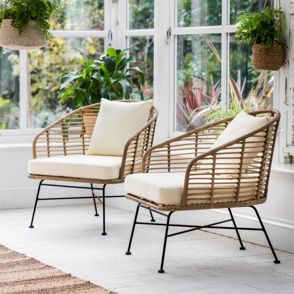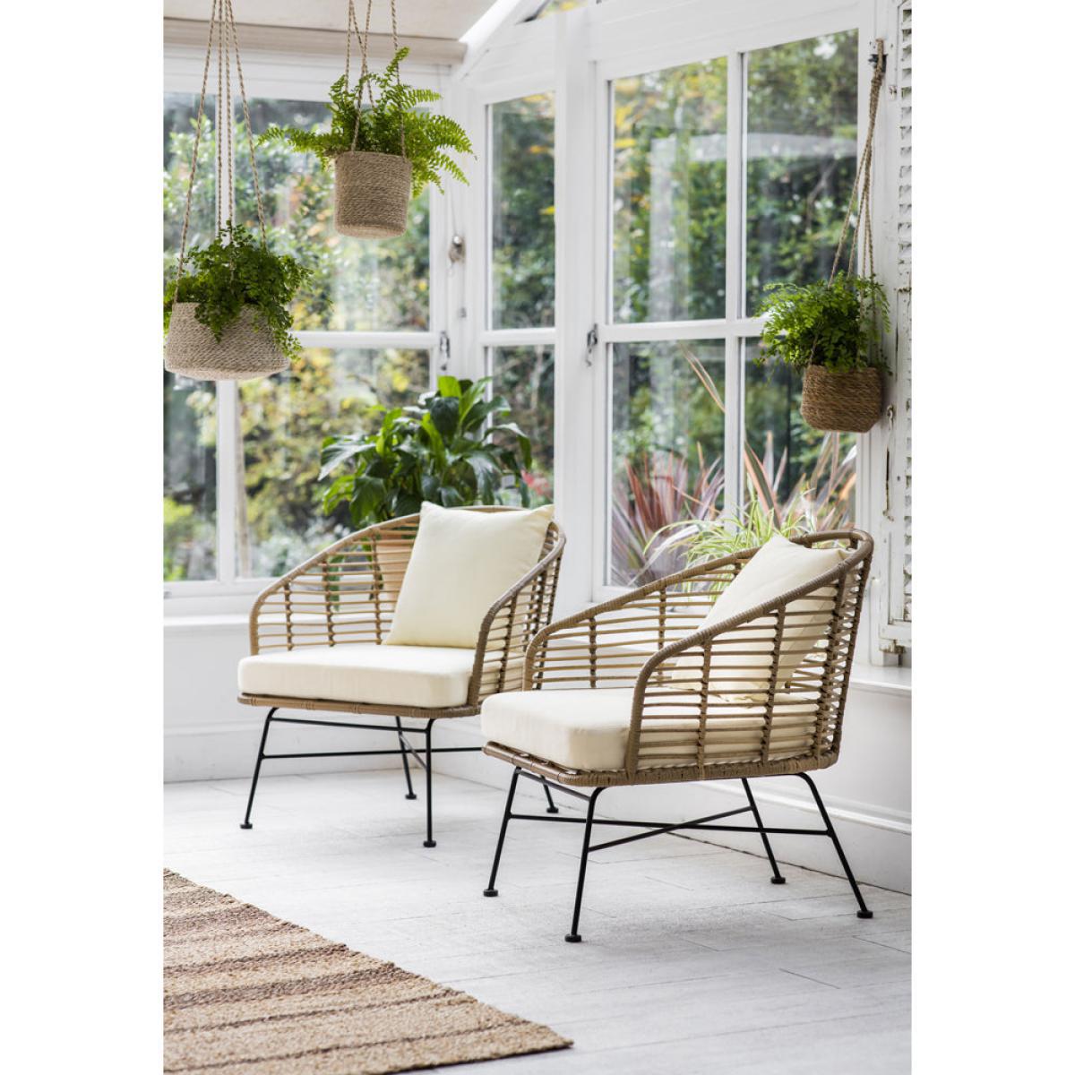 Sit back and relax in the comfort of our Set of 2 Hampstead Armchairs. Crafted from strips of PE bamboo, the natural coloured weatherproof material has been intricately wrapped around the lightweight yet sturdy steel frame. The Windsor style curved back and arms offer support and the deep seats allow you to recline with a good book or favourite tipple. Perfect for positioning on the patio, decking or in the conservatory, the pair can also be purchased alongside matching items in the Hampstead range to create a Scandinavian inspired tranquil space indoors or out. For that added layer of comfort each chair comes with a seat pad and back cushion in contrasting off-white. *Moot Trading Ltd is not a lender and acts only as an introducer. The credit product is provided by Klarna Bank AB (publ). Credit is only available to permanent UK residents aged 18 and over, subject to status. Terms and conditions apply. Please note that the following products are not regulated by the FCA: Pay in 30 days and Pay in 3 instalments. Read More.