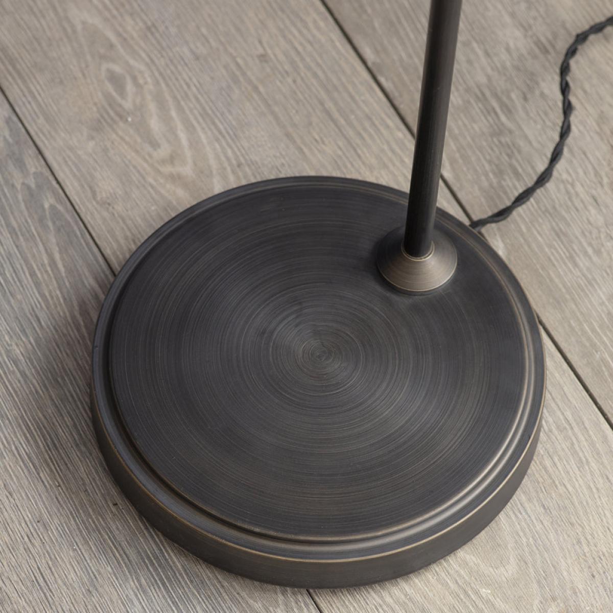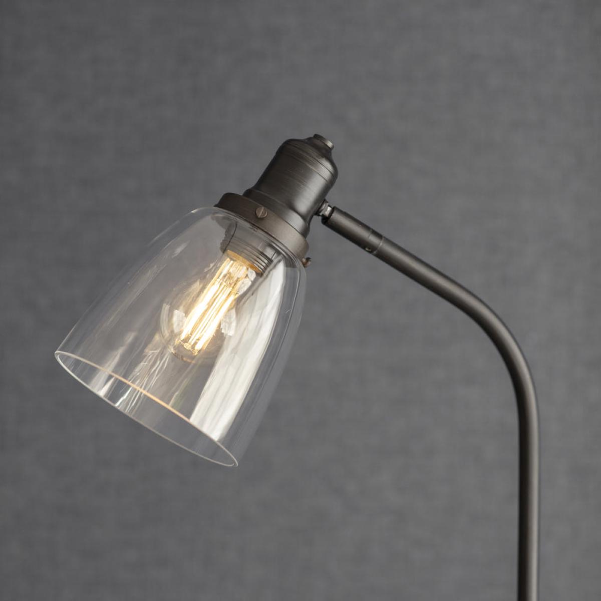 The Hoxton dome floor lamp is an elegant free-standing structure made of slim black steel with an antique bronze finish. The round base is sturdy with a mesmerising swirling pattern whilst the pole. View More. The Hoxton dome floor lamp is an elegant free-standing structure made of slim black steel with an antique bronze finish. The round base is sturdy with a mesmerising swirling pattern whilst the pole extends upwards, gently curving to meet the bulb which is encased in a clear glass shade. This lovely lamp is activated via a button on the electrical cable which attaches from the base of the lamp to the wall socket, thus keeping the structure of the lamp free from buttons and switches. This lamp is 150cm tall which is ideal for casting the perfect glow for reading.