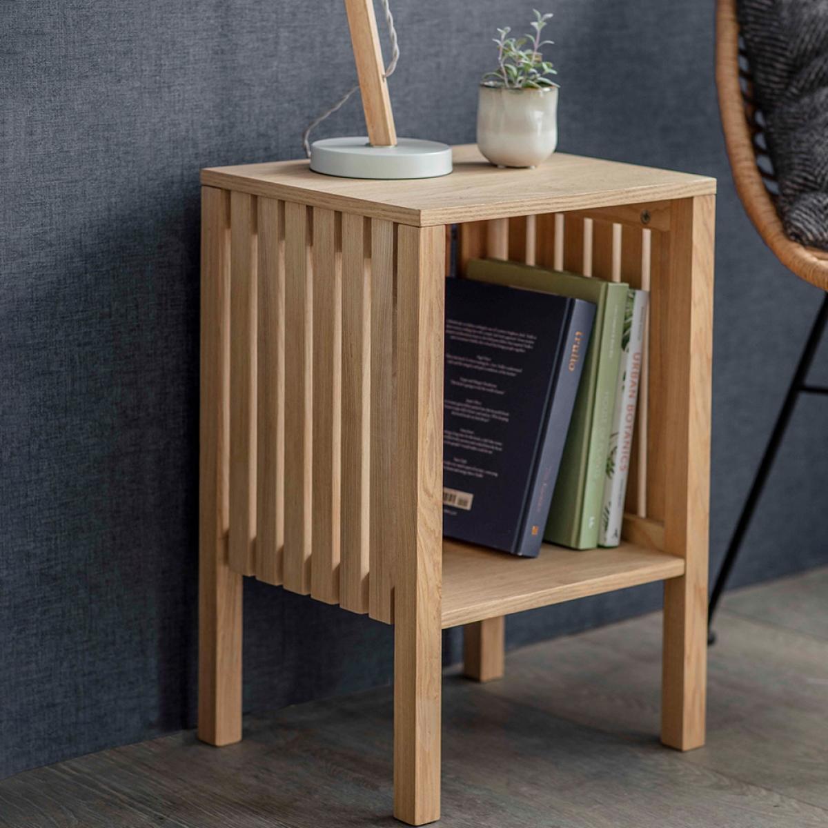 Bring a fresh and light feel into your interiors with the Garden Trading Linear Side table. With its cut out design and light ash finish, this piece will be perfect popped next to the sofa. Why not pop a lamp on top, ideal for the evenings when you want to curl up with a good book on your favourite armchair, when you're finished you can even tidy your books away on the lower shelf! Don't just limit this piece to the living room! Why not double them up on either side of your bed, perfect for the dreaded alarm clock!.