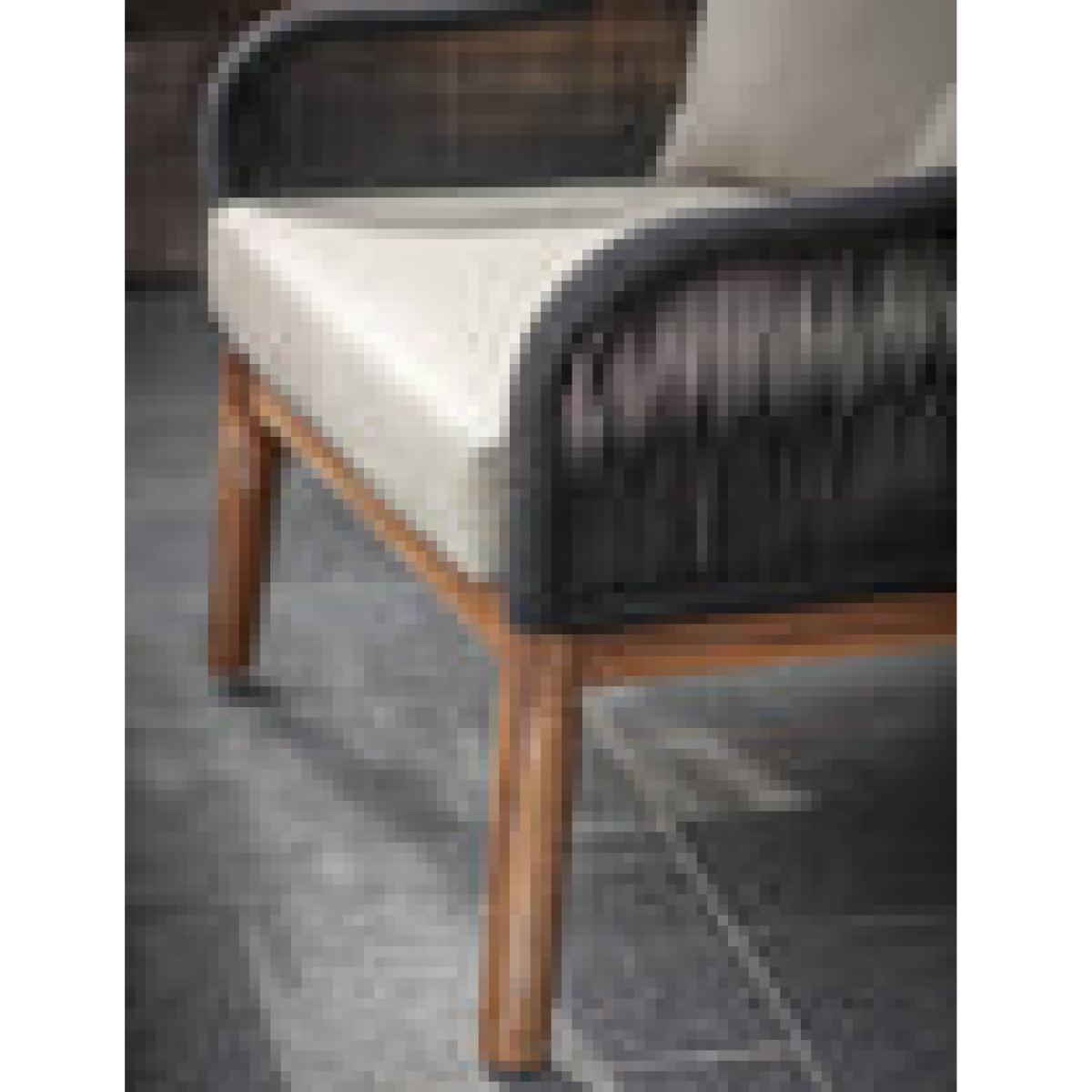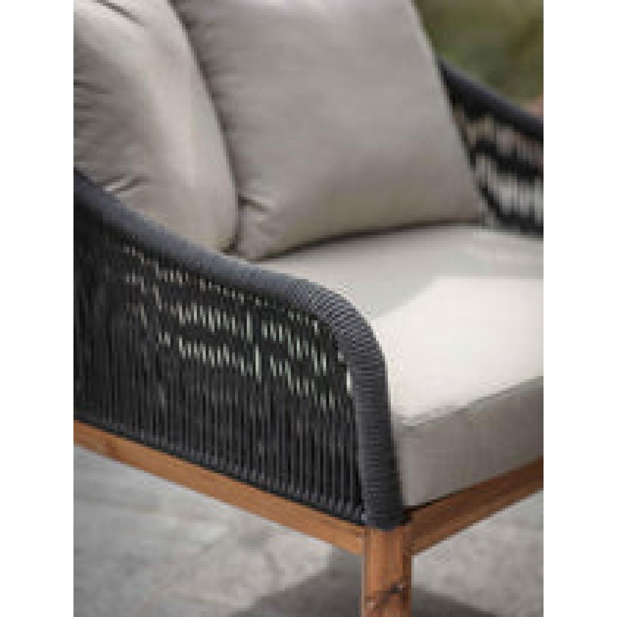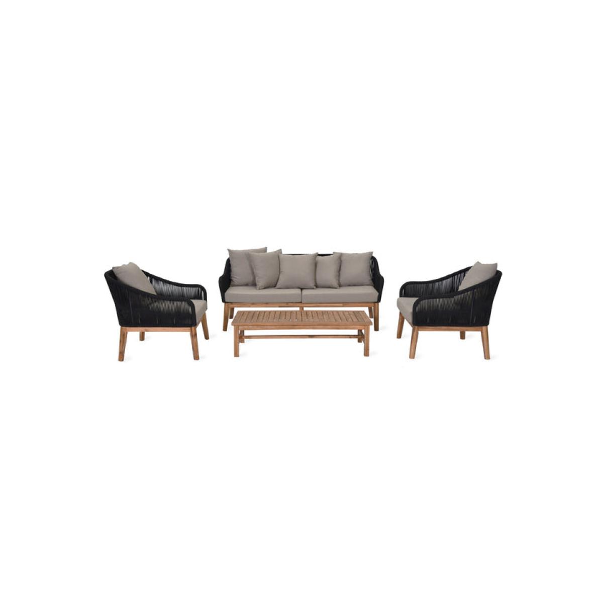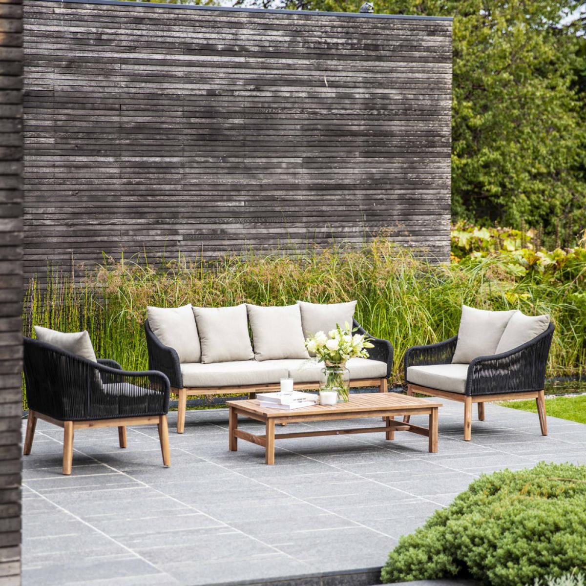 Enjoy al fresco living this summer with the Luccombe sofa set. The base of each seat is crafted from sturdy Acacia, and wrapped by an innovative woven black polyrope seat frame that is lightweight. View More. Enjoy al fresco living this summer with the Luccombe sofa set. The base of each seat is crafted from sturdy Acacia, and wrapped by an innovative woven black polyrope seat frame that is lightweight and easy to transport around. The styling takes inspiration from mid-century designs, with clean lines and slim tapered legs. The Luccombe set also features a simple, contrasting colour palette of black and grey which helps it blend perfectly into most garden or patio styles. The set is perfect for outdoor decking areas and also for conservatories - providing relaxed seating for enjoying the great outdoors, even from indoors.