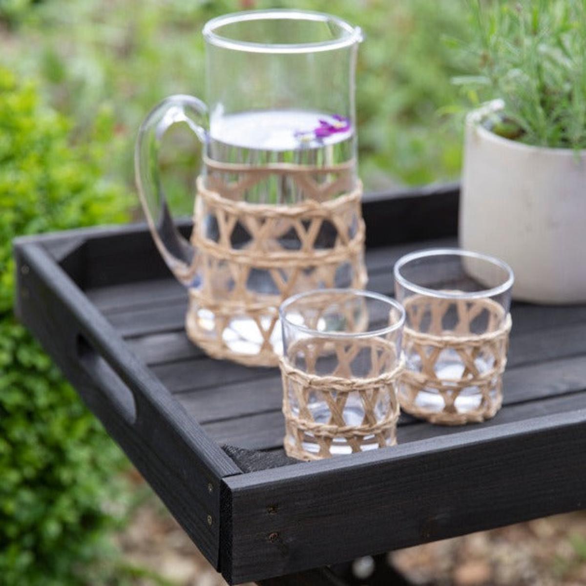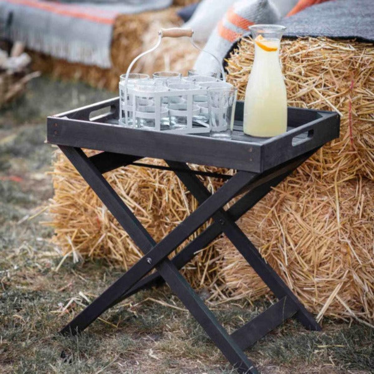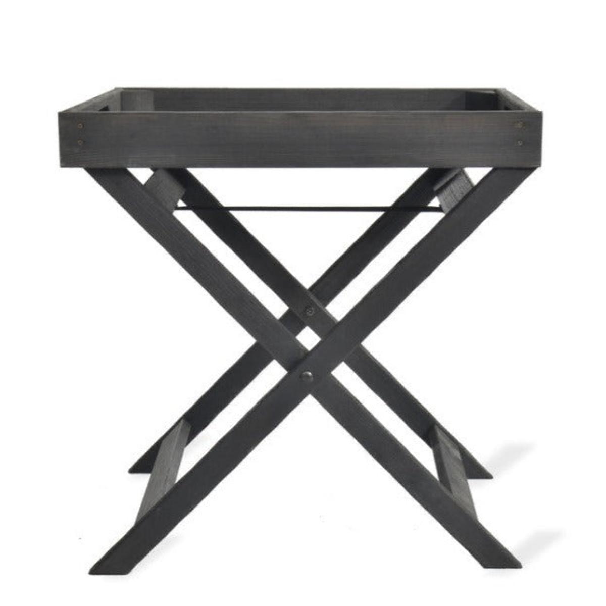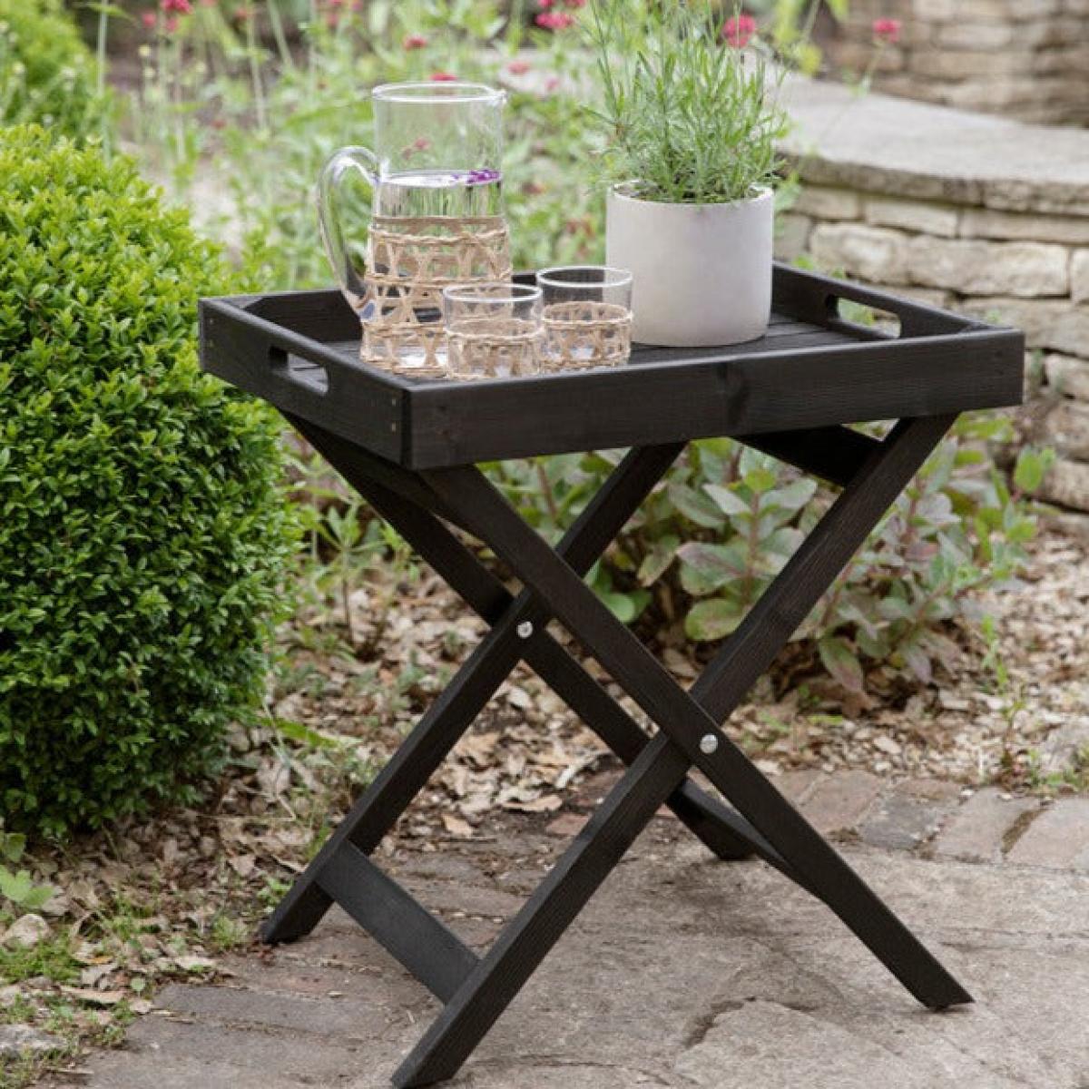 The versatile Moreton Tray Table can be used indoors or out - wherever extra storage is needed. The black weatherproof stained Spruce legs are fully foldable with the moveable tray slotting onto. View More. The versatile Moreton Tray Table can be used indoors or out - wherever extra storage is needed. The black weatherproof stained Spruce legs are fully foldable with the moveable tray slotting onto the top. With two cut out handles, the tray can be easily transported around the home and garden: whether piled with pots and planters or drinks and nibbles. Part of the modern Moreton collection it also works well alongside outdoor furniture and seating for a side table.