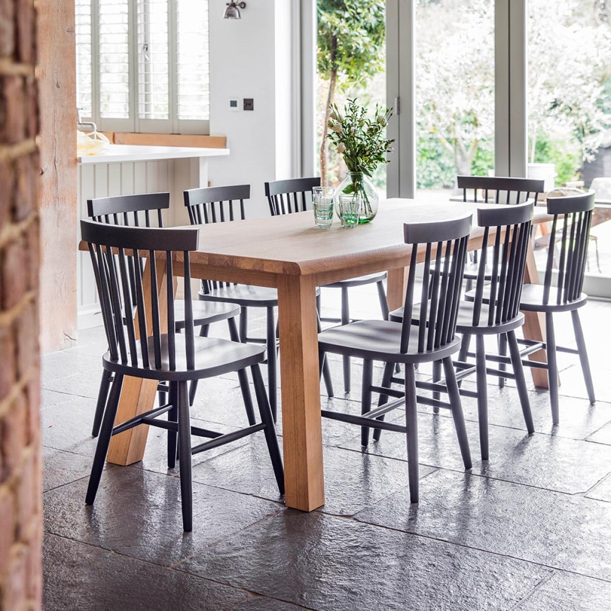 Give your dining area that revamp it has been after with the Oakridge Dining Set with Spindle Back Chairs from Garden Trading, this gorgeous set is just what you've been looking for. With eight carbon spindle back chairs included, it's ideal for Sunday roasts with the family or a cosy spot for those dinner parties with friends. With their classic design and curved back, they will not only be a stylish addition but a comfy one too. Beautifully manufactured, the tabletop features a gentle curved edge that adds a rustic charm whilst the chunky legs give this stunning table a contemporary feel. So, whether in the kitchen or the dining room the Oakridge table will be a wonderful centrepiece.