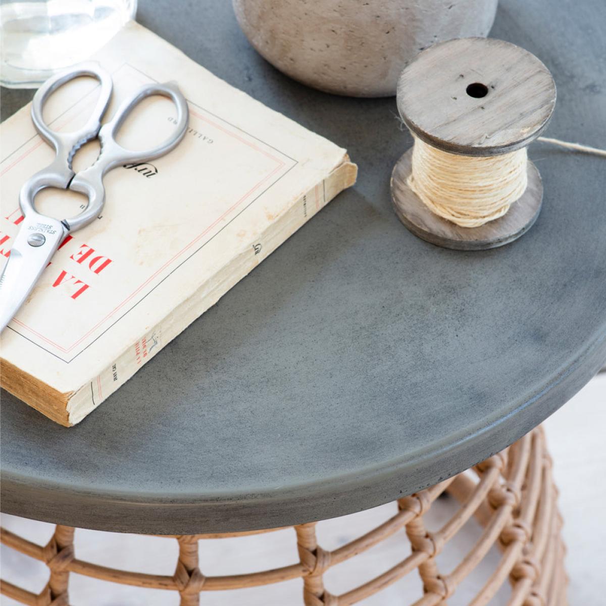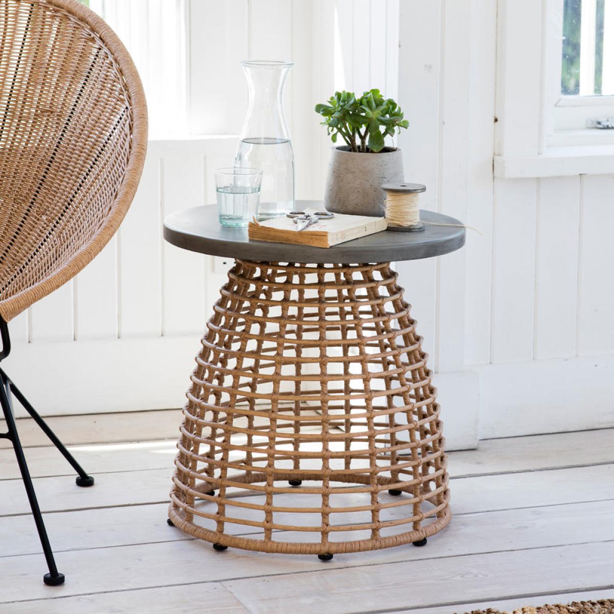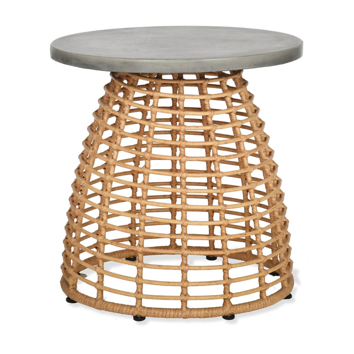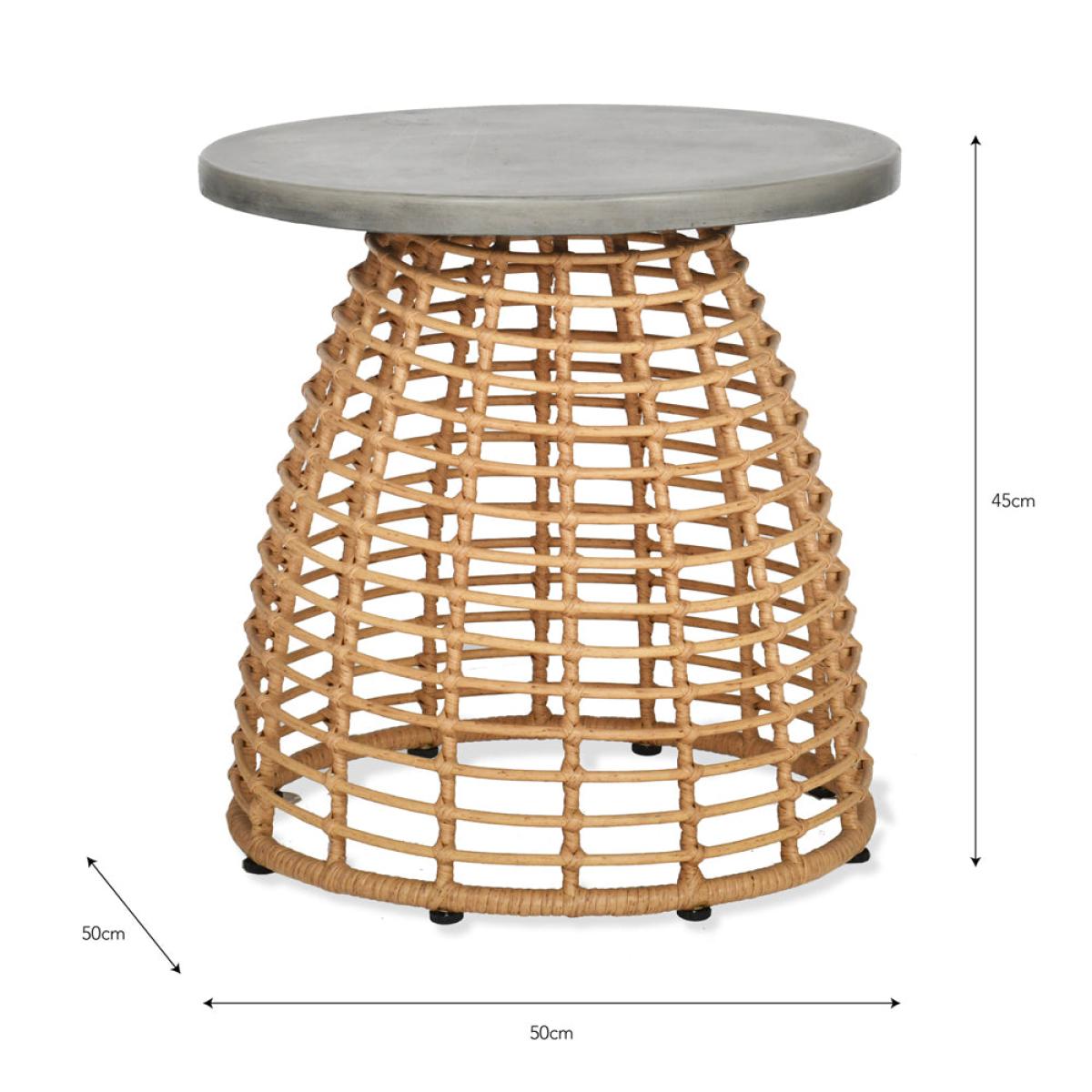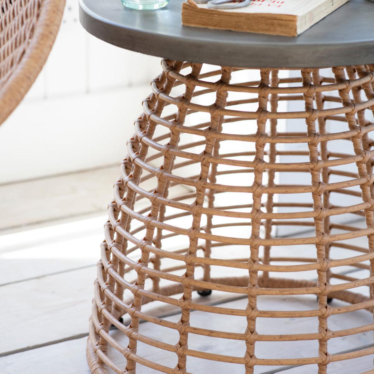 A side table with a difference and part of our bestselling Hampstead collection, this is the perfect piece to place beside an indoor sofa or armchair. The bullet shaped open weave base has been cra. View More. A side table with a difference and part of our bestselling Hampstead collection, this is the perfect piece to place beside an indoor sofa or armchair. The bullet shaped open weave base has been crafted from strips of PE bamboo intricately wrapped and criss-crossed over the powder coated steel frame. This gives the piece a lightweight, Scandinavian inspired aesthetic. We've contrasted the natural coloured base with a grey rolled edge Resin top that has the appearance of industrial concrete. With a diameter of 50cm, the Hampstead Side Table offers ample room for a multitude of items. Designed to be used indoors only we recommend wiping the surface if any spillages occur to avoid staining.