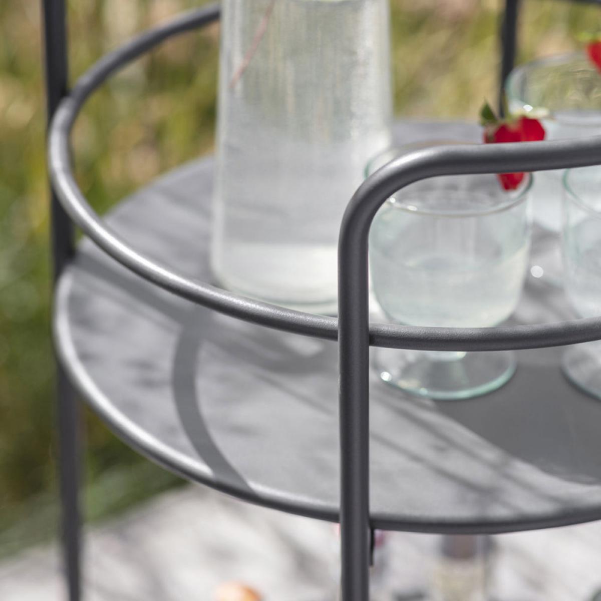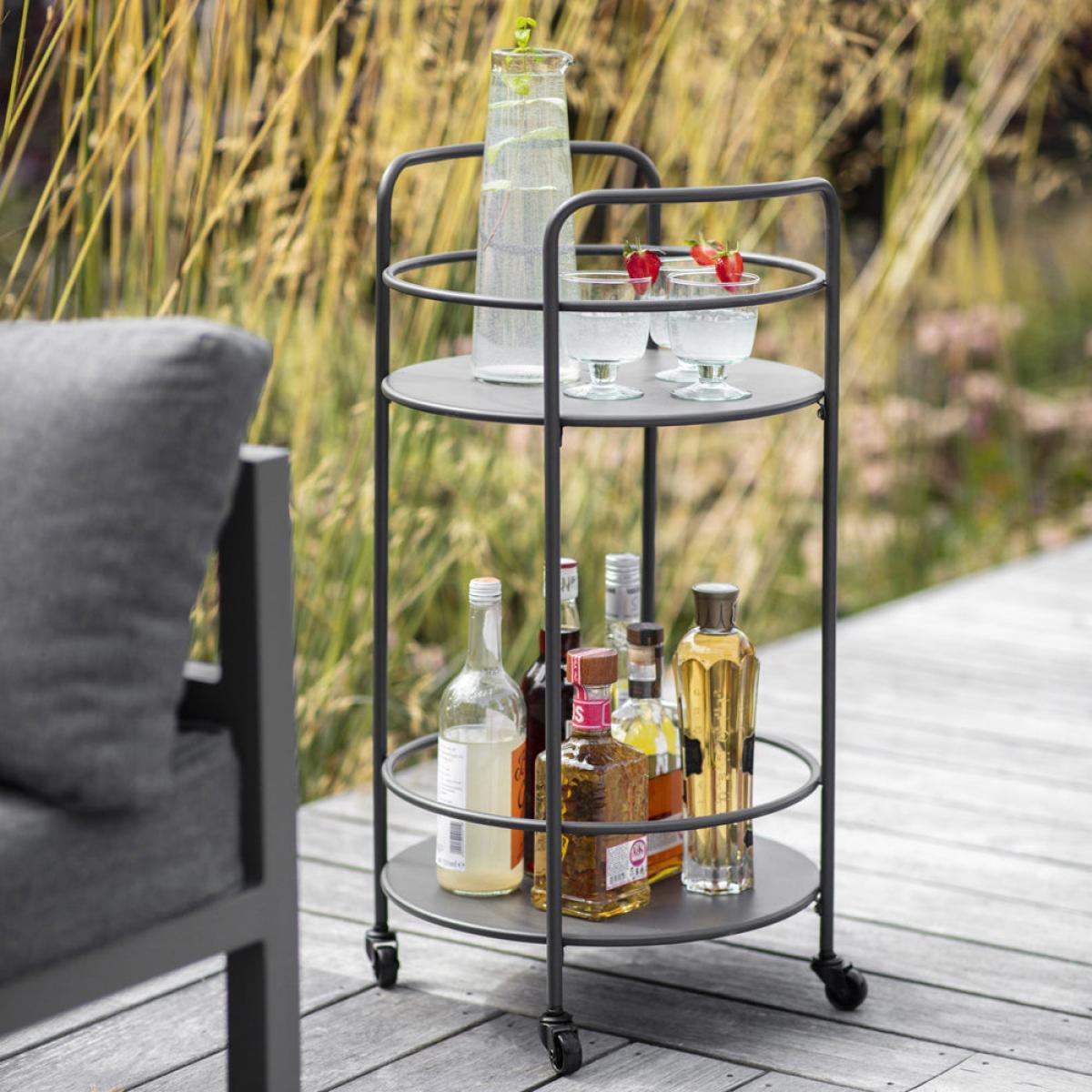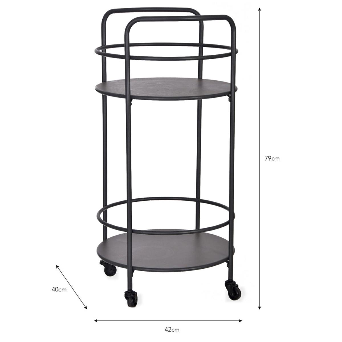 Display your alcohol collection indoors and out on the Round Drinks Trolley. Display mixers and ice on the lower tier and pour and serve at the top with. Perfect for that fresh G&T, glass of fizz or your signature cocktail. We also love it used indoors too, beside an armchair or in an alcove for that evening tipple. Dimensions: H: 79 x W: 42 x D: 40 cm Materials: Powder Coated Steel Assembly Required: No Care Instructions:Wipe clean with a clean, soft, damp cloth. Dry with a link free microfibre cloth.