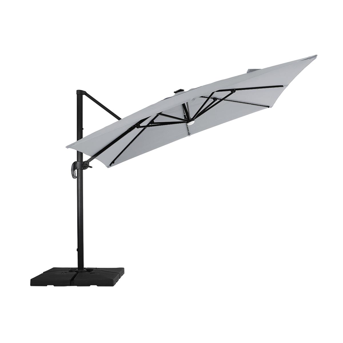 Escape the sun in style with the Garden Umbrella Cantilever Parasol. Crafted from a durable metal frame, this square parasol is designed to provide shade on hot, sunny days. Its weather-resistant polyester canopy ensures it can withstand all sorts of weather, making it perfect for outdoor use. The convenient crank mechanism and adjustable handle allow you to effortlessly customize the shading angle. With a 360-degree rotating base, you can effortlessly adjust its direction without needing to relocate the entire parasol. Each rib is equipped with solar-powered LED light beads, lighting up your outdoor enjoyment at night.