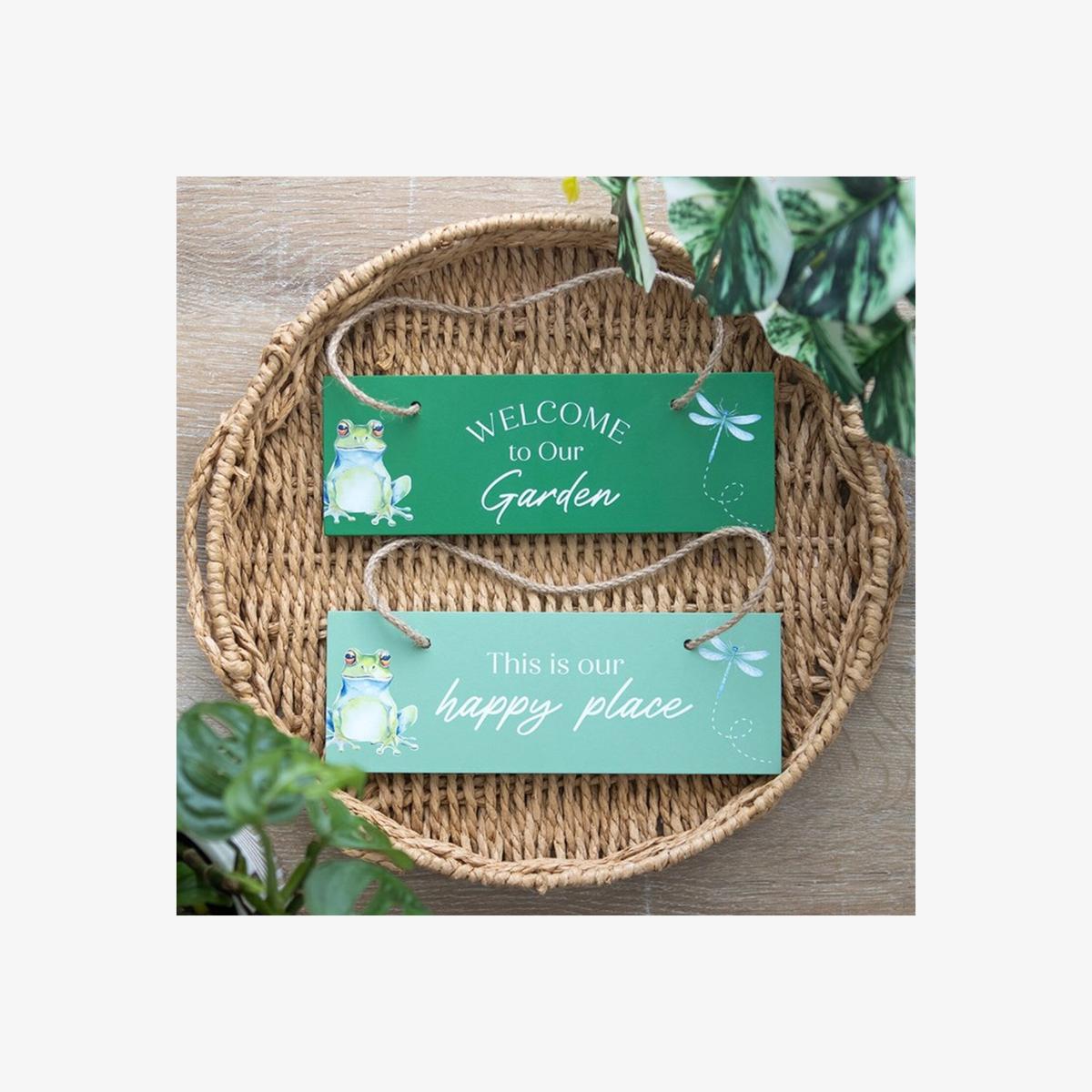Invite guests into your beautiful garden with this delightful green MDF hanging sign. Featuring the welcoming phrase "Welcome to Our Garden", it features a sitting frog and a delicate dragonfly. Complete with a rustic rope hanger, this sign is ideal for adding a personal touch to any patio or entryway.