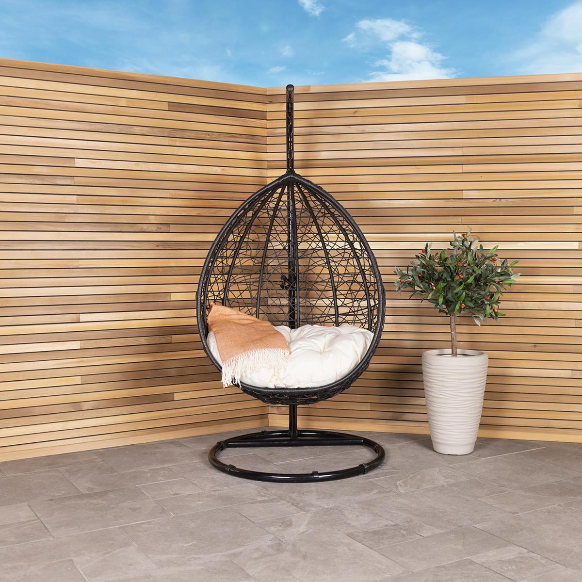 This unique and contemporary hanging black swing chair is perfect for relaxing and lounging in the garden. The chair can be kept outside, all year round due to its showerproof finish. Ideal for any sized garden or patio, the chair is made from rattan effect PE and includes a cushion for added comfort. FeaturesUV and fade resistant Showerproof (can be kept outdoors all year round)Machine washable cushion cover. Rotates and swings. Black poleMaterials. Polyethylene synthetic rattan Steel frame Polyester cushionsDimensionsH20. 0 x W99 x D73cm Chair size - H112 x W99 x D73cm. Seat height - 40cm (approx)Base steel tube thickness 2.8mm. Pole steel tube thickness 2.8mmWeights33kg