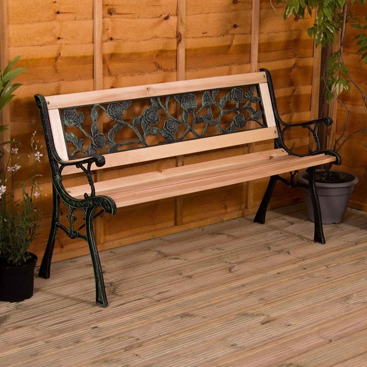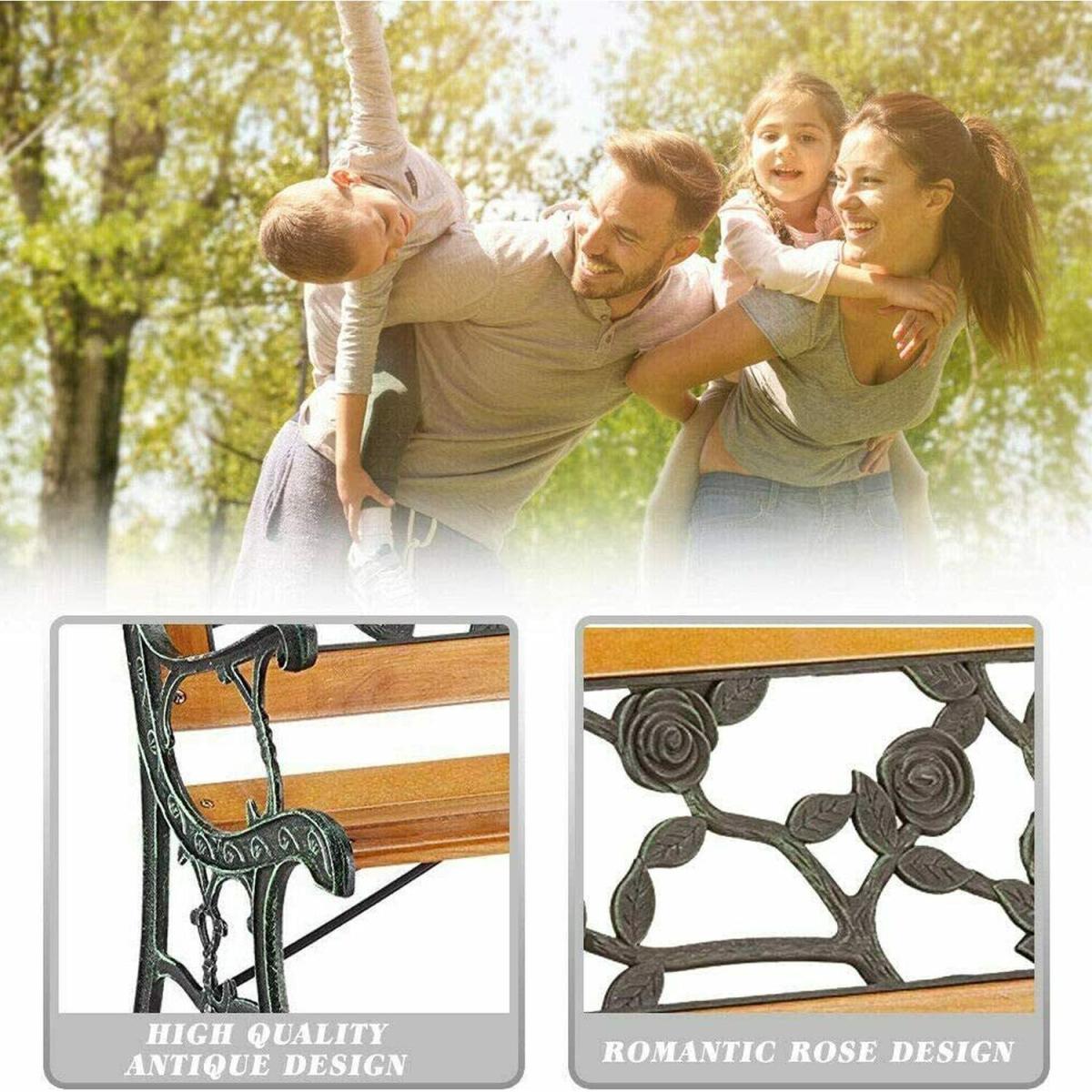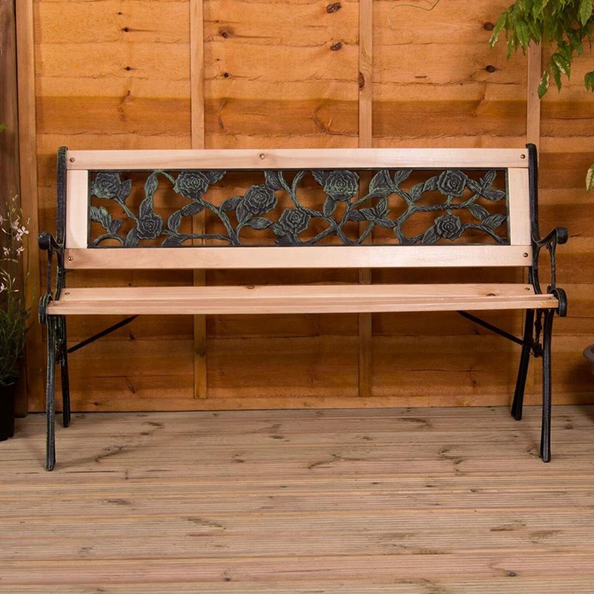 Bring some style and practicality to your outdoor space and provide your friends, family, and yourself somewhere comfortable to sit with this 3 Seater Garden Bench. Enjoy some alone time or a catch up with friends as you relax on this sturdy, durable, and weather resistant wooden garden bench. Perfect for when you need a place to sit in your garden, on your patio, or on your balcony, this bench is the ideal addition in the spring and summer. With a traditional build and stunning antique rose design to the rear, this bench looks beautiful when not in use, making a striking addition to any outdoor space. The sides and arms of this attractive 3 seater bench are made from heavy duty cast iron which is weather resistant and durable, able to hold up plenty of weight (up to three adults) and looks modern and stylish in your garden. You will need to assemble your new garden bench but with the simple to follow instructions, construction is quick and easy so you can enjoy your new bench as soon as possible!The slats of this outdoor bench are made from solid hardwood which is long lasting and able to withstand a lot of weather such as rain and snow. They're untreated so if you want to help them last even longer, you can apply a few coats of your favourite wood varnish to protect them
