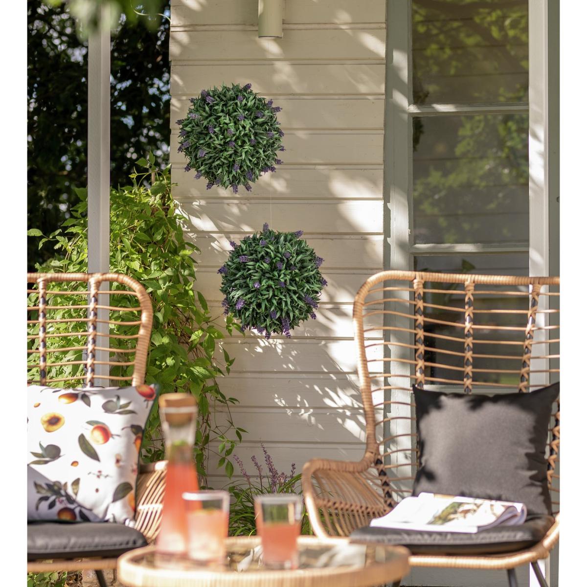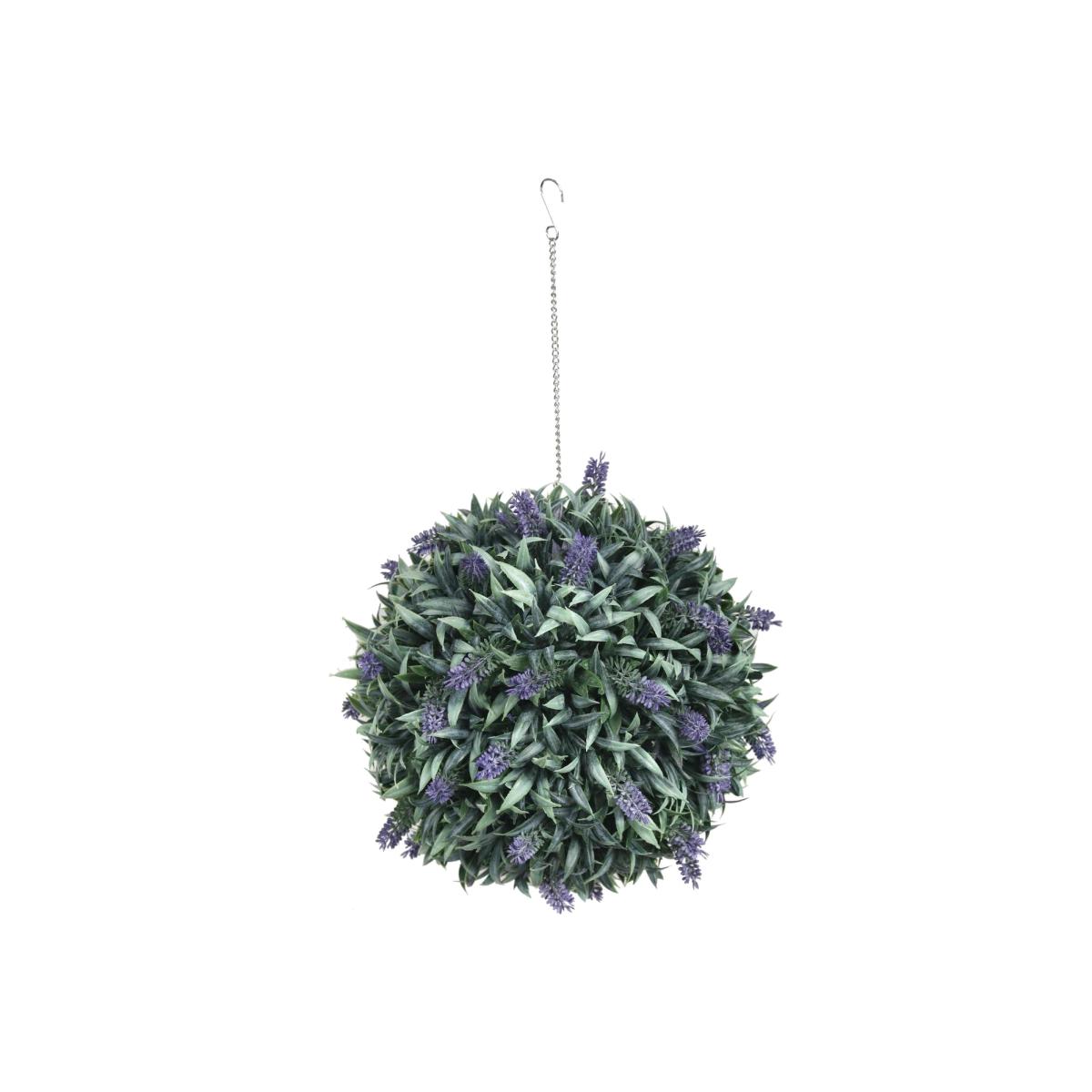 Liven up your living space with this bold and life-like topiary ball. The green leaves and gloriously purple with flowers are sure to brighten up your garden, no matter the weather. Made from a UV resistant, all weather plastic, it's the ultimate low-maintenance plant. They're no-maintenance! Simply hang wherever looks best (chain provided) and it will look spectacular all year round. Our topiary balls are UV protected and each ball is 28cm in diameter. No maintenance required. Suitable for indoor and outdoor use. Plant composition: polyethylene. Fade resistant. Frost resistant.