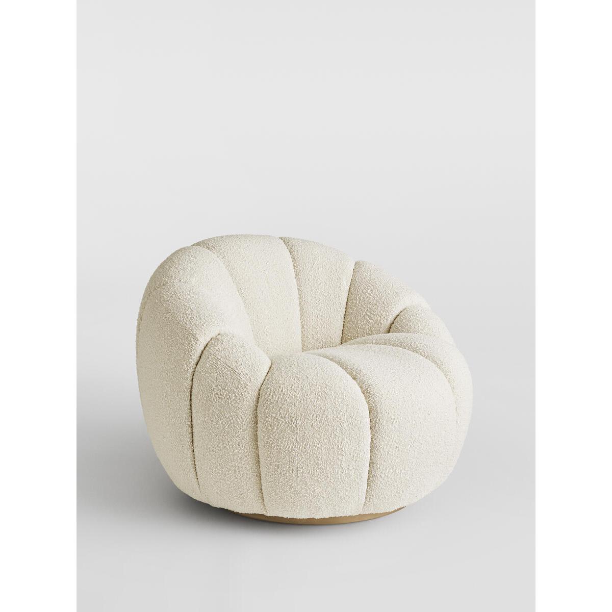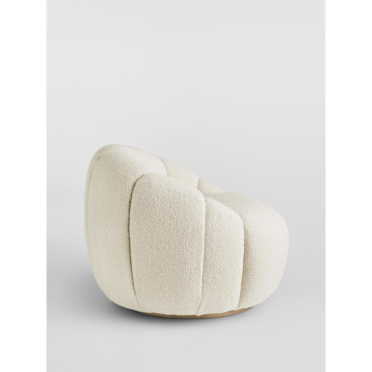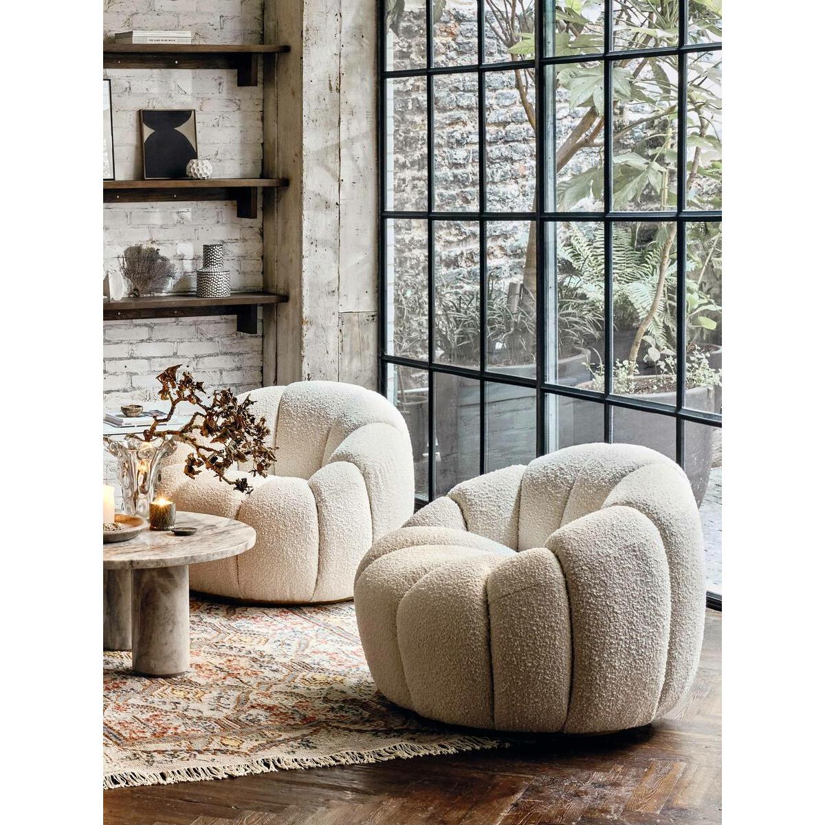 Shaped for optimal comfort and visual impact, the Garret swivelchair invites you to relax and sink into its undulating curves. Crafted from soft bouclé, it mirrors designs seen at DUMBO House in. Brooklyn. Hardwood frame. Bouclé upholstery. Inspired by DUMBO House.