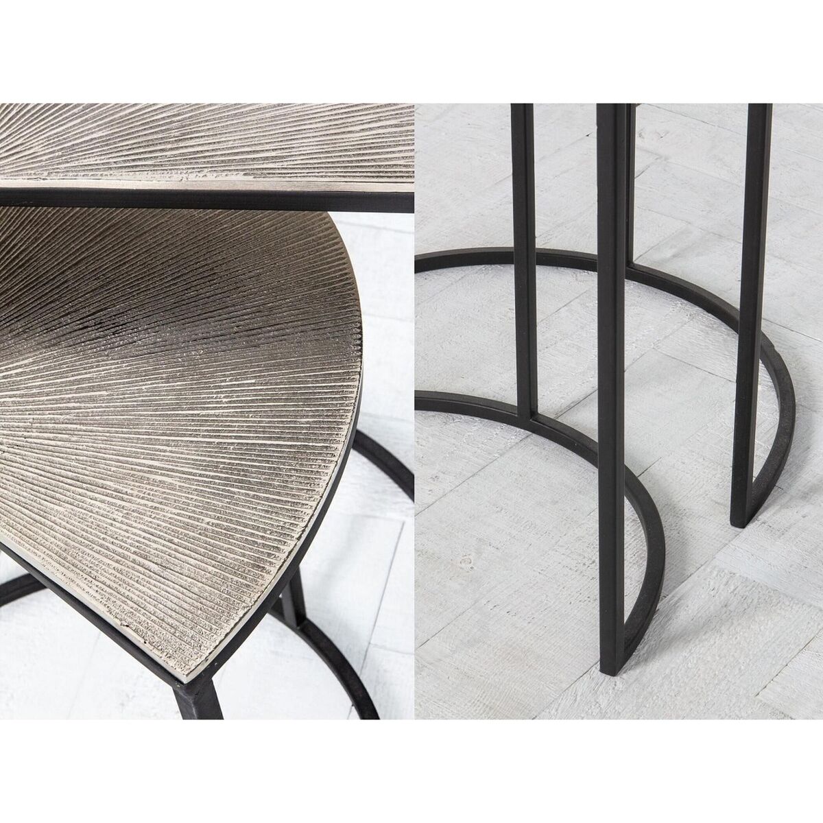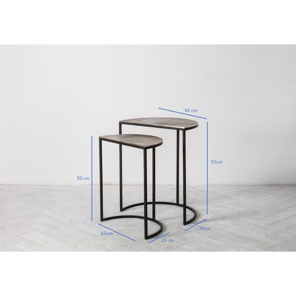 Discover the Gary nesting tables, a stylish duo that nod to minimalism and the metallics trend. The design of the Gary puts the focus on the contrast of textures, from the smooth Matt Black metal frame to the tactile, silver embossed tabletops. Add this stylish duo to modern interiors with dark colour palettes and place them close to a window to delight in their beautiful light reflections. The images are showing normal markings from the casting process, the technique is called Sand Casting where no machine is employed and everything is done by hand. The natural casting markings are caused when the molten metal cools down against contact with the sand filled inside the mould. For this reason, no two pieces are alike and that is the special inherent characteristic of product. It adds to the distinguished handmade look of the item. These pieces are not grinded for smoothness as it will take away the natural characteristic of product. The lines in the castings are not cracks and does not affect strength or integrity of product at all.
