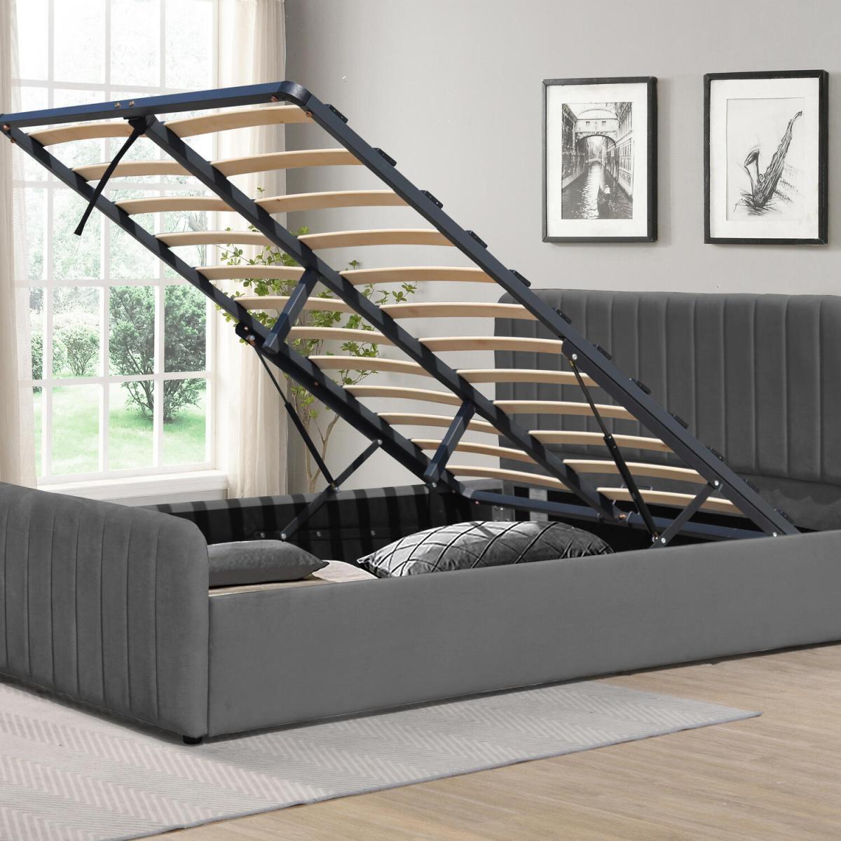 Transform your bedroom with this sophisticated ottoman bed frame, available in versatile black, light grey, or dark grey colours to complement any decor. The elegant vertical channel tufting along the headboard and frame adds a touch of luxury, while the robust gas lift mechanism provides effortless access to the spacious storage area beneath. Perfect for maximising space in your bedroom, this ottoman bed features a sturdy wooden slat system that offers reliable mattress support. The smooth-operating hydraulic system allows you to easily lift the bed base, revealing ample straight-to-floor storage space for bedding, seasonal clothing, or other items you wish to keep out of sight. Available in either 3ft, 4ft6 or 5ft sizes to suit your needs, this bed frame combines practicality with contemporary style. Please note that this frame is sold without a mattress, allowing you to pair it with your preferred mattress. The clean lines and premium upholstery make this ottoman bed a sophisticated addition to any bedroom setting. Please note that all dimensions are approximate; please allow room for slight variations.