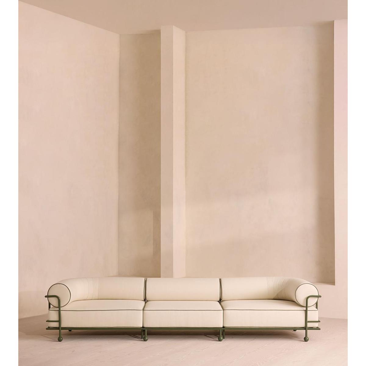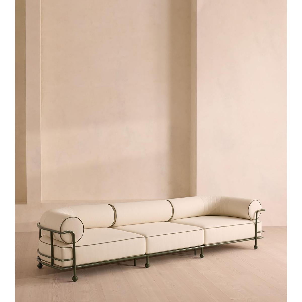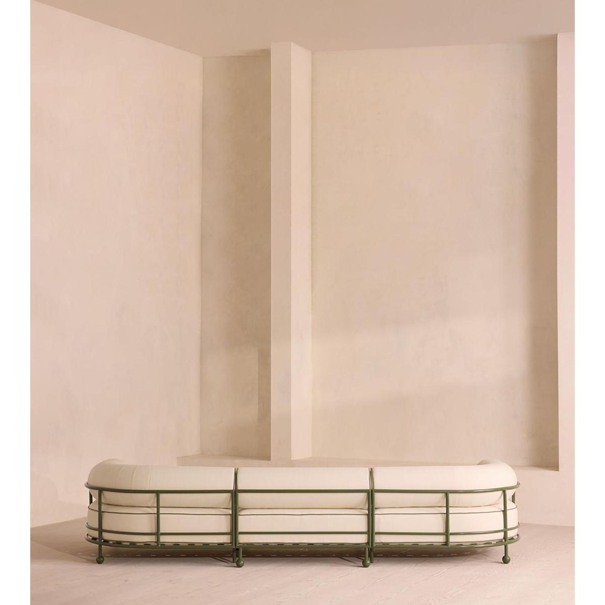 A modular silhouette in weather-resistant linen upholstery is designed to adapt to your outside space. Available in multiple sizes, the modular Gaspard sofa is designed for flexible outdoor seating. A deep sage-green stainless steel frame wraps around bolster cushions and extra-deep seats, each upholstered in a neutral linen that's suitable for outdoor use.