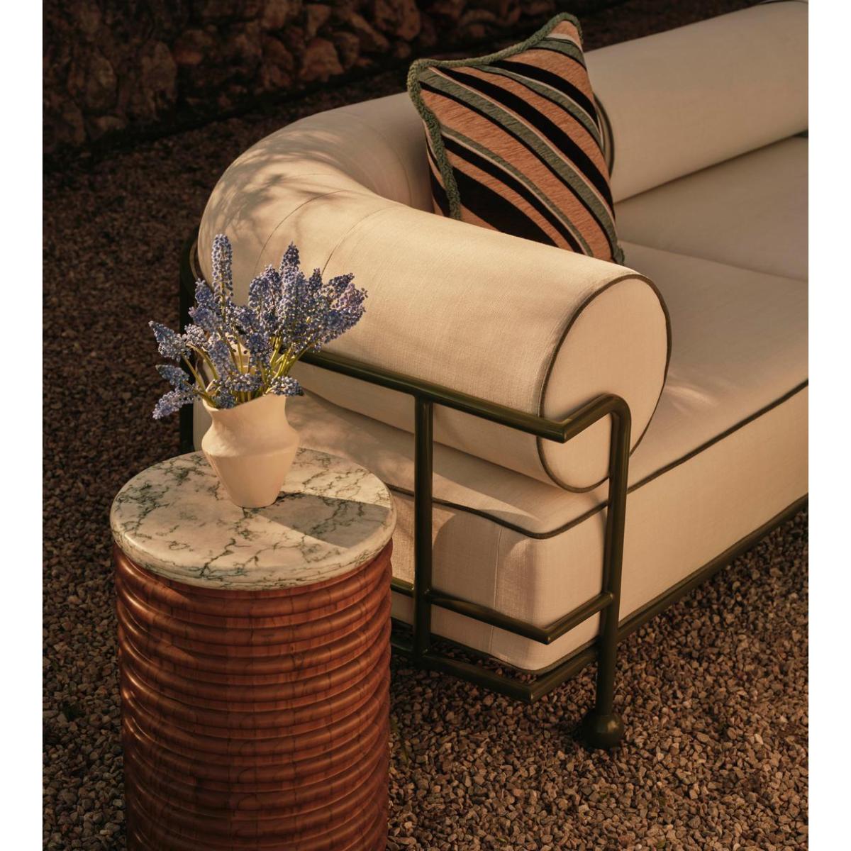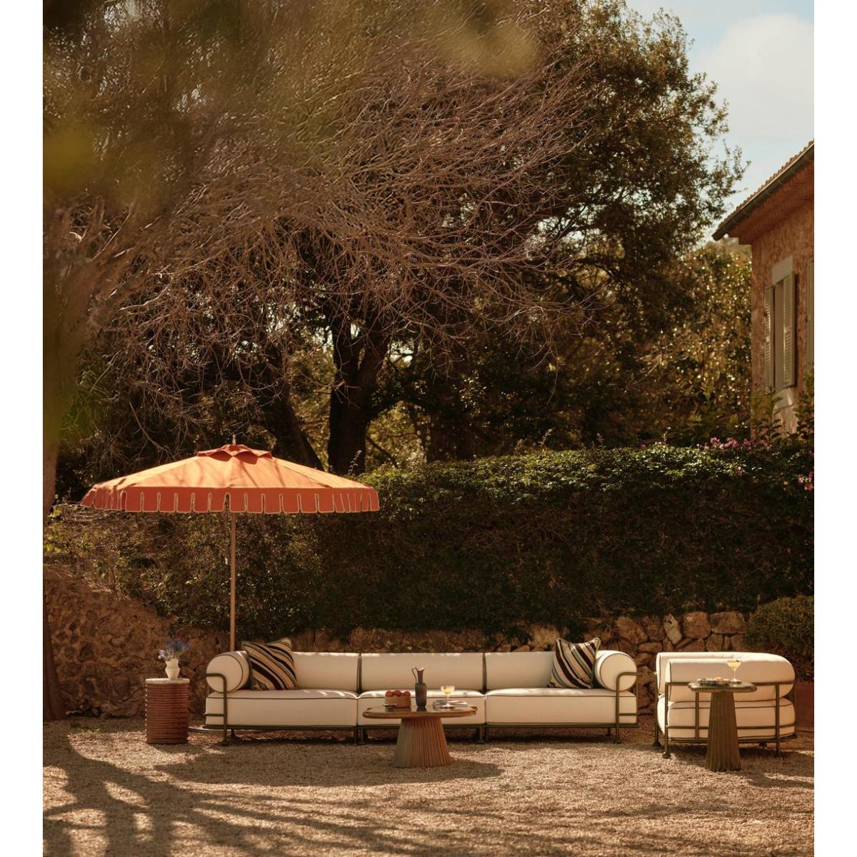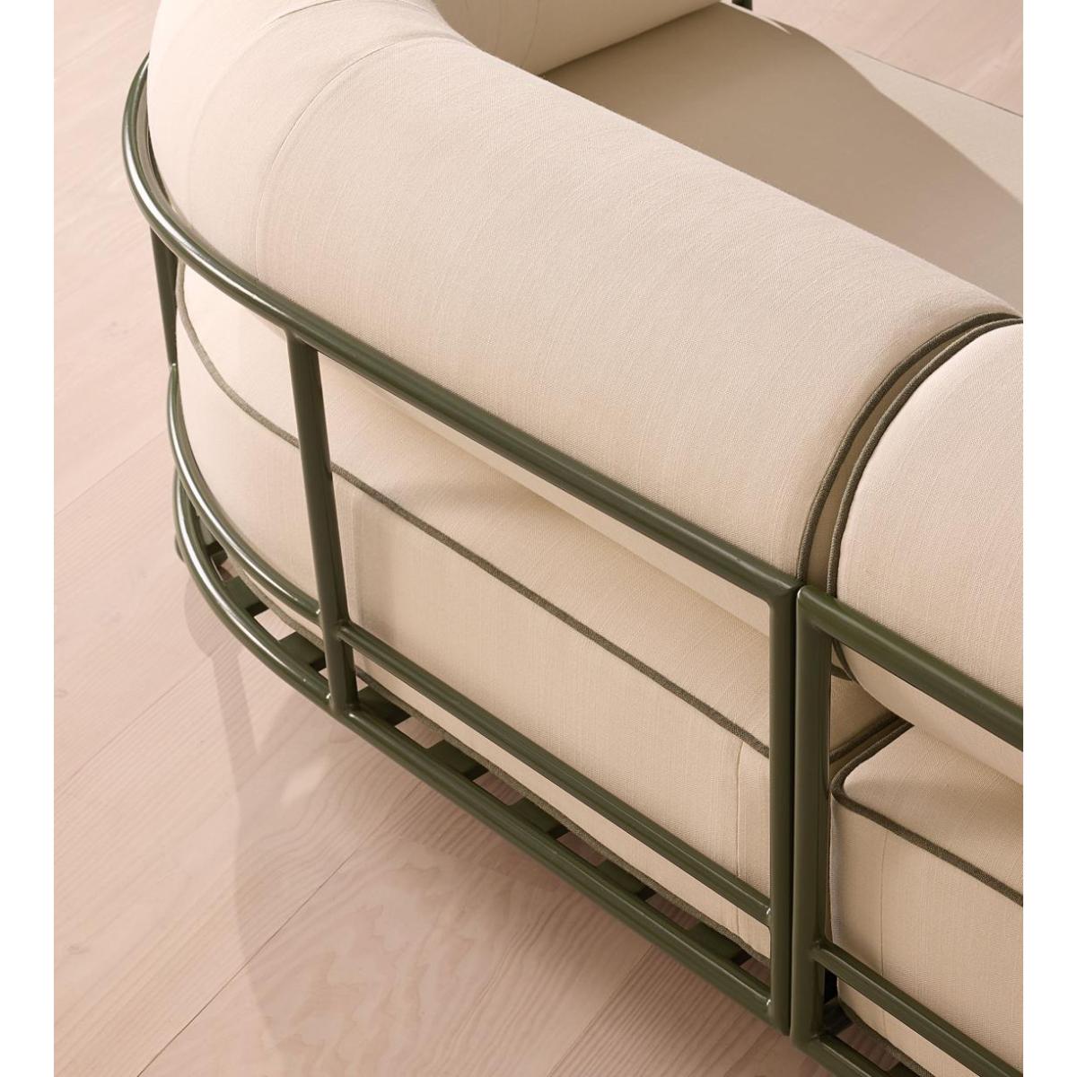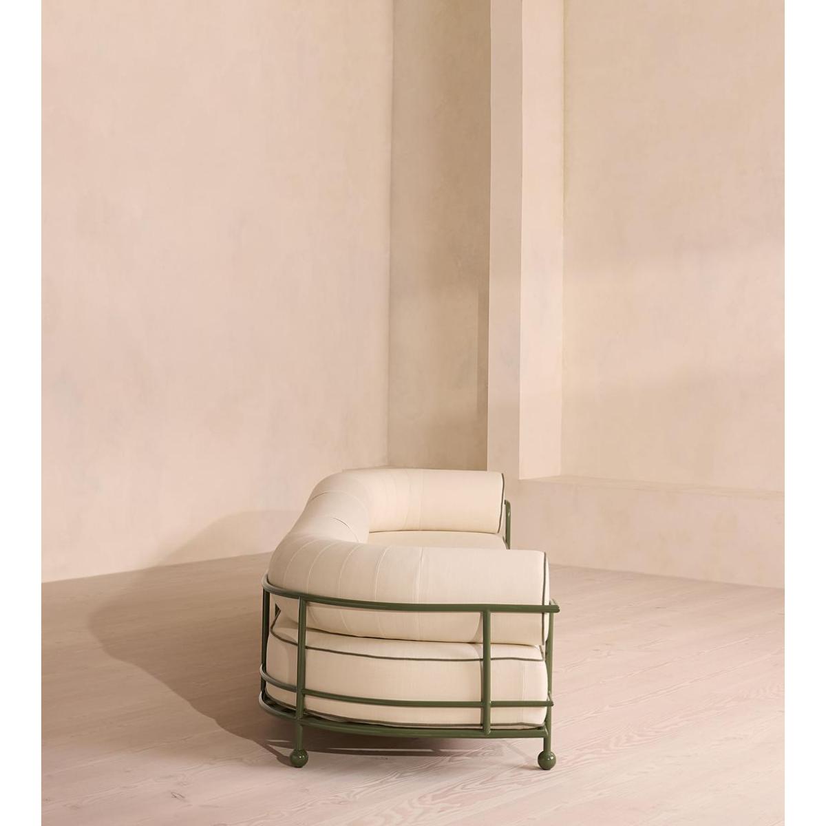 A modular silhouette in weather-resistant linen upholstery is designed to adapt to your outside space. Available in multiple sizes, the modular Gaspard sofa is designed for flexible outdoor seating. A deep sage-green stainless steel frame wraps around bolster cushions and extra-deep seats, each upholstered in a neutral linen that's suitable for outdoor use.