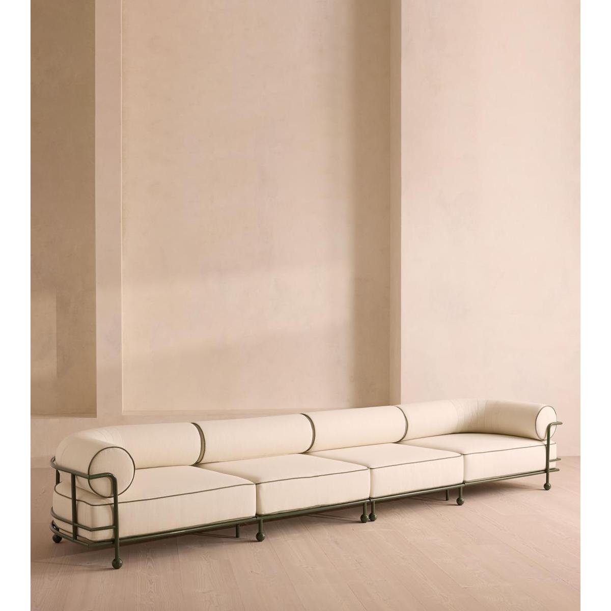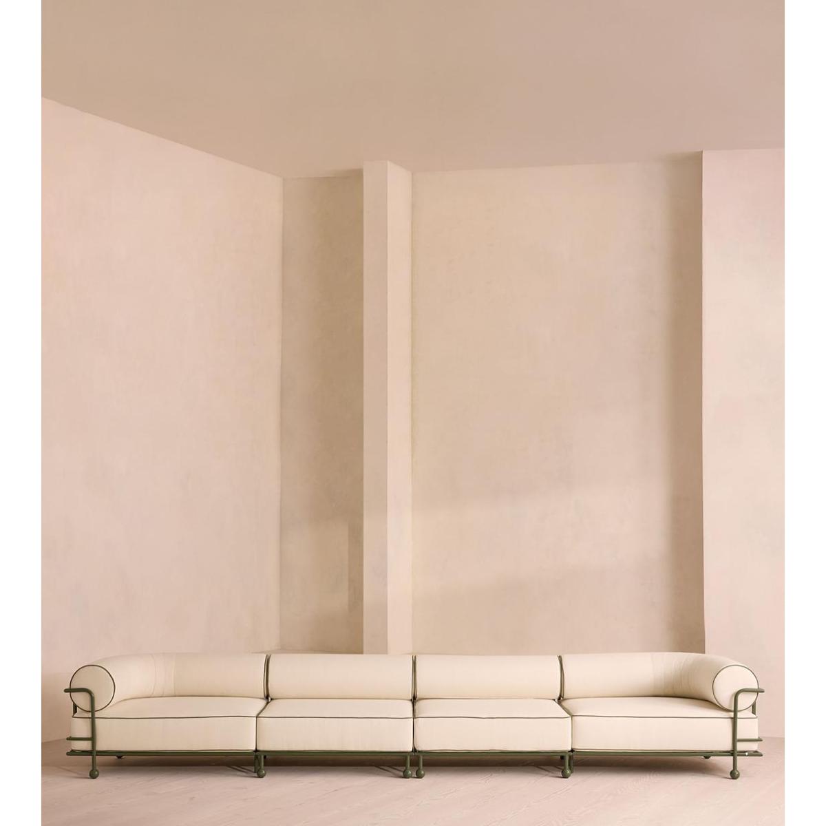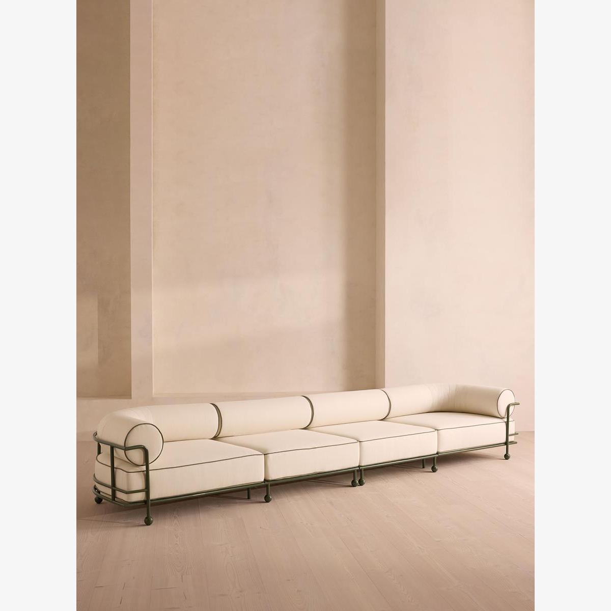 A modular silhouette in weather-resistant linen upholstery is designed to adapt to your outside space. Available in multiple sizes, the modular Gaspard sofa is designed for flexible outdoor seating. A deep sage-green stainless steel frame wraps around bolster cushions and extra-deep seats, each upholstered in a neutral linen that's suitable for outdoor use.