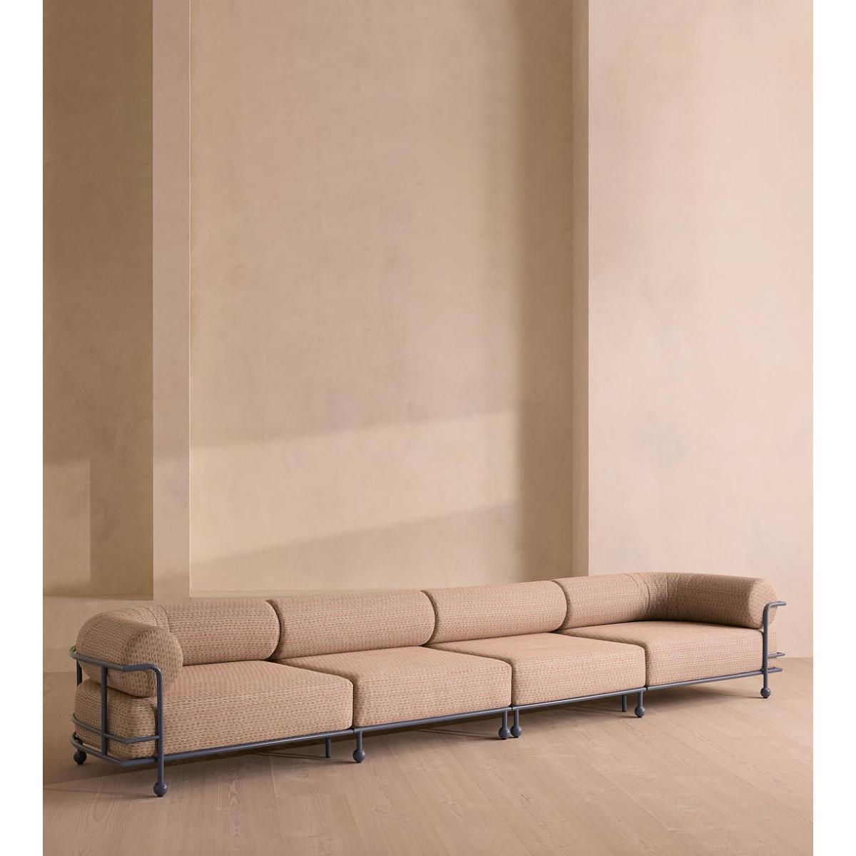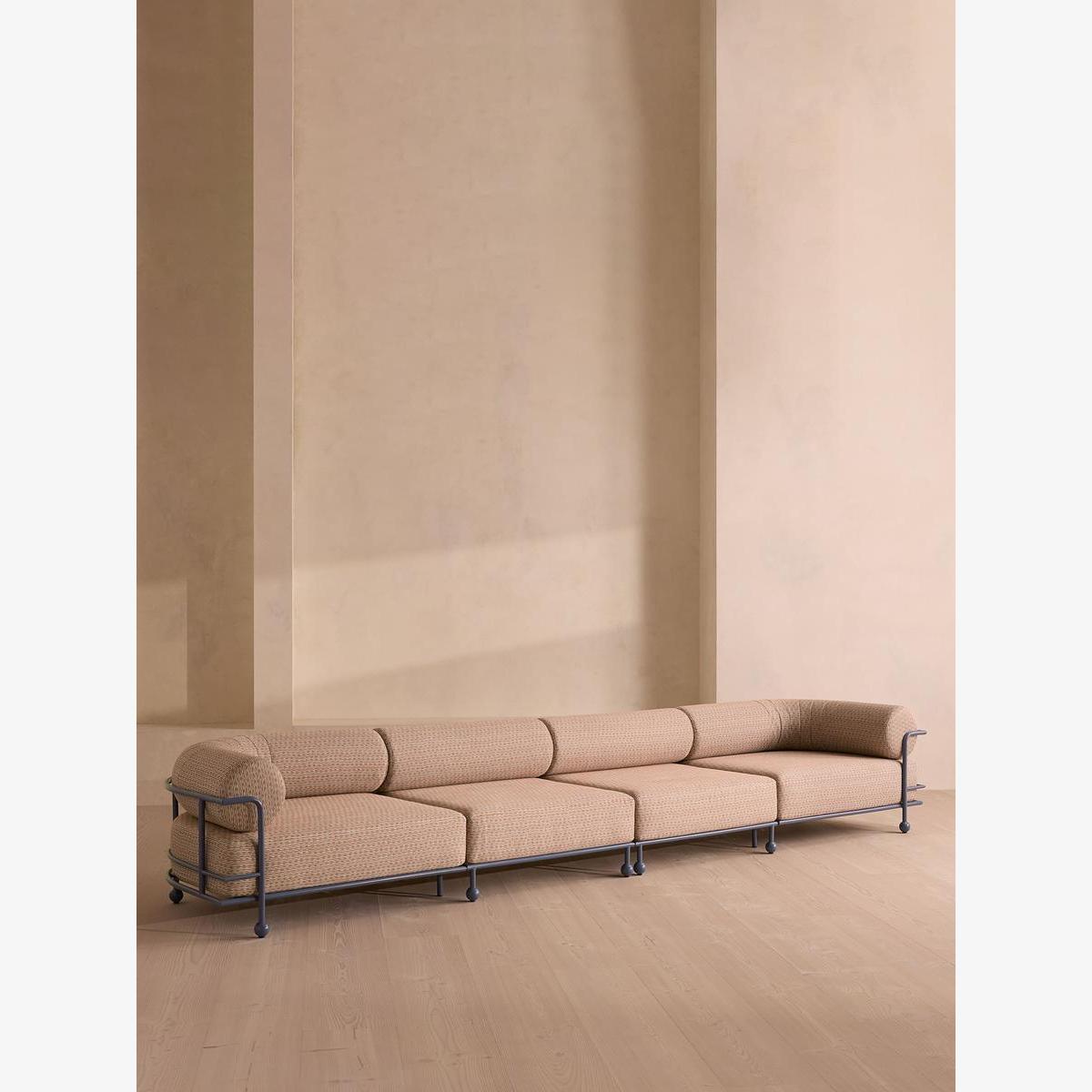 A modular silhouette in weather-resistant linen upholstery is designed to adapt to your outside space. Available in multiple configurations, the modular Gaspard sofa is designed for flexible outdoor seating. A deep green stainless steel frame wraps around bolster cushions and extra-deep seats, each upholstered in a small woven Ikat linen that's suitable for outdoor use.