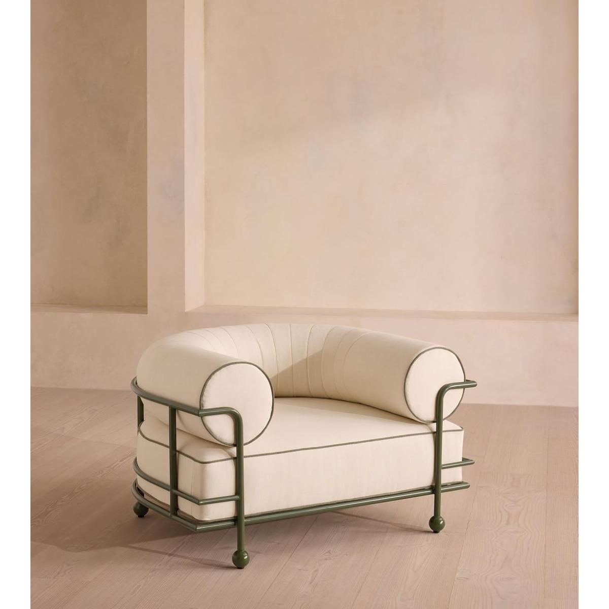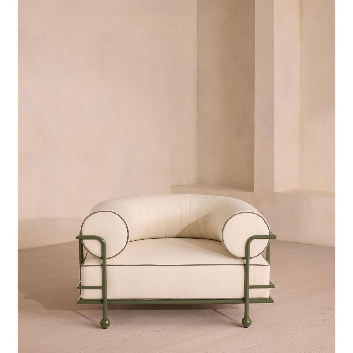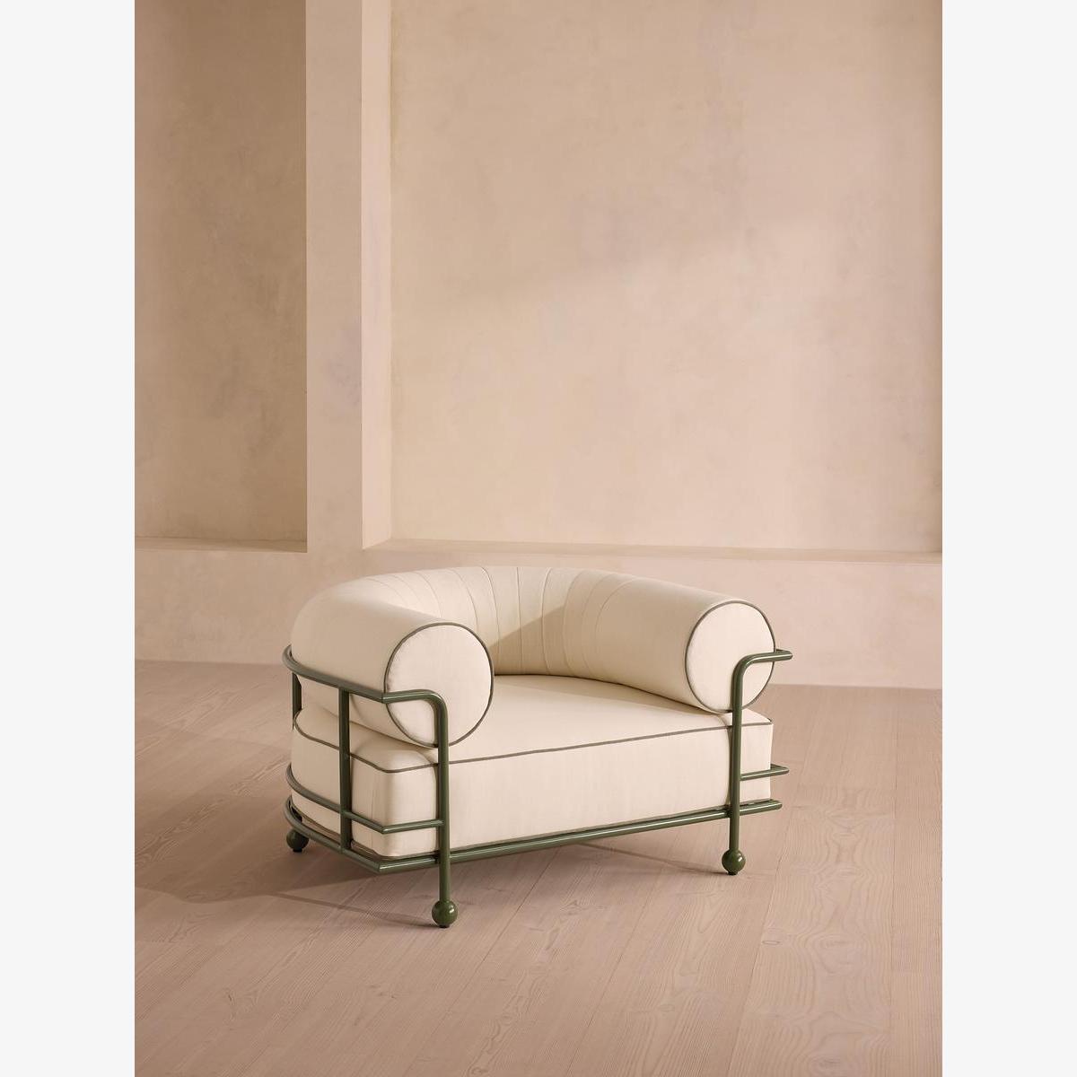 An olive-green stainless steel frame wraps around bolster cushions and an extra-deep seat upholstered in outdoor-safe linen. The Gaspard outdoor armchair is designed to be used solo, mix and matched with other outdoor furniture or paired with our Gaspard modular sofa for flexible seating options. Its rounded stainless steel frame wraps around an extra-deep seat and bolster cushions upholstered in a linen fabric that's suitable for outdoor use.