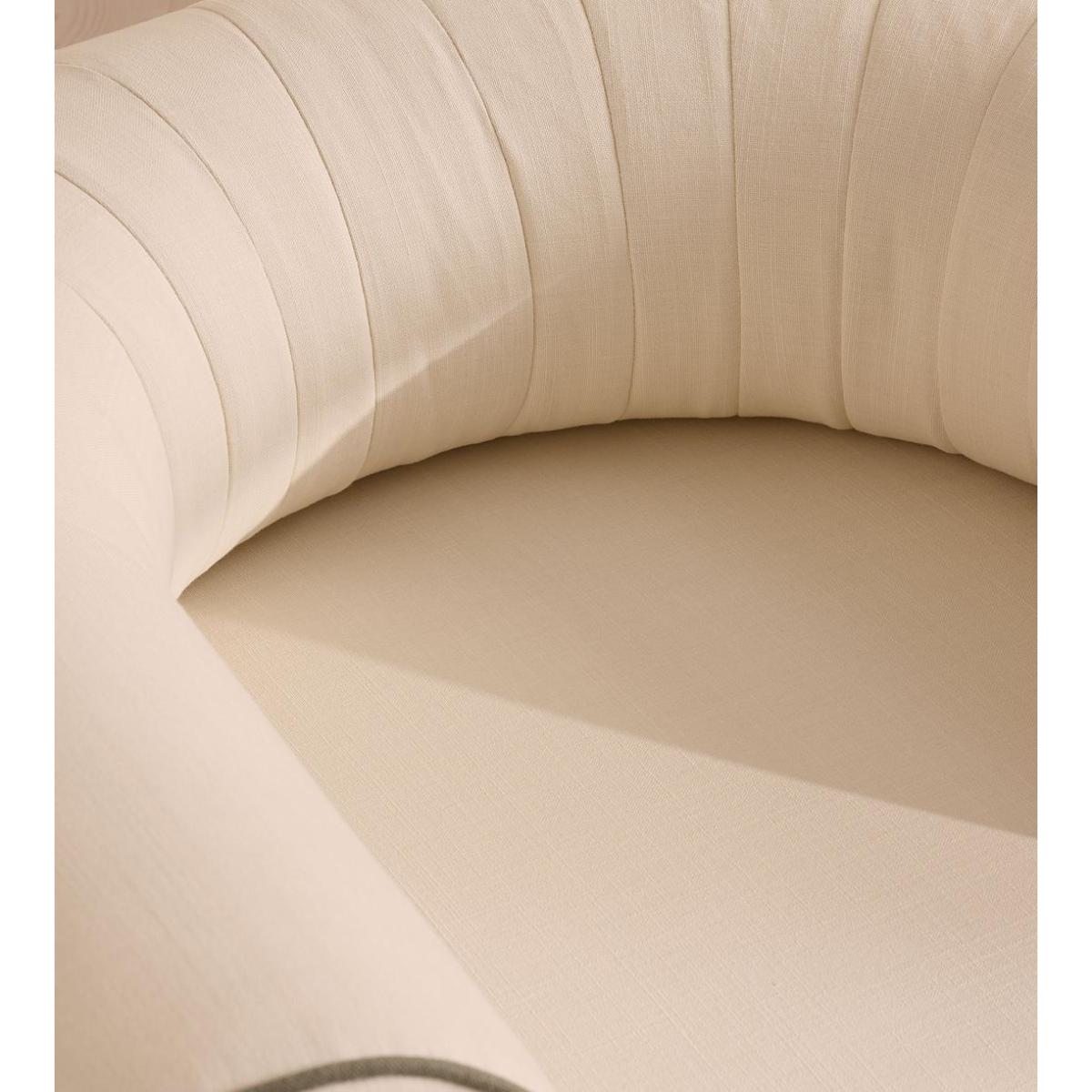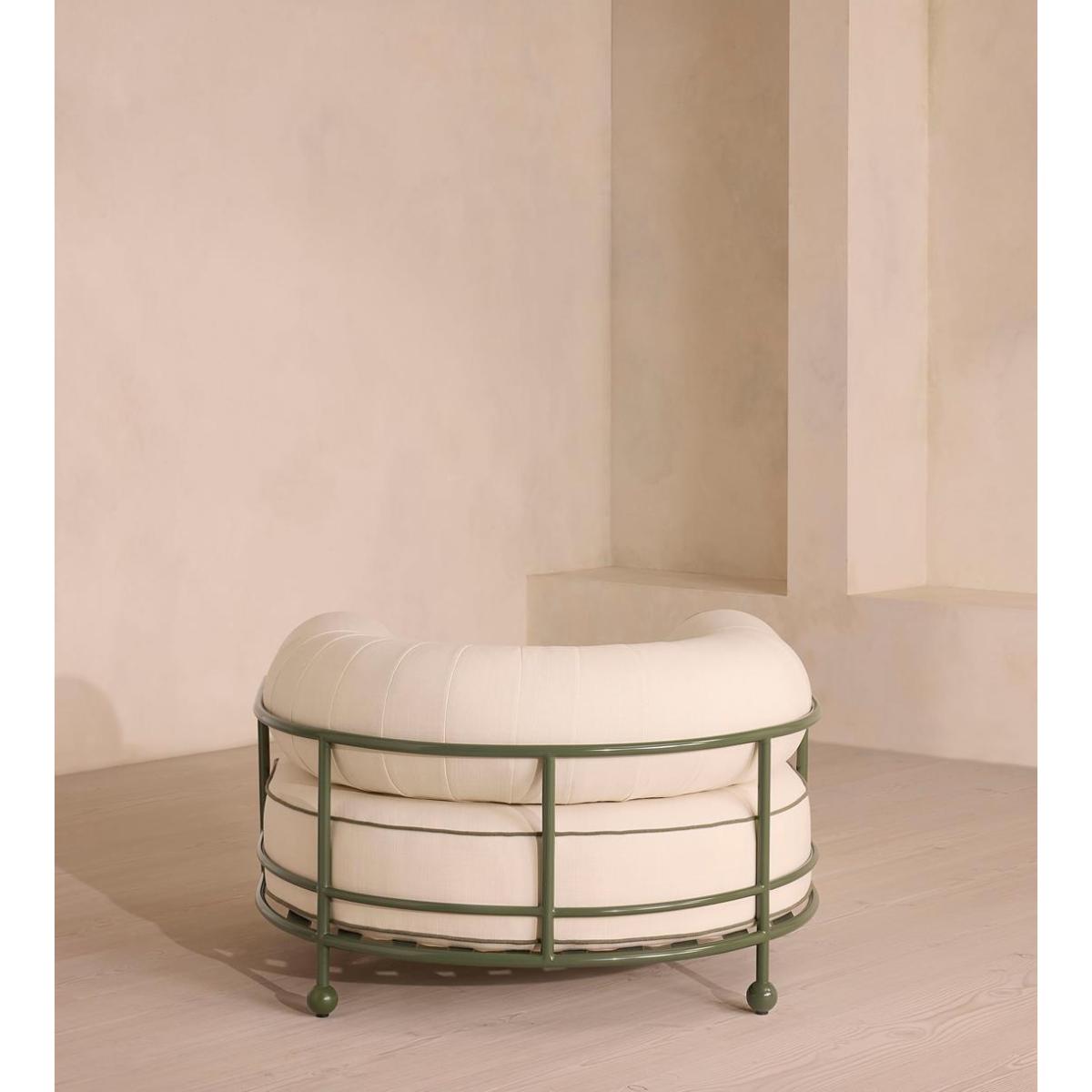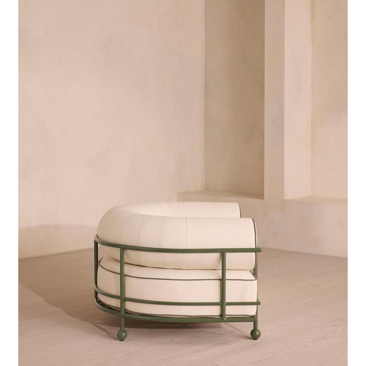 An olive-green stainless steel frame wraps around bolster cushions and an extra-deep seat upholstered in outdoor-safe linen. The Gaspard outdoor armchair is designed to be used solo, mix and matched with other outdoor furniture or paired with our Gaspard modular sofa for flexible seating options. Its rounded stainless steel frame wraps around an extra-deep seat and bolster cushions upholstered in a linen fabric that's suitable for outdoor use.