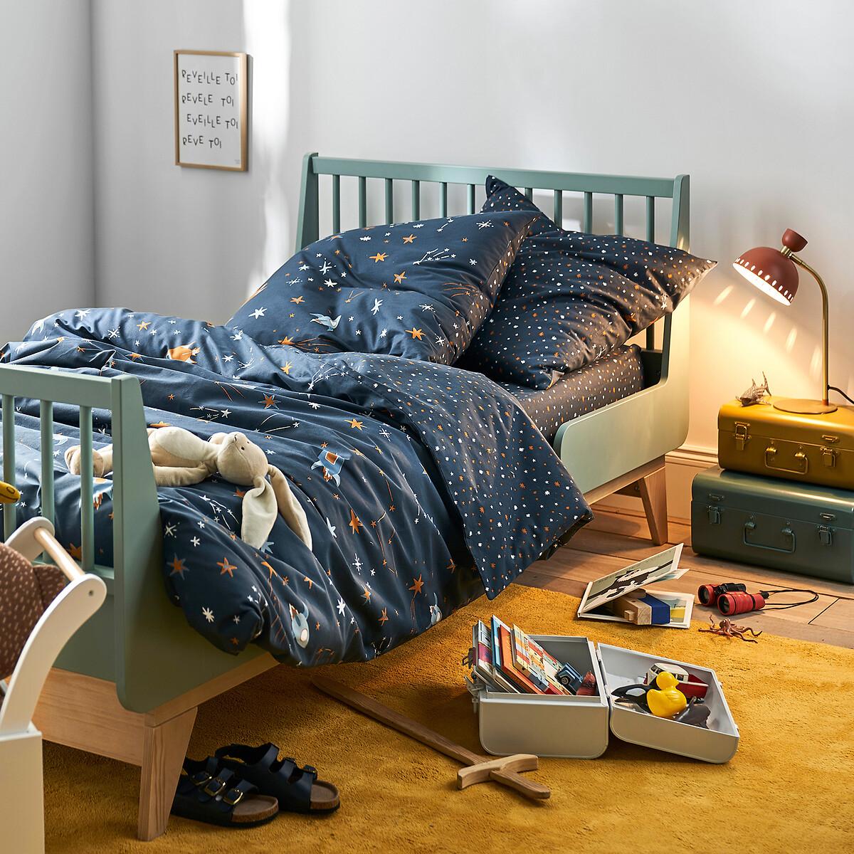 Little ones can dream with their heads amongst the stars with the cosmos-themed Gaston bed linen. A soft cotton set that will delight budding astronauts. Designed by La Redoute Interiors. Cotton is part of our daily lives. We love it for its suppleness and softness. Easy Care, it is ideal for the beds of young and old alike!Product Details • 100% cotton • 144 thread count • Front rockets and stars print, back small stars. Change up your bedding look for each season by mixing and matching this range with plain items from our Scenario bedding collection. Care Advice • Machine washable at 60°C • By washing your laundry at 40°C instead of 60°C, you limit energy consumption. Dimensions • 63 x 63cm: Square pillowcase • 50 x 70cm: Rectangular pillowcase • OEKO-TEX® Standard 100. Standard 100 certification by OEKO-TEX® tests textile products for harmful substances via an independent, international label.