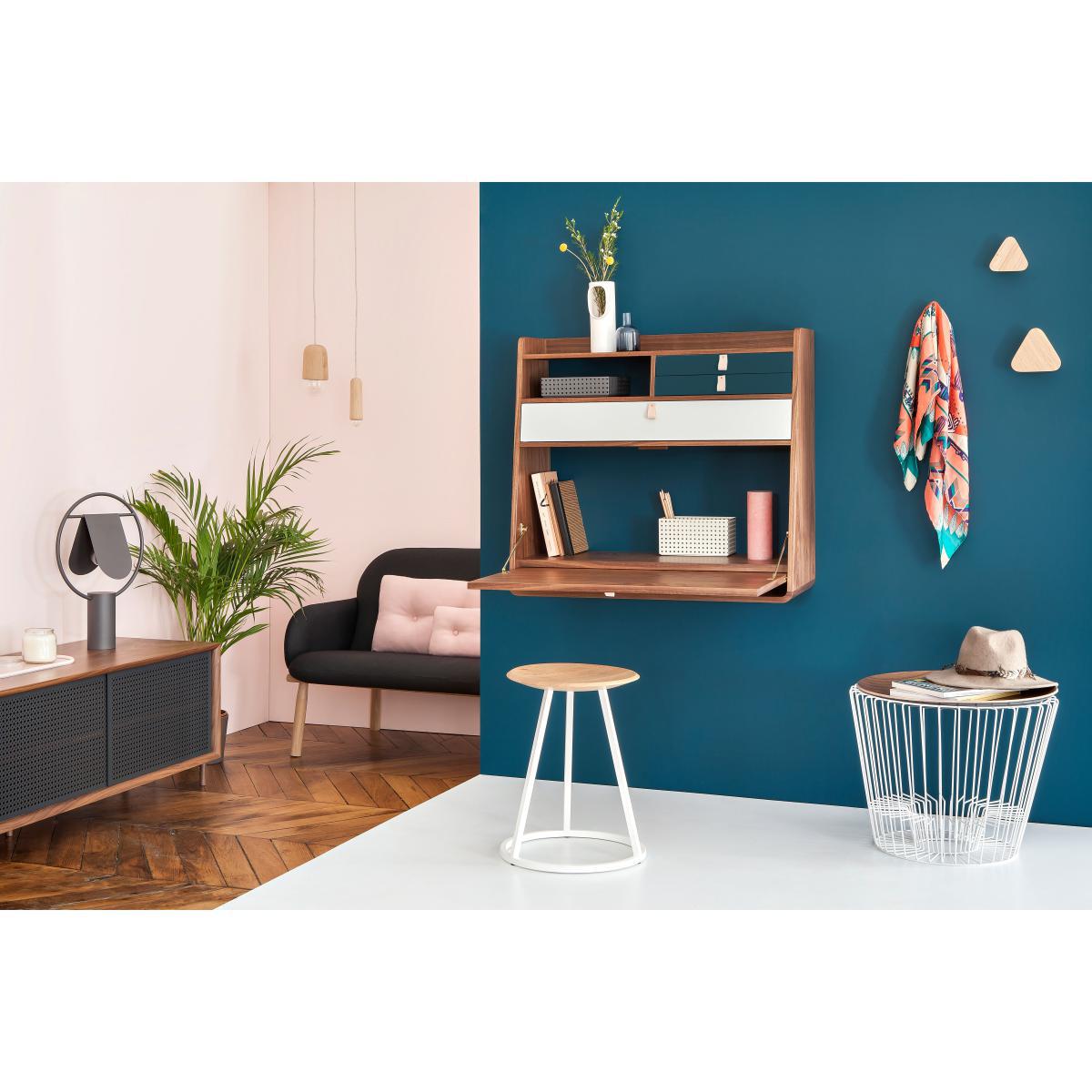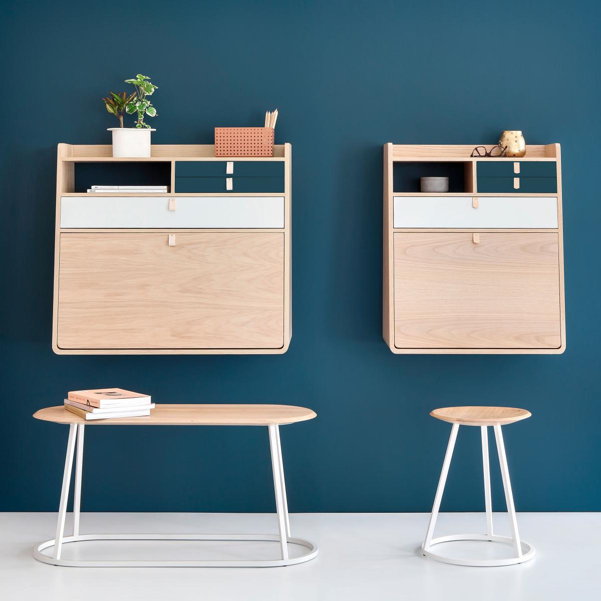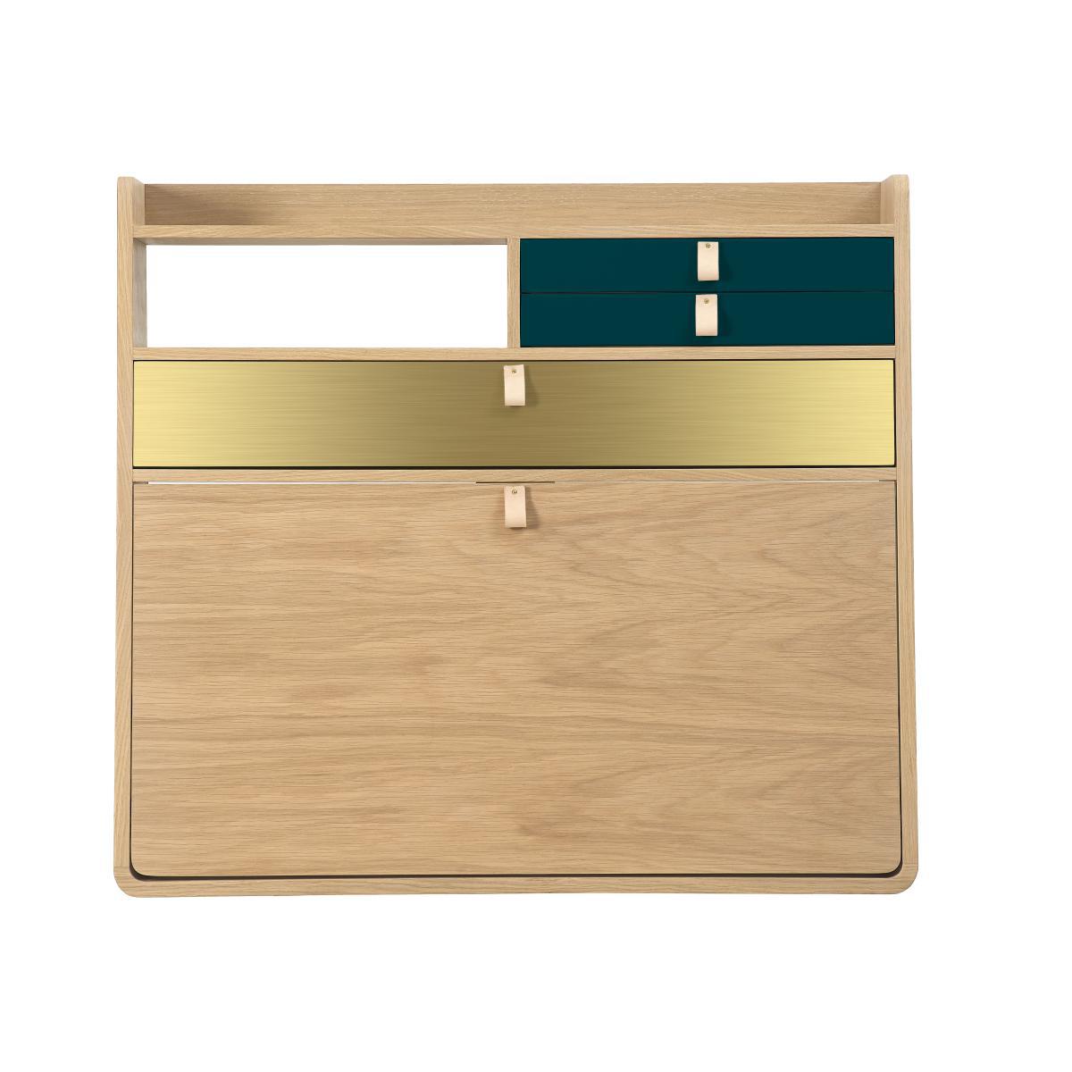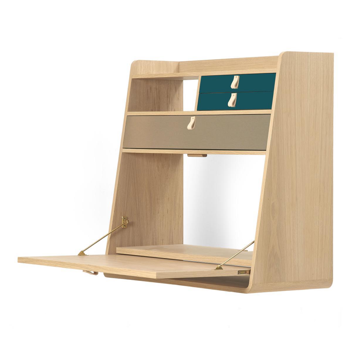 This wall-mounted writing desk is a space saving solution ideal for small rooms. Joyful and colourful, Gaston combines natural wood with a superb pallet of bright and cheerful colours. Very elegant, the handles are in natural leather. Gaston doesn't use any floor space and knows how to be discreet! When closed, it measures only: L 80 x Depth 37 cm x H 72 cm. When you open the folding door, you will gain a functional working space, perfect for your computer, or for writing. Once it is closed, the mess is hidden! The compartment and drawers enable you to store and organise your accessories. Gaston is an ideal desk for small rooms. It enables a working space to be located in a living room and can also be used as a console in an entrance or a dressing table in a bedroom.
