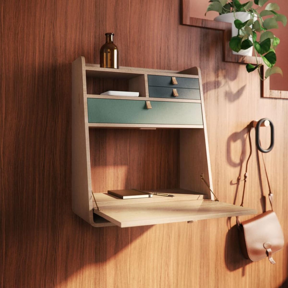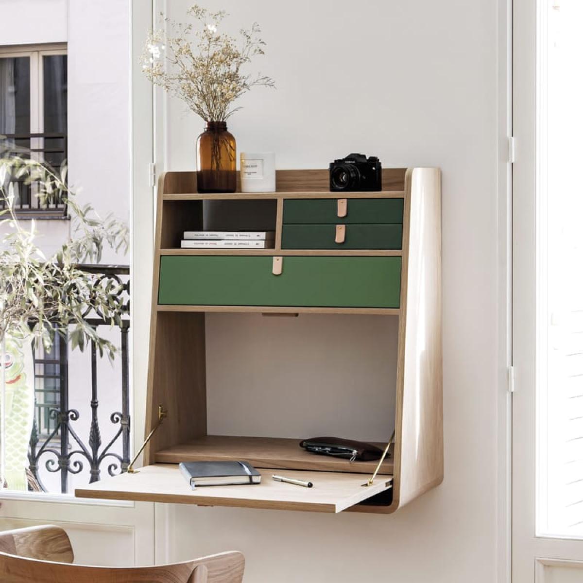 This Wall writing desk is the ideal space-saving solution for small spaces... Cheerful and colorful, Gaston blends natural wood with a superb palette of bright, cheerful hues. The elegant handles are in Natural leather.