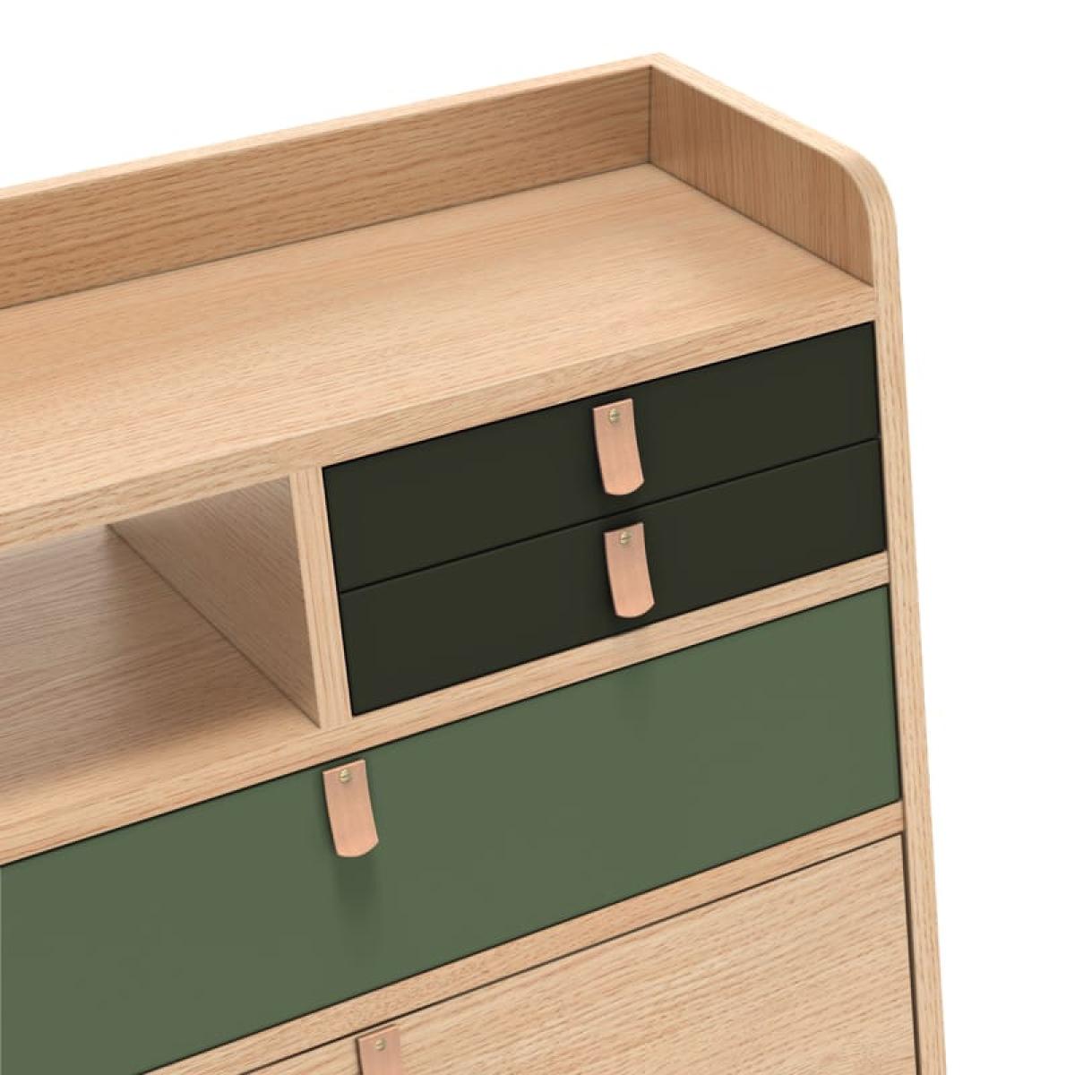 I love this little desk for its seamless blend of functionality and design. Its compact size makes it ideal for a variety of interiors, from small home offices to modern living rooms with flexible workspace needs. The combination of oak with the muted green accents adds a touch of warmth and colour without overwhelming a space. Styling tips include pairing it with minimalist shelves and a simple chair to keep the look clean, or adding a vintage desk lamp and some accessories for a personalised touch. Its natural wood finish also works well in Scandi, contemporary, or even eclectic interiors, easily grounding a variety of colour schemes while providing practicality for daily use.