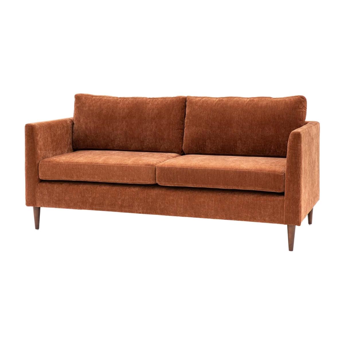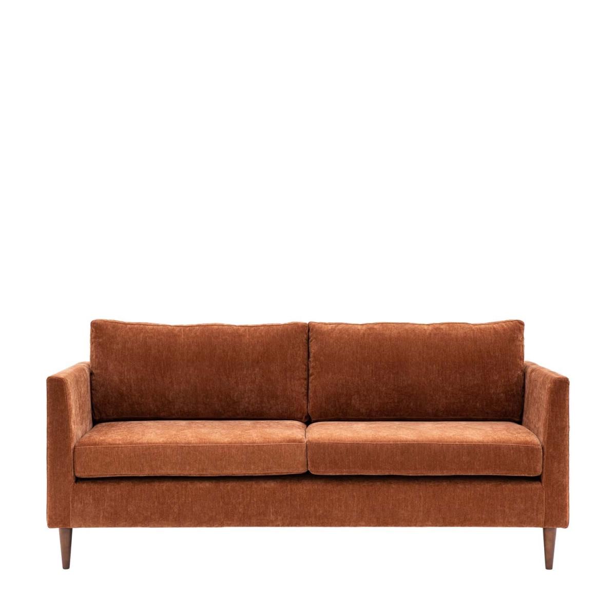 The Gateside contemporary sofa offers a simple style which would suit a wide range of interiors. Upholstered in a beautiful rust coloured fabric with deep seat and back cushions for comfort, the turned wooden legs echo the shape of the gently tapered arms in a lovely design detail.
