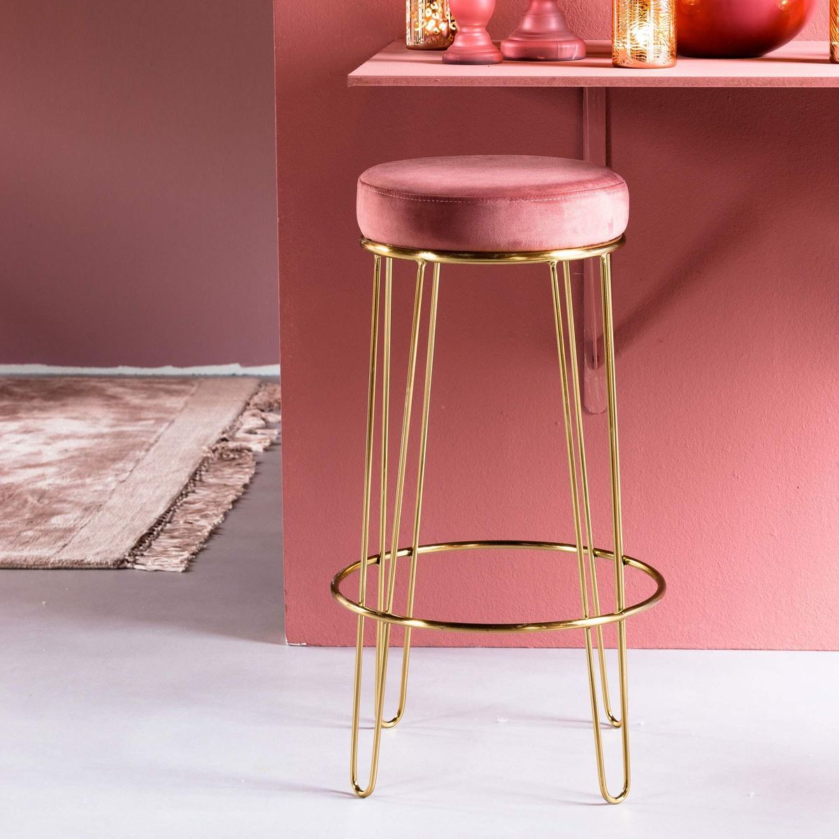 A stylish bar stool featuring golden hairpin legs and a luxurious pink velvet upholstered seat. Perfect for adding some Gatsby glamour to your kitchen island or breakfast bar.