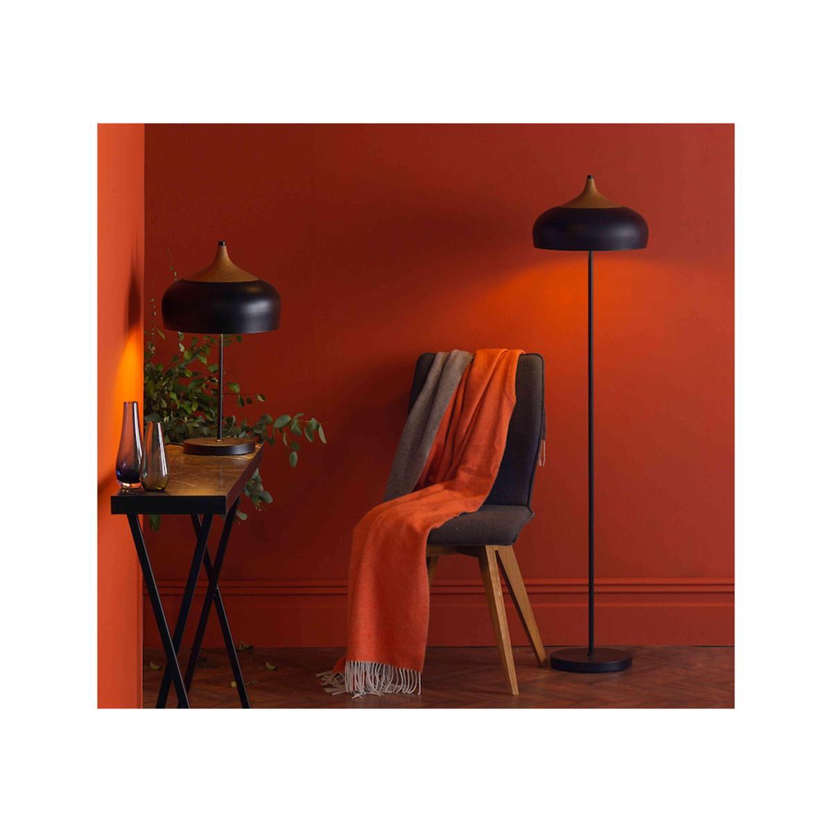 Sleek and sophisticated, this elegant floor lamp is the perfect addition to a cosy reading corner or contemporary bedroom. Finished in matt black with real wood detailing with two bulb holders for extra illumination. Why you'll love it. A sophisticated floor lamp with a domed shade and metal stand. Beautifully finished in a matt black with real wood detailing on the shade. The perfect addition to a contemporary living room or bedroom. Its two bulb holders create an extra-bright light. Part of the Gaucho lighting range. Made with care for Furniture Village. What you need to know. Made from matt black metal and wood. Matching pendants and table lamp available. Bulb type: 2 x 60w max ES GLS. Dimensions. Width: 150 cm (60 in). Depth: 34 cm (14 in).