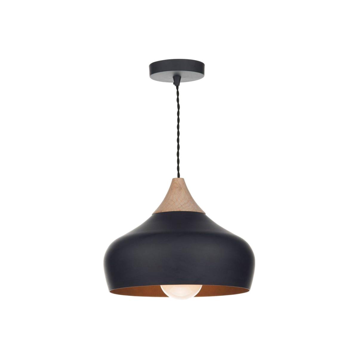 Contemporary pendant ceiling light boasting a black and bronze finish. The Gaucho Pendant Ceiling Light is a stunning fitting from Dar Lighting. Boasting a black finish throughout, the pendant also features wood effect cap detailing at the top of the shade and comes with a twisted braided cable. Perfect for homes with a chic and retro vibe. Pair this light with our 4w LED Vintage bulbs for a rustic and industrial glow to complement the copper detailing.