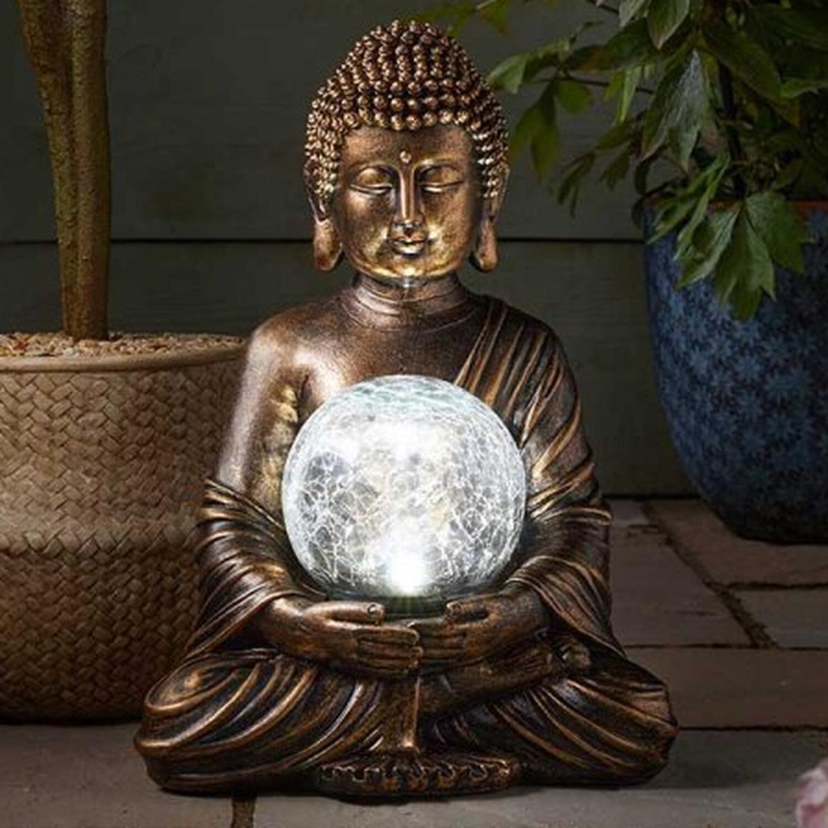 This elegant garden ornament with bring zen to any outdoor space Ideal for patios, lawns and borders Charges in direct sunlight Gazing Solar Buddha - Bronze