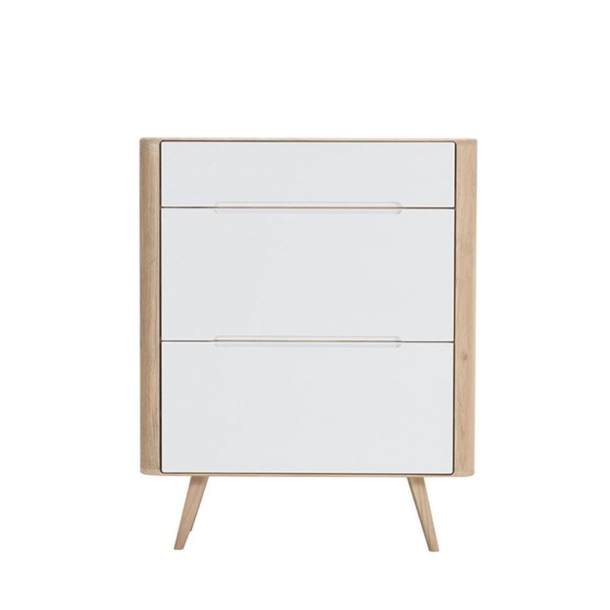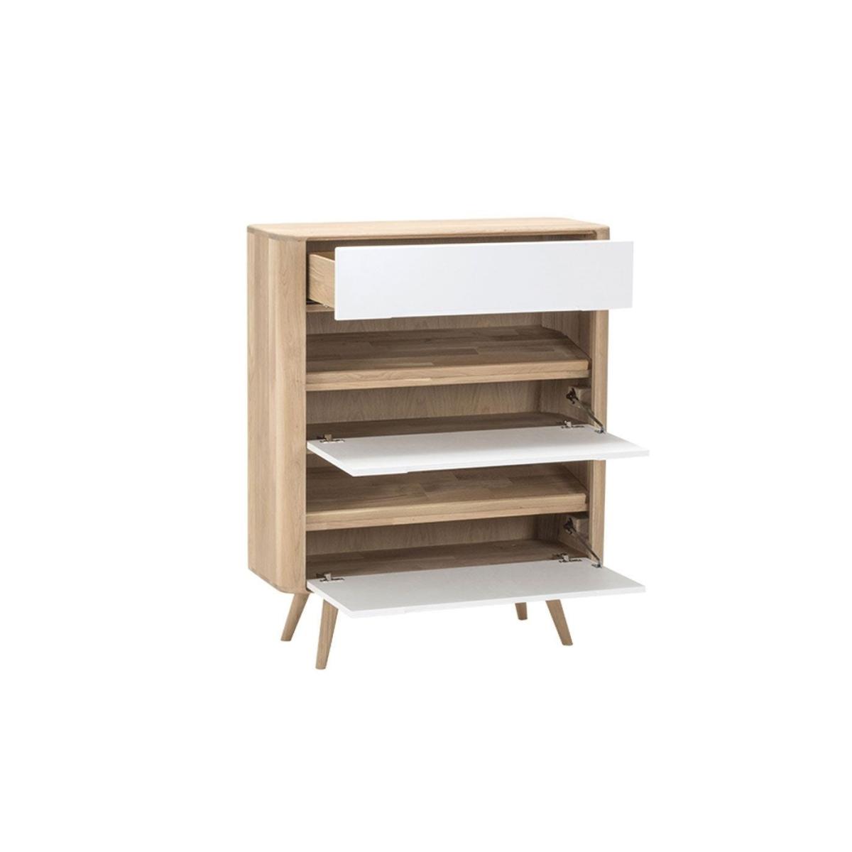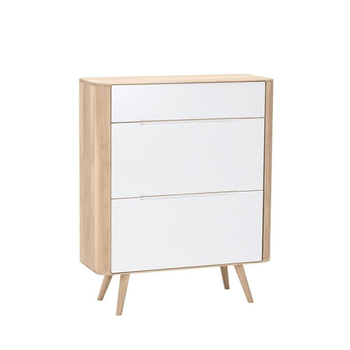 I love this shoe cabinet for its sleek, Scandinavian-inspired design, which makes it a versatile addition to many interiors. Its natural oak frame combined with white drawers creates a fresh, modern look that works particularly well in minimalist, contemporary, or even retro-inspired hallways. Practical styling tips include pairing it with a simple mirror or a small bench nearby to create a functional entryway station. Its compact size makes it perfect for smaller spaces, and the concealed storage helps keep clutter out of sight, contributing to a clean, organised look. I recommend placing it against a light wall to highlight its natural wood tones, or integrating it into a layered scheme with textured textiles or greenery for added warmth.
