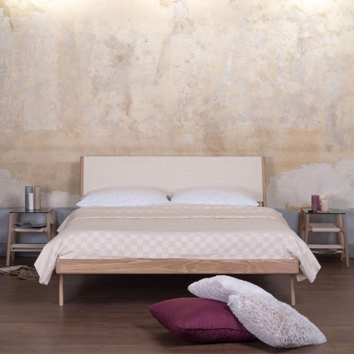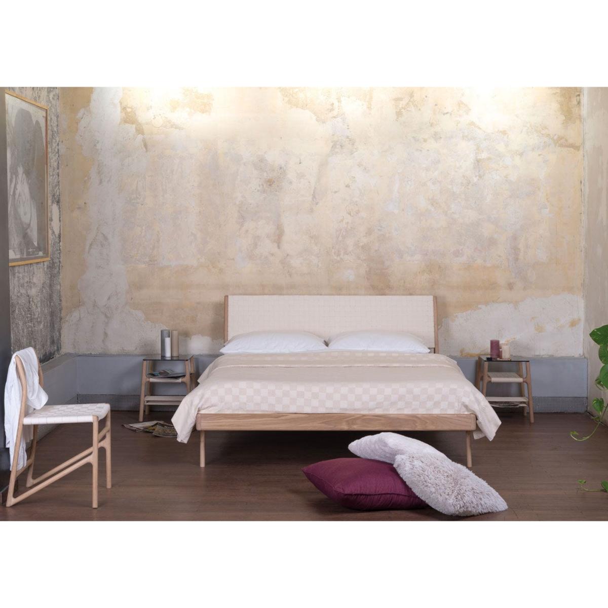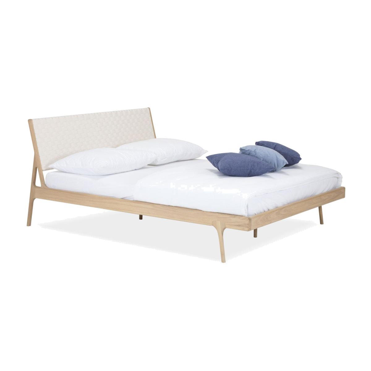 At the core of the Fawn range is the combination of beautiful natural materials and modern craftsmanship, as demonstrated by the slender oak frame inspired by the delicate profile of a baby deer. Winner of a Red Dot Design award 2015, these gentle lines have a light and airy feel with the sumptuous curved detailing along each corner set against a chequerboard woven headboard. Sculpted from oak and finished in natural oil, the supple curves of the bed are exquisitely executed providing a dainty looking frame that is extremely robust and hardwearing. Not an angle in sight, the smooth lines and elegant cutaway panels of the splayed back legs demonstrate seamless joinery. Providing a comfortable nights rest, two rows of sprung slats are closely spaced to ensure plentiful support for a range of mattresses. Contrasting the light, slender feel of the oak is a geometric patterned headboard woven around the tall poles of the frames back from durable yet flexible fabric strips.
